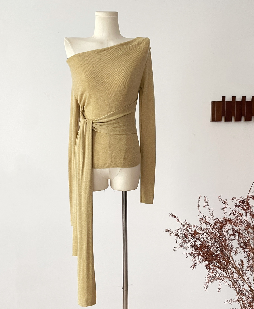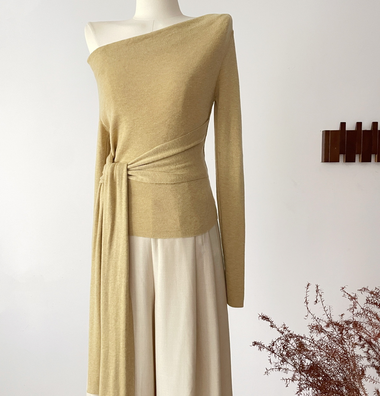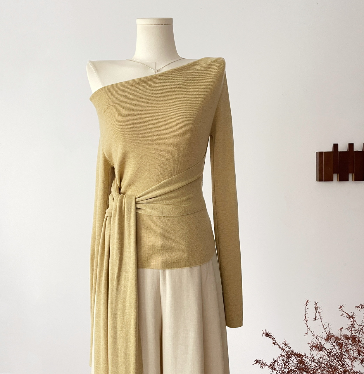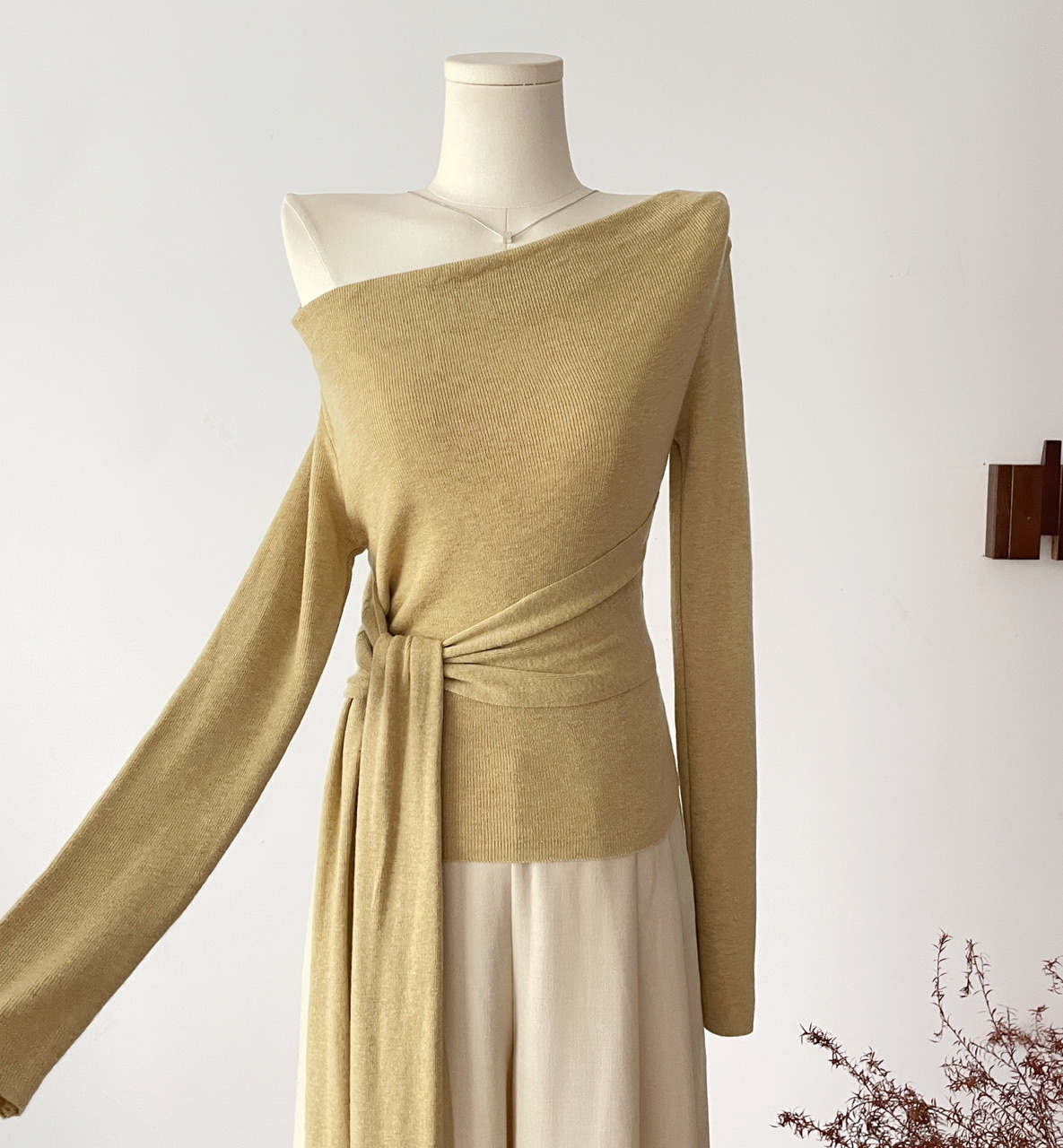 SHIYUEQI春季法式气质不规则斜肩荡领长袖针织绑带收腰上衣女