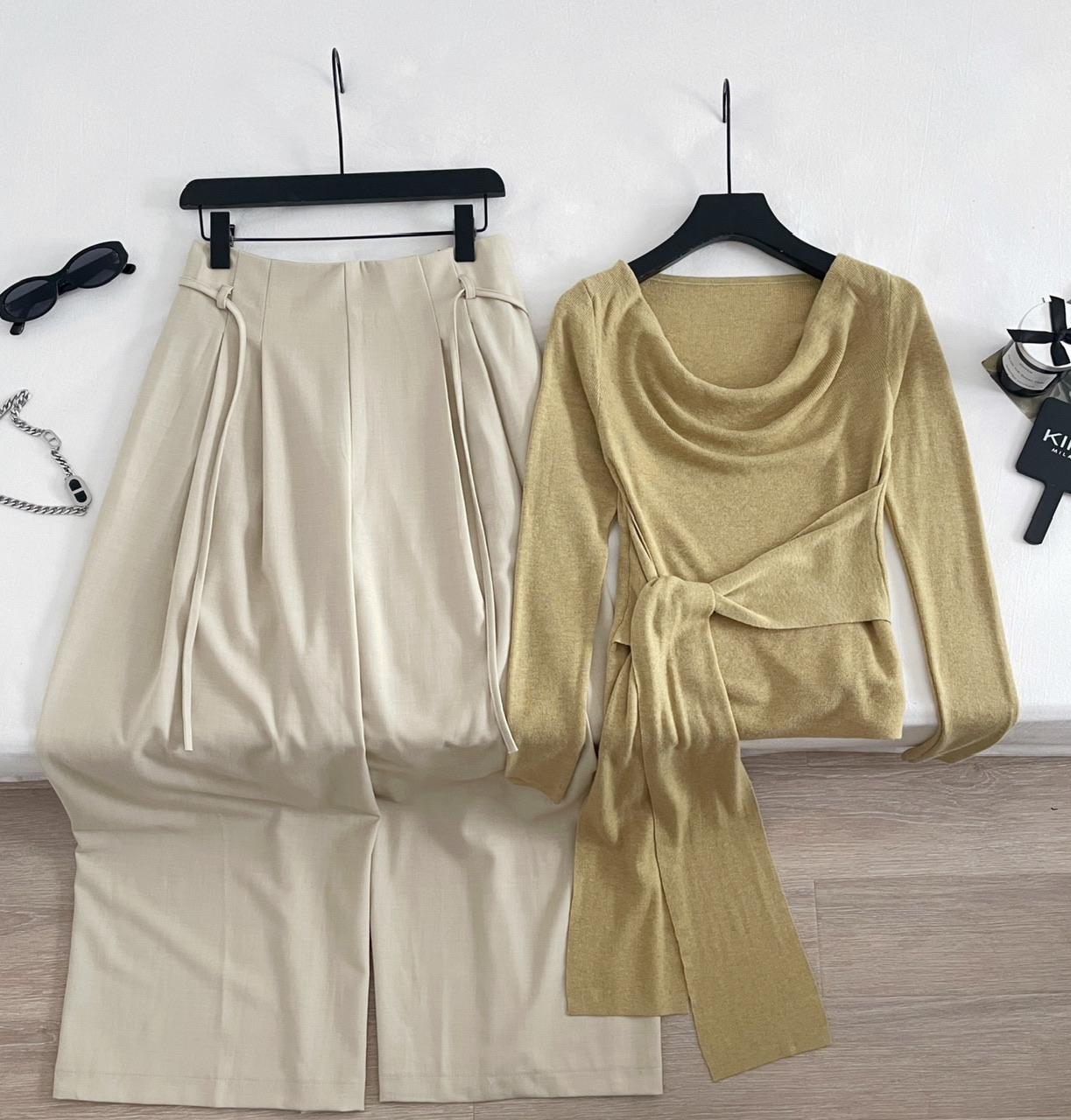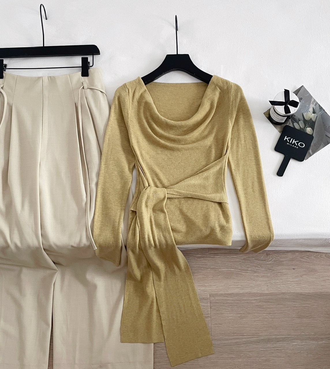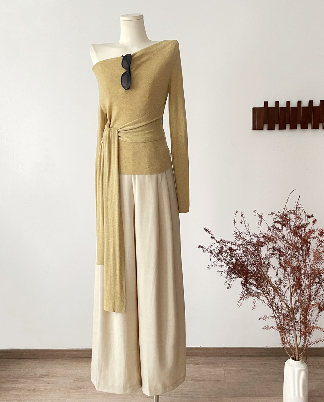 SHIYUEQI春季法式气质不规则斜肩荡领长袖针织绑带收腰上衣女