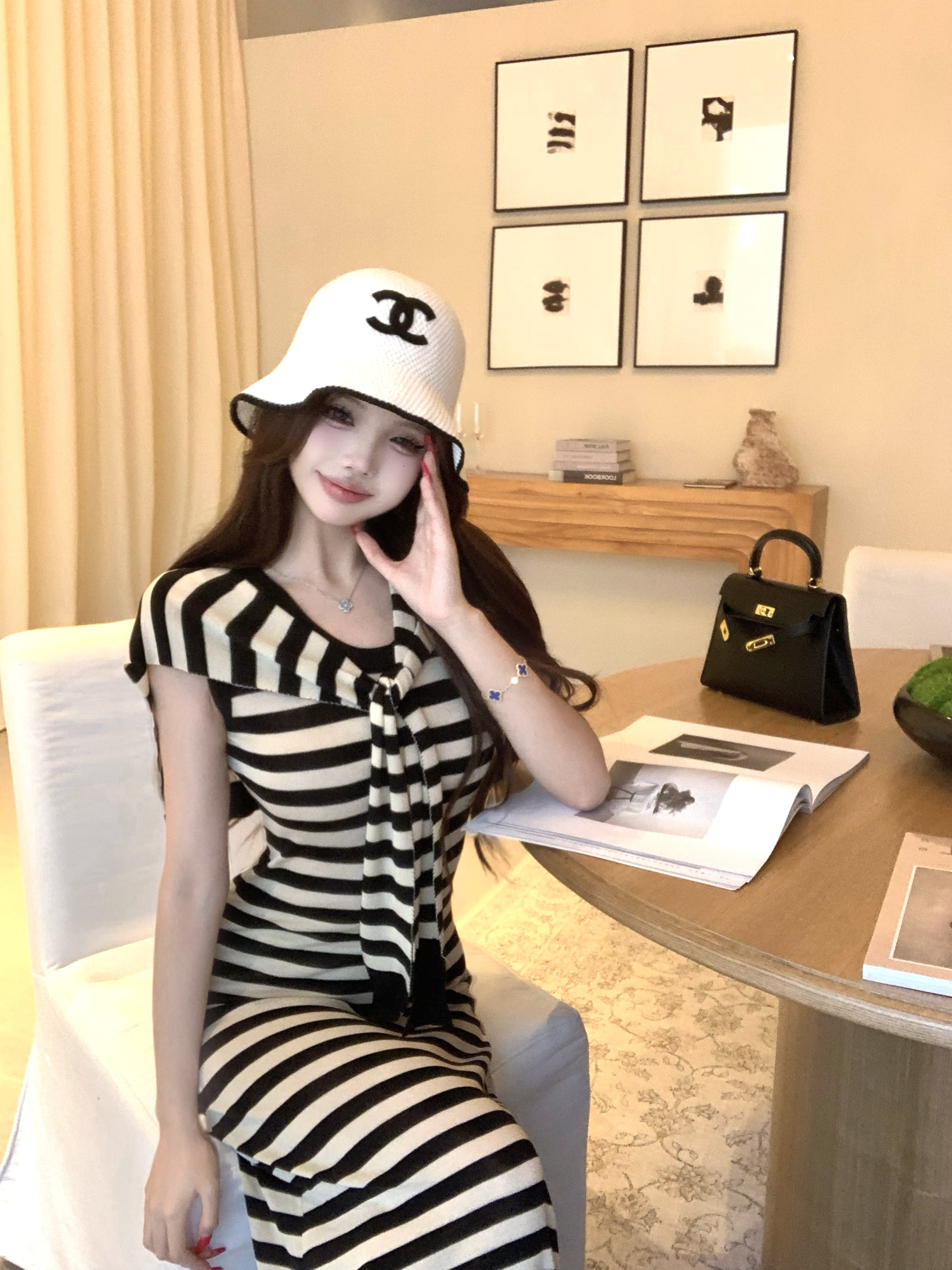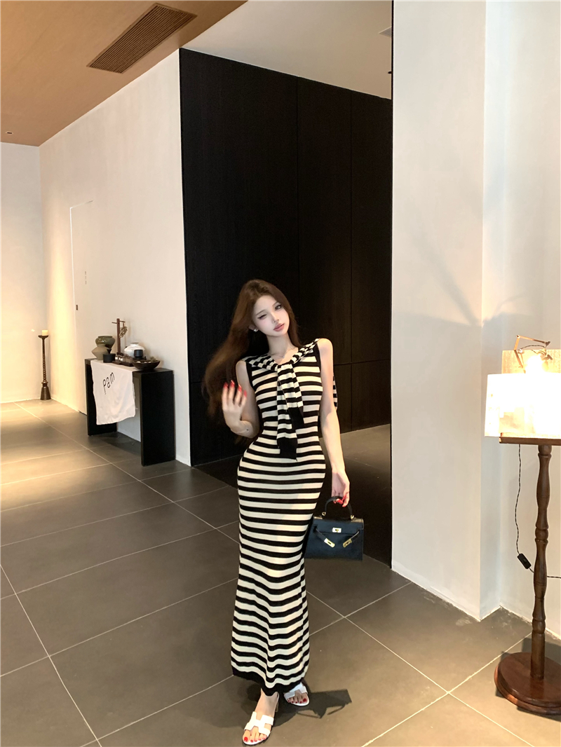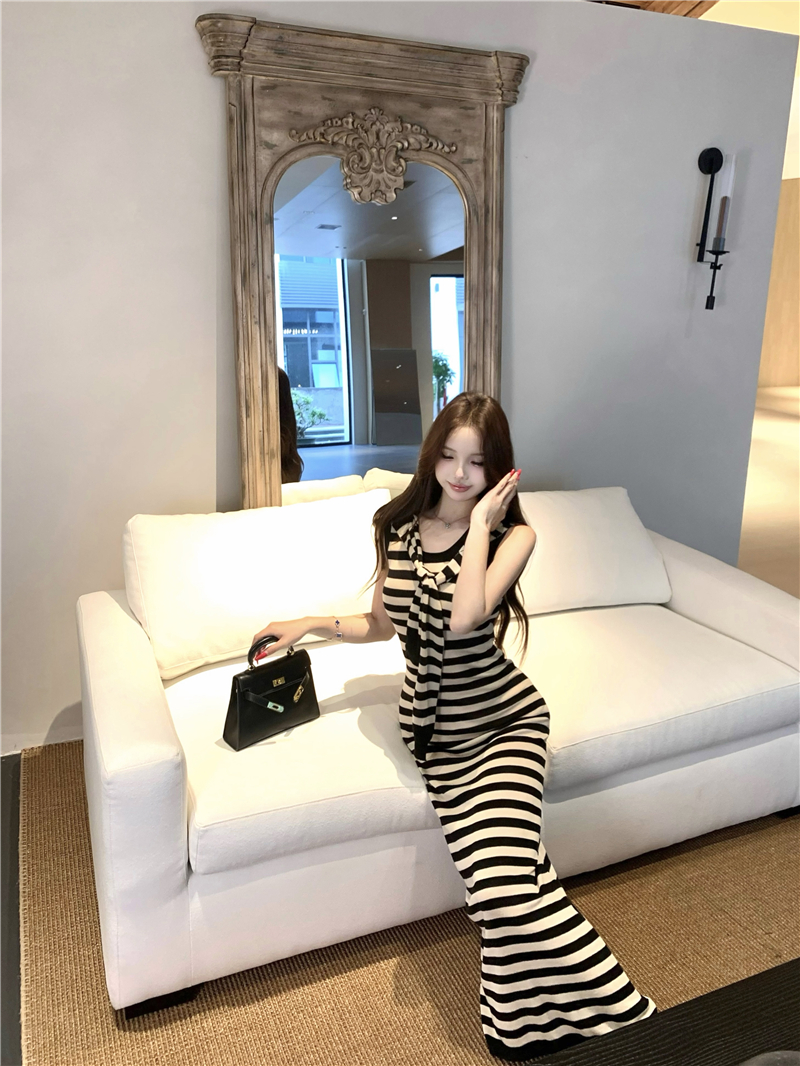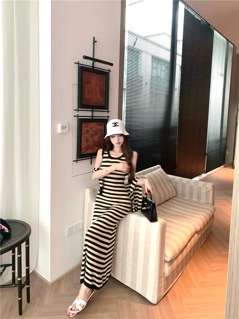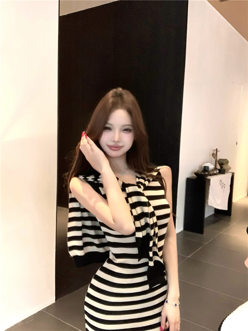 实拍 高级感穿搭时尚显瘦气质条纹设计感披肩长裙