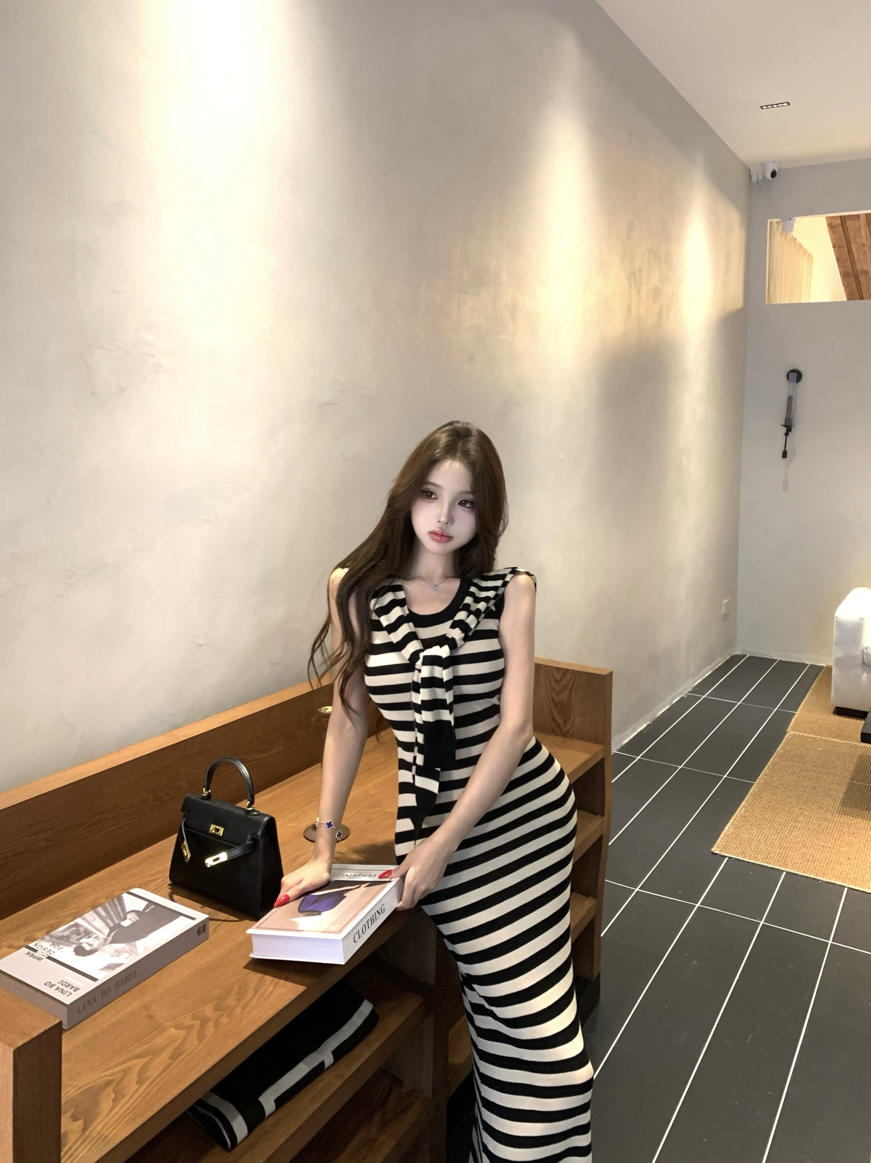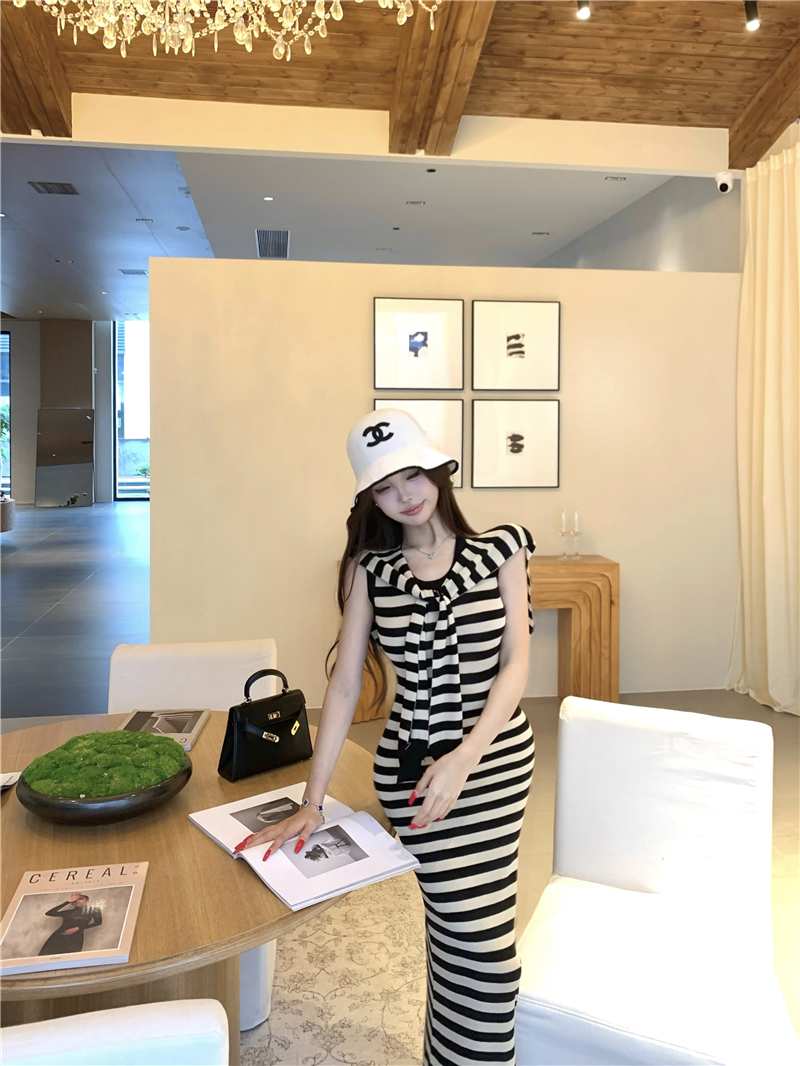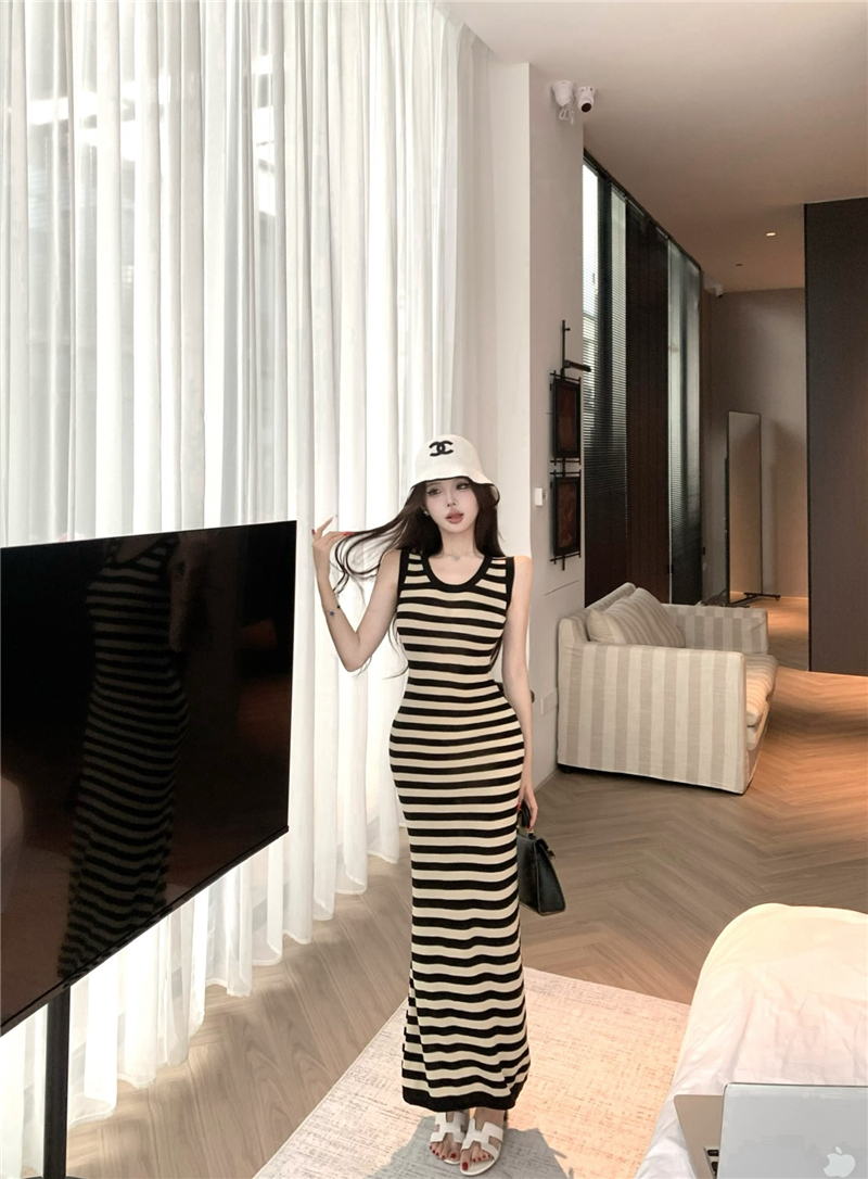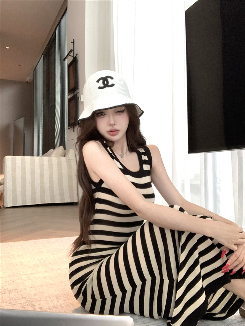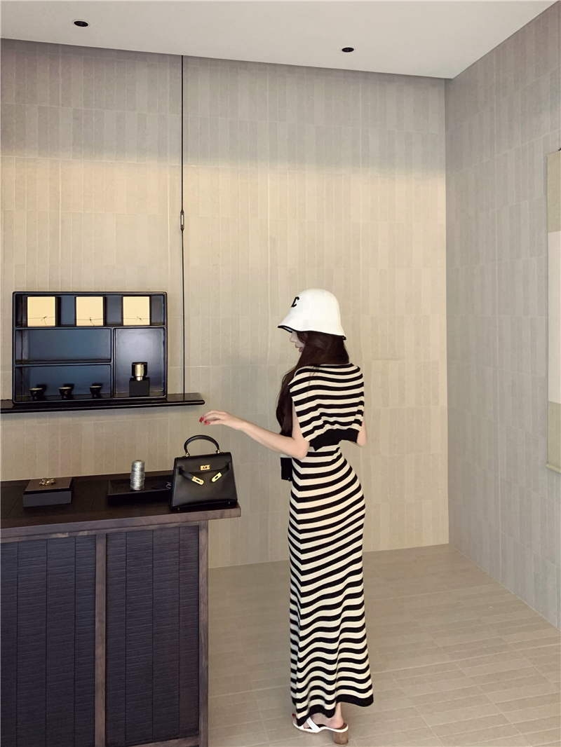 实拍 高级感穿搭时尚显瘦气质条纹设计感披肩长裙