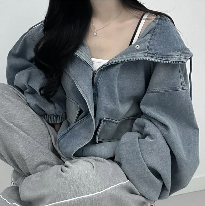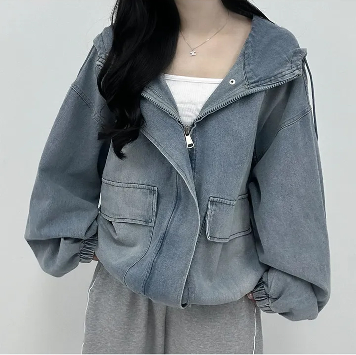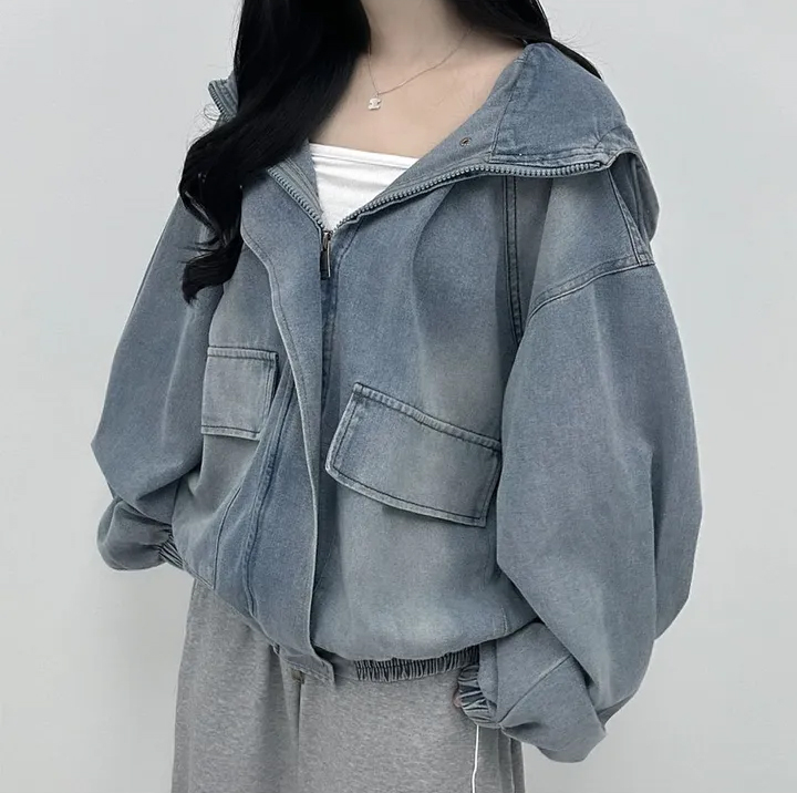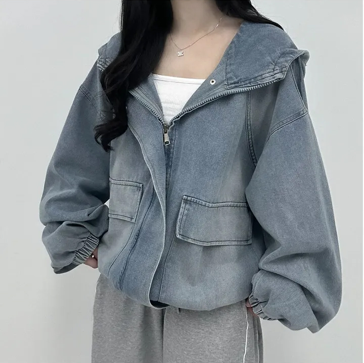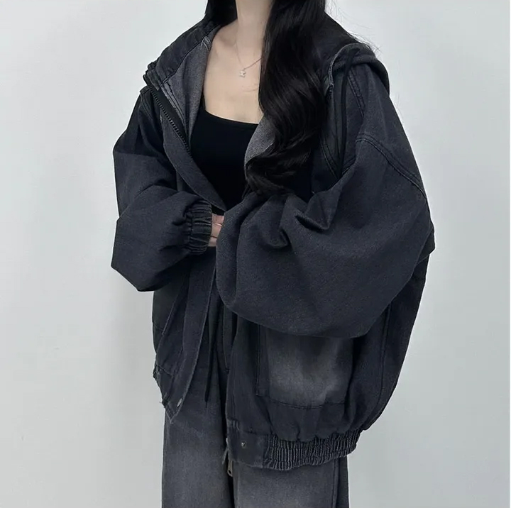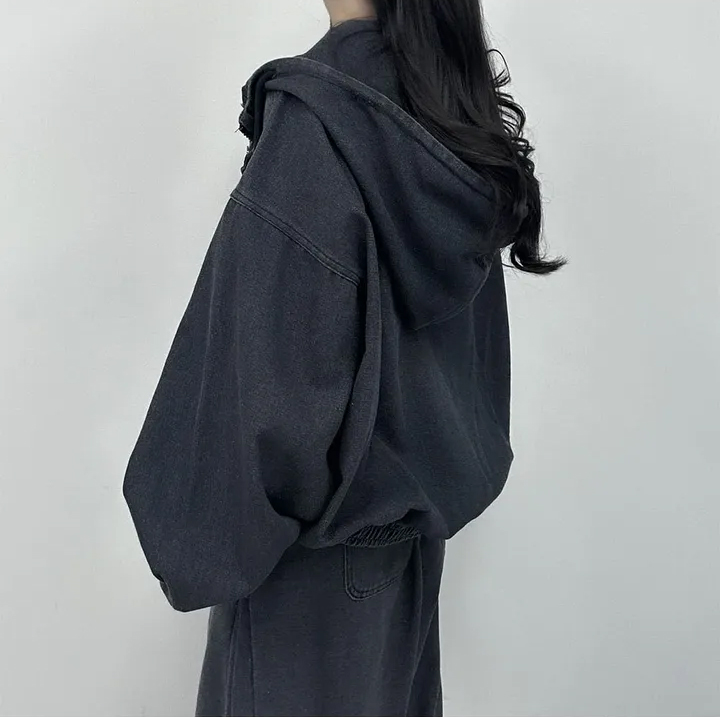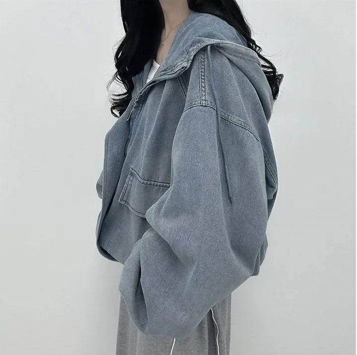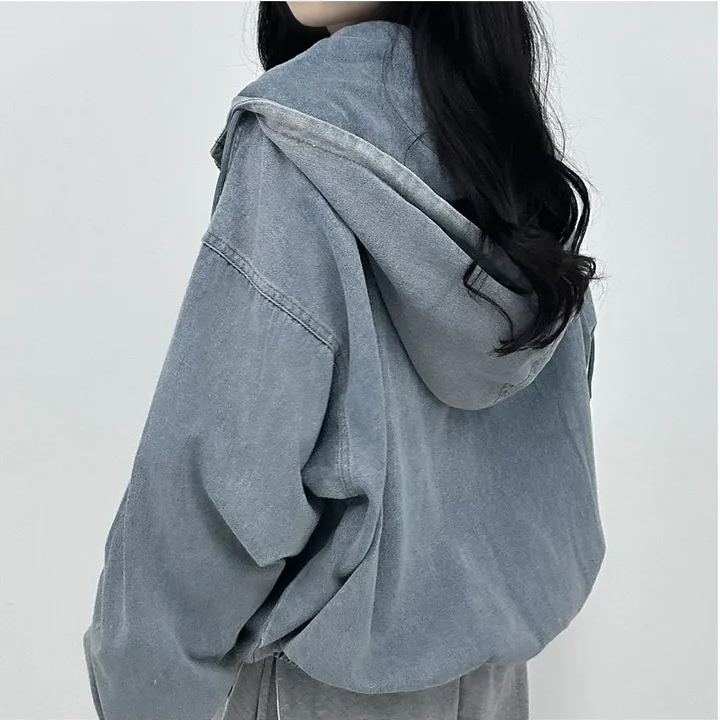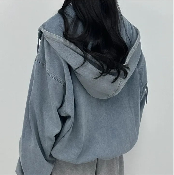 洗做旧连帽中长款牛仔卫衣外套女设计感百搭连帽外穿上衣女