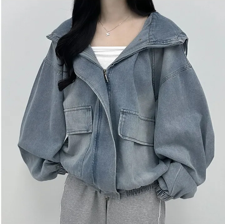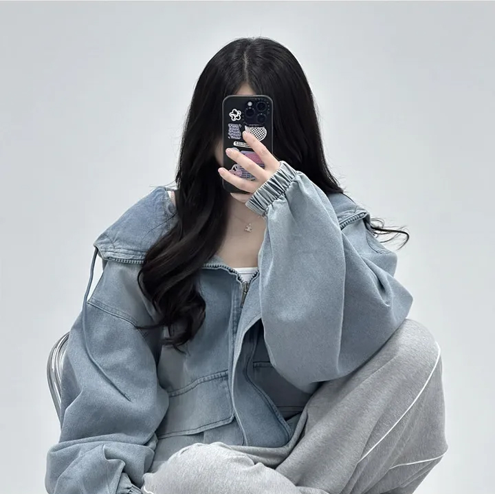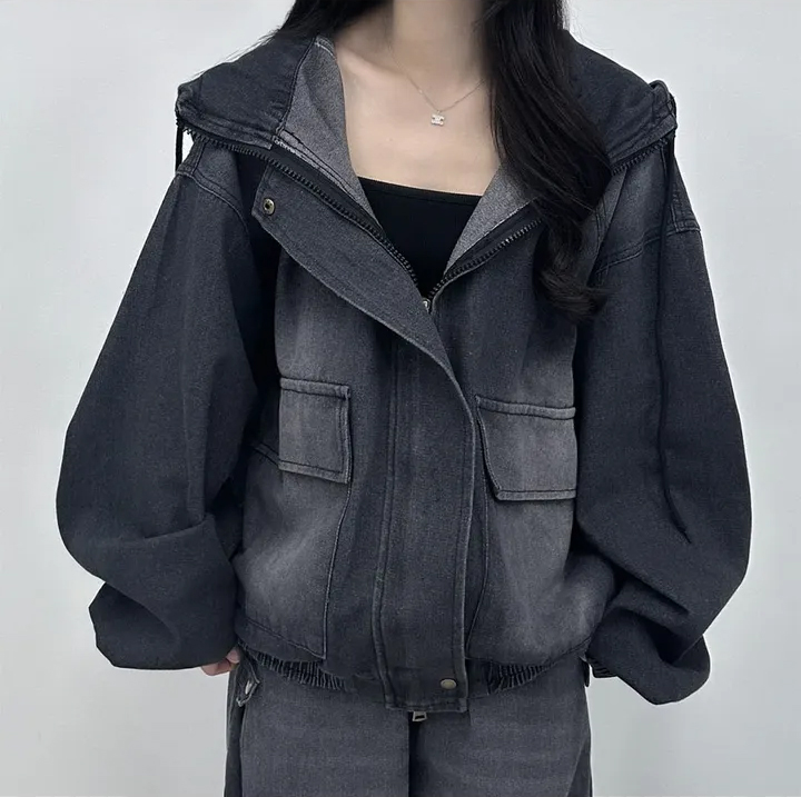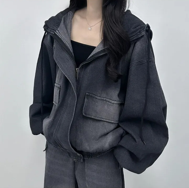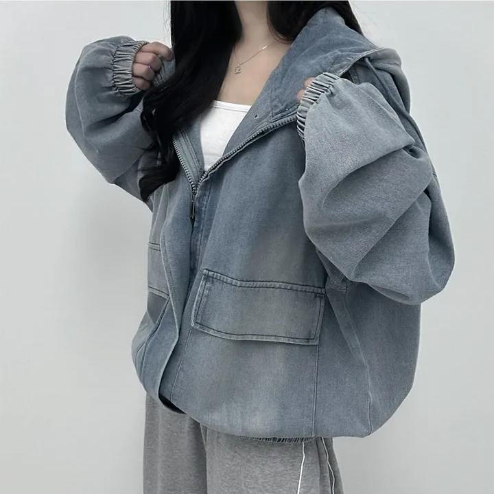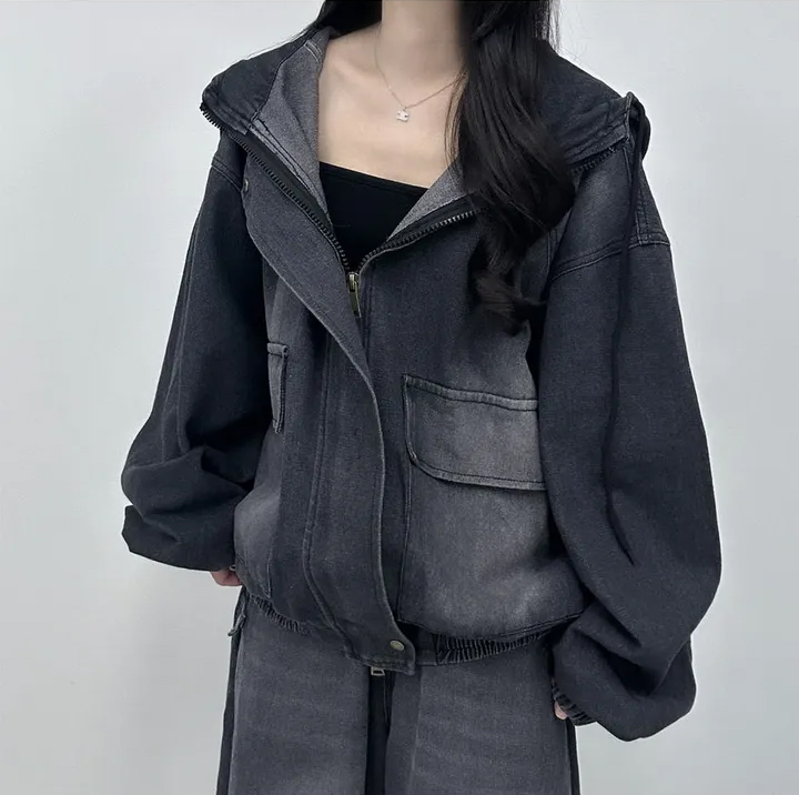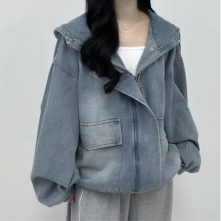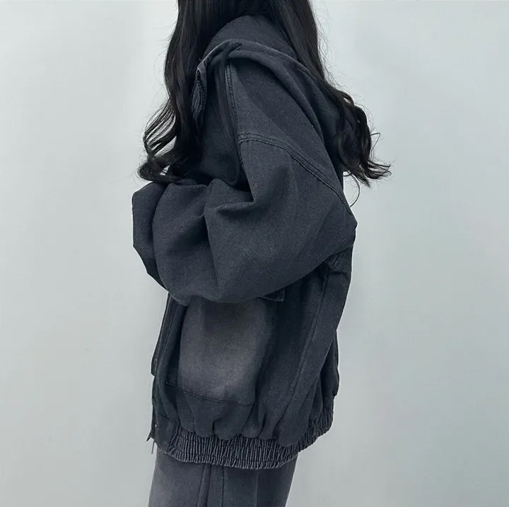 洗做旧连帽中长款牛仔卫衣外套女设计感百搭连帽外穿上衣女