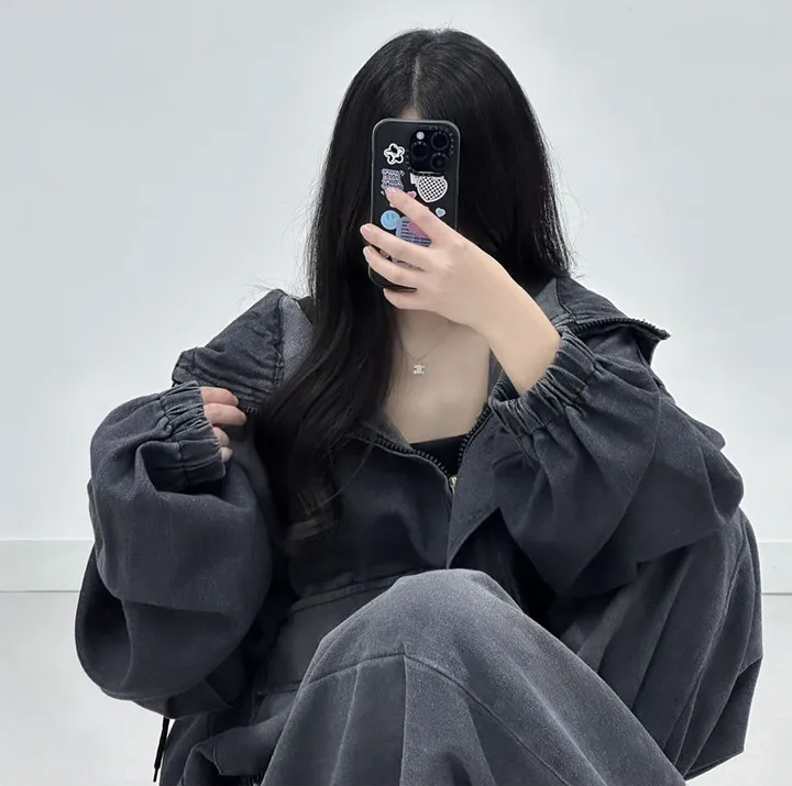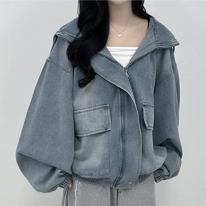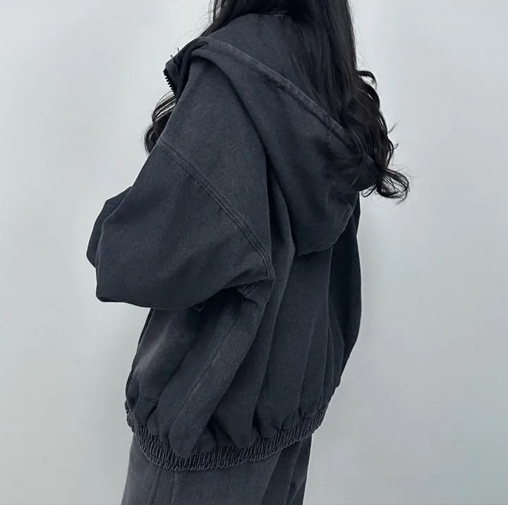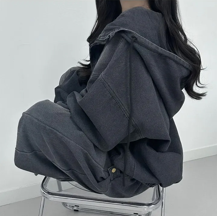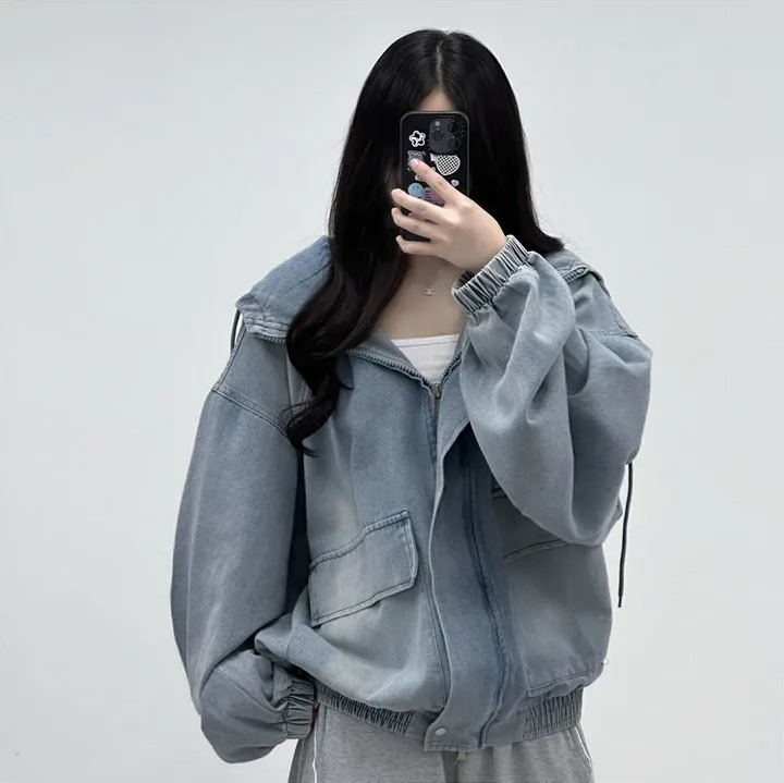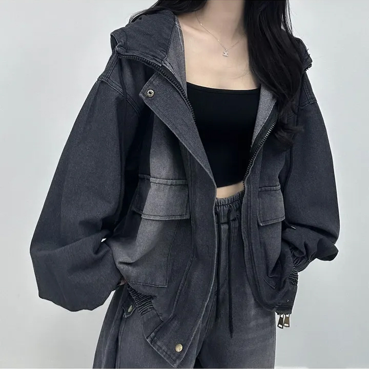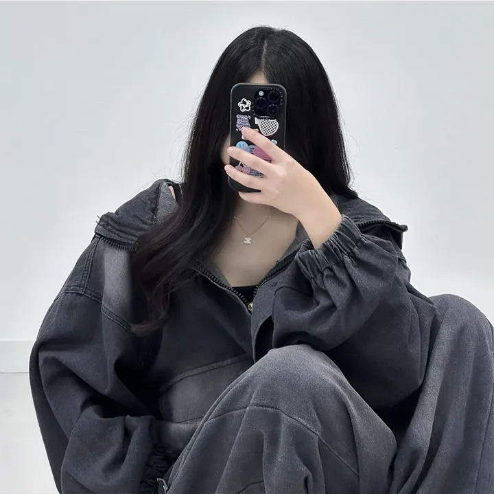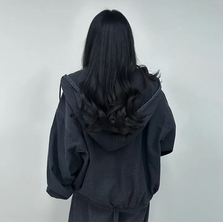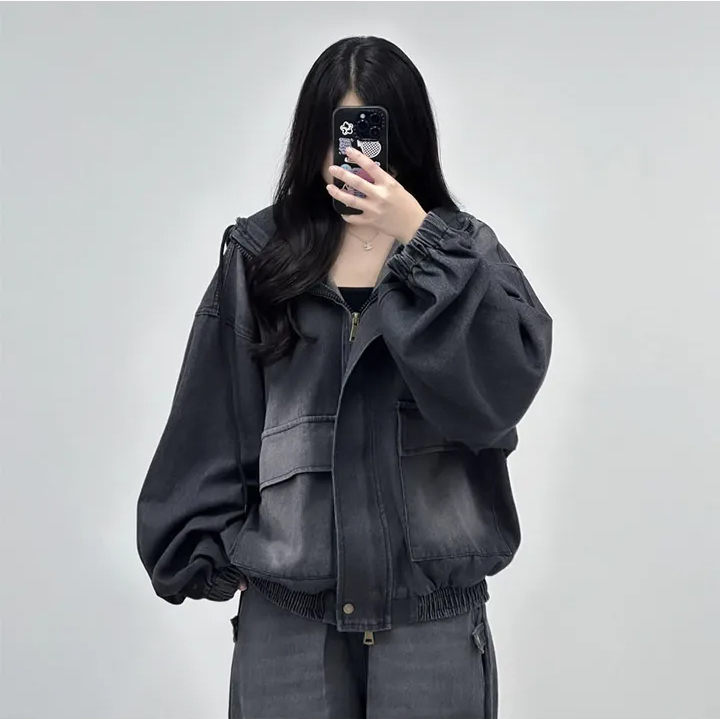 洗做旧连帽中长款牛仔卫衣外套女设计感百搭连帽外穿上衣女