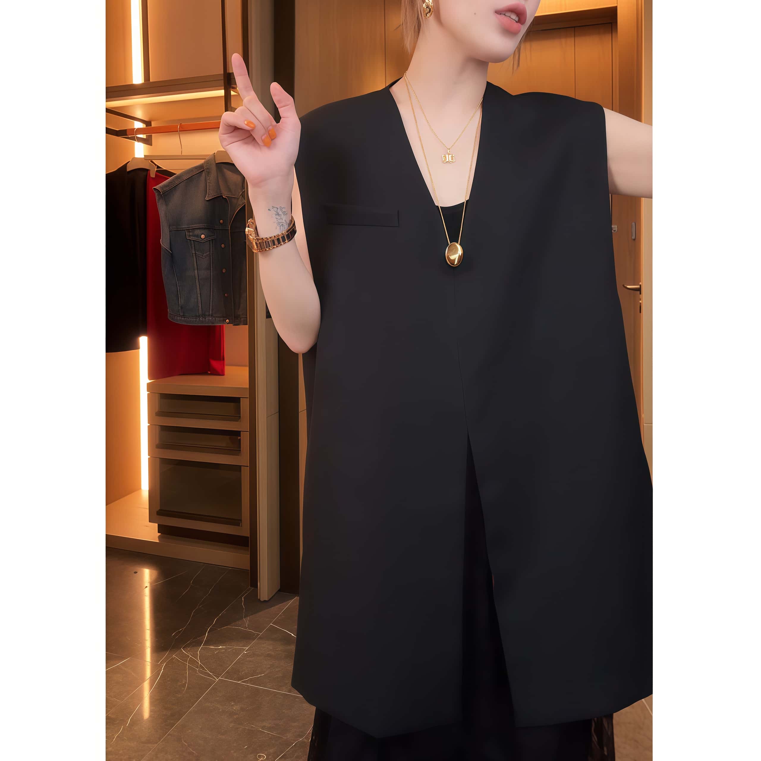 中长款无袖马甲女士秋季新款v领设计感薄款上衣时尚宽松减龄小衫