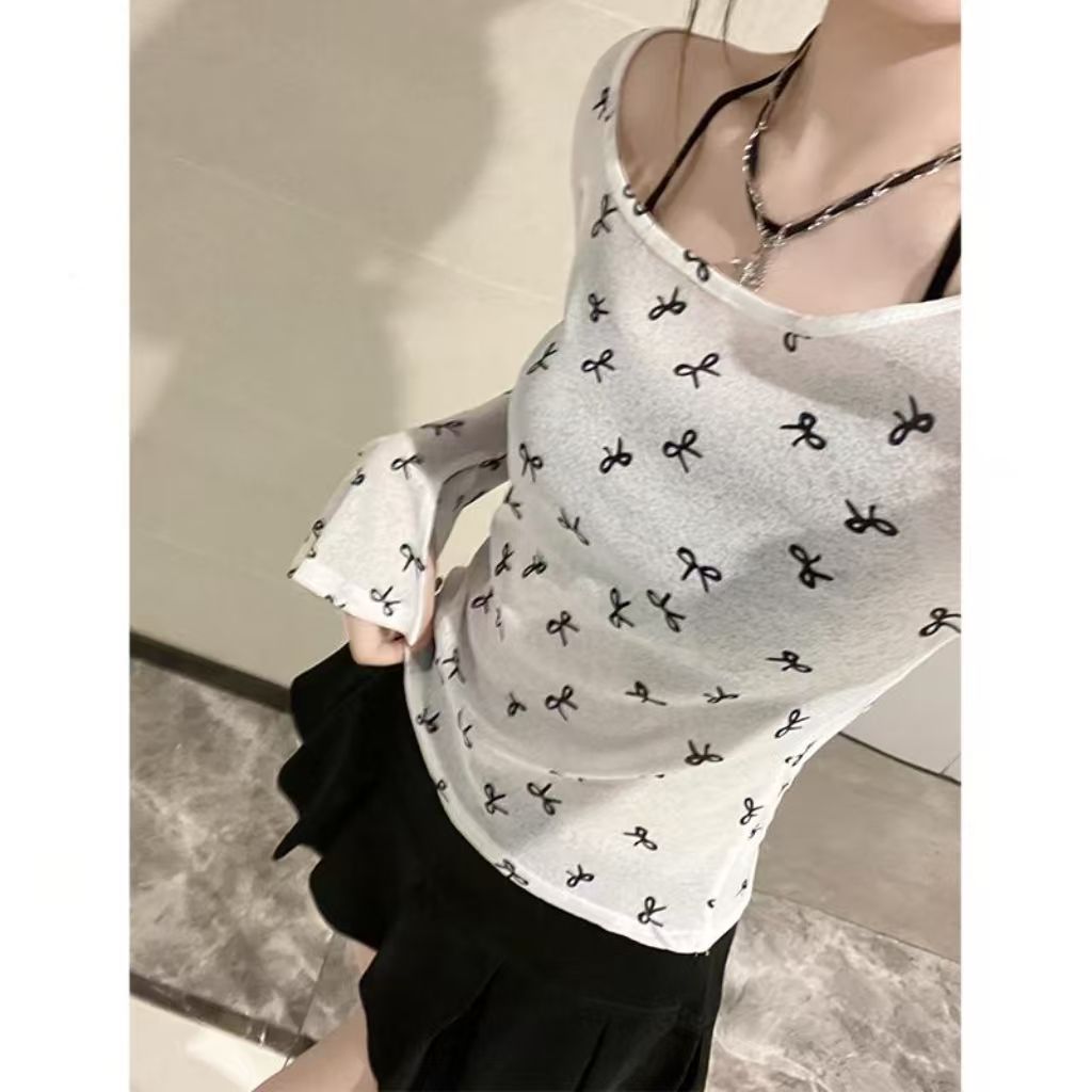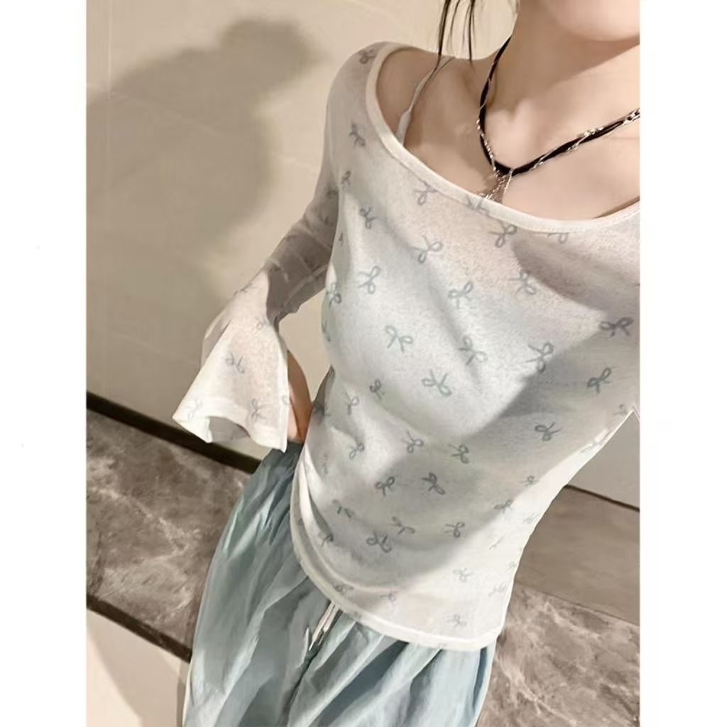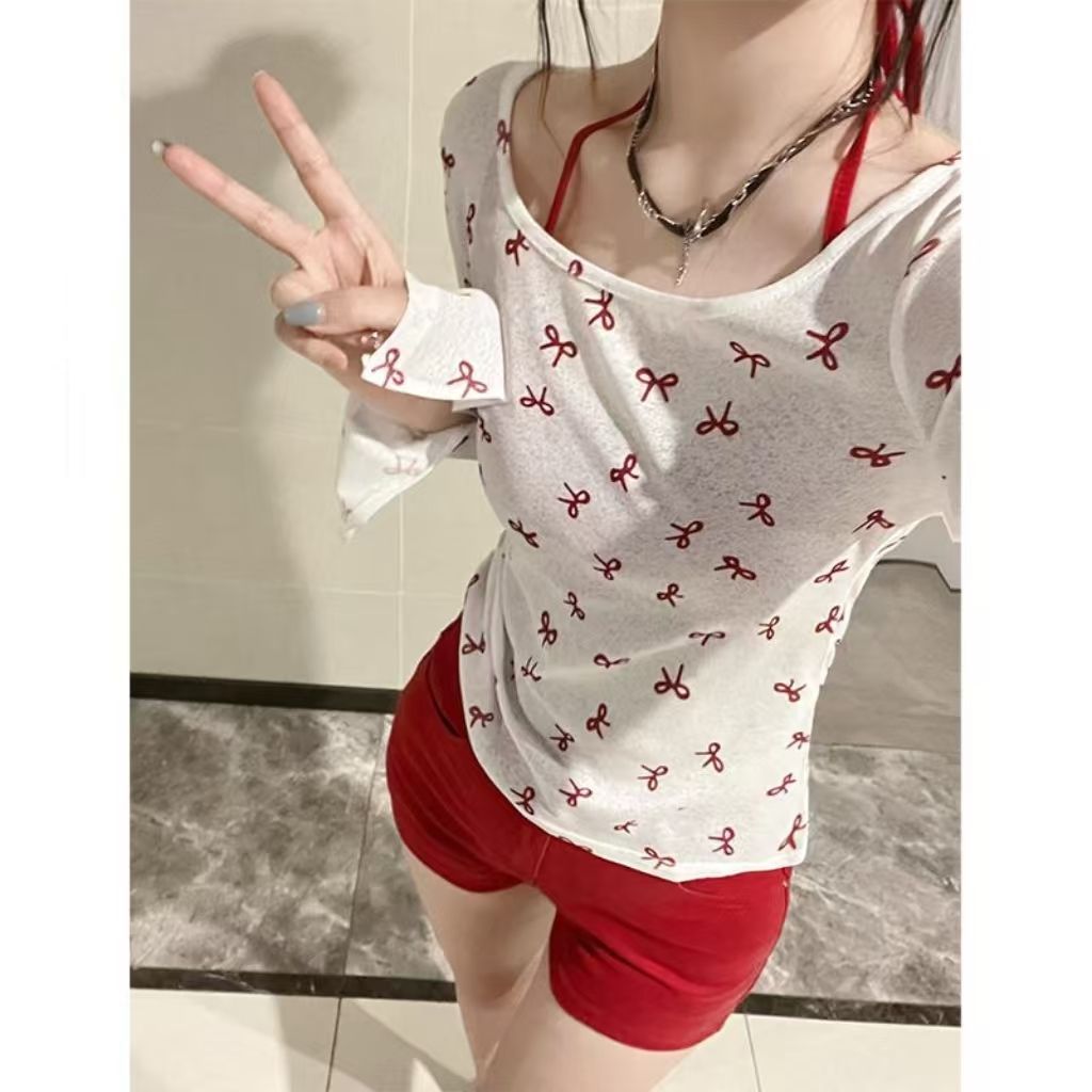 纯欲U领T恤女夏季新款辣妹薄款喇叭袖修身显瘦时尚蝴蝶结微透罩衫