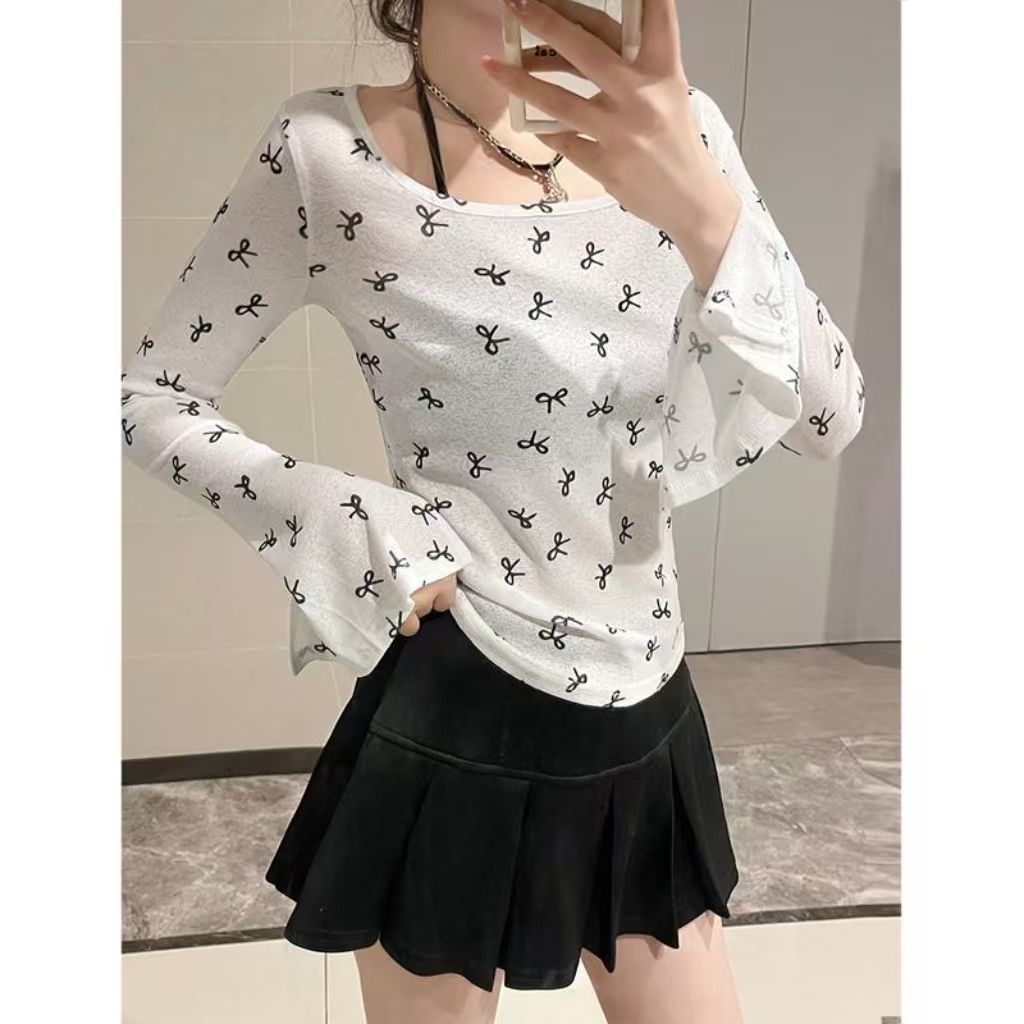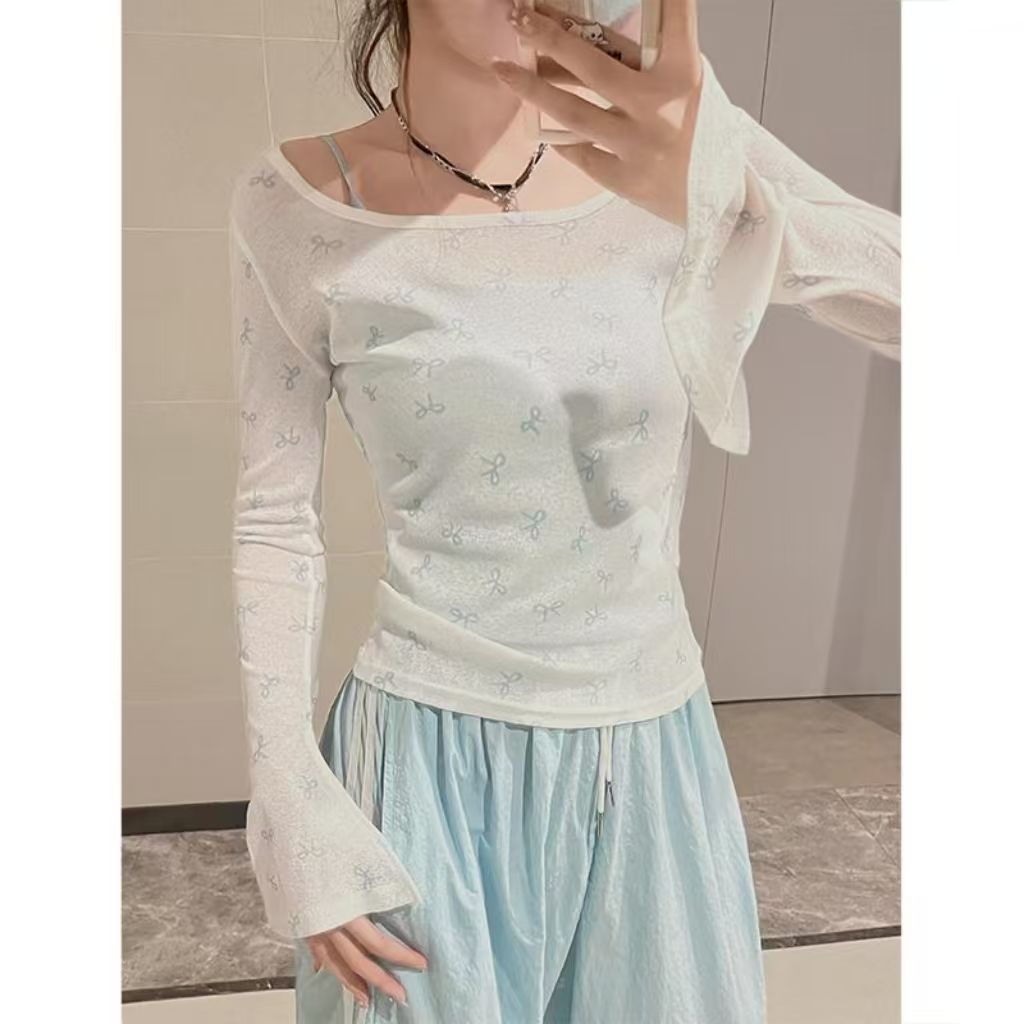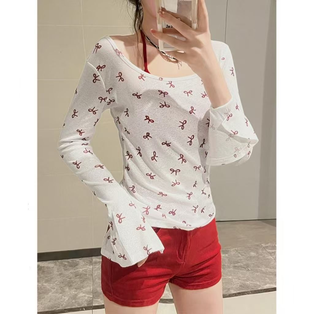 纯欲U领T恤女夏季新款辣妹薄款喇叭袖修身显瘦时尚蝴蝶结微透罩衫