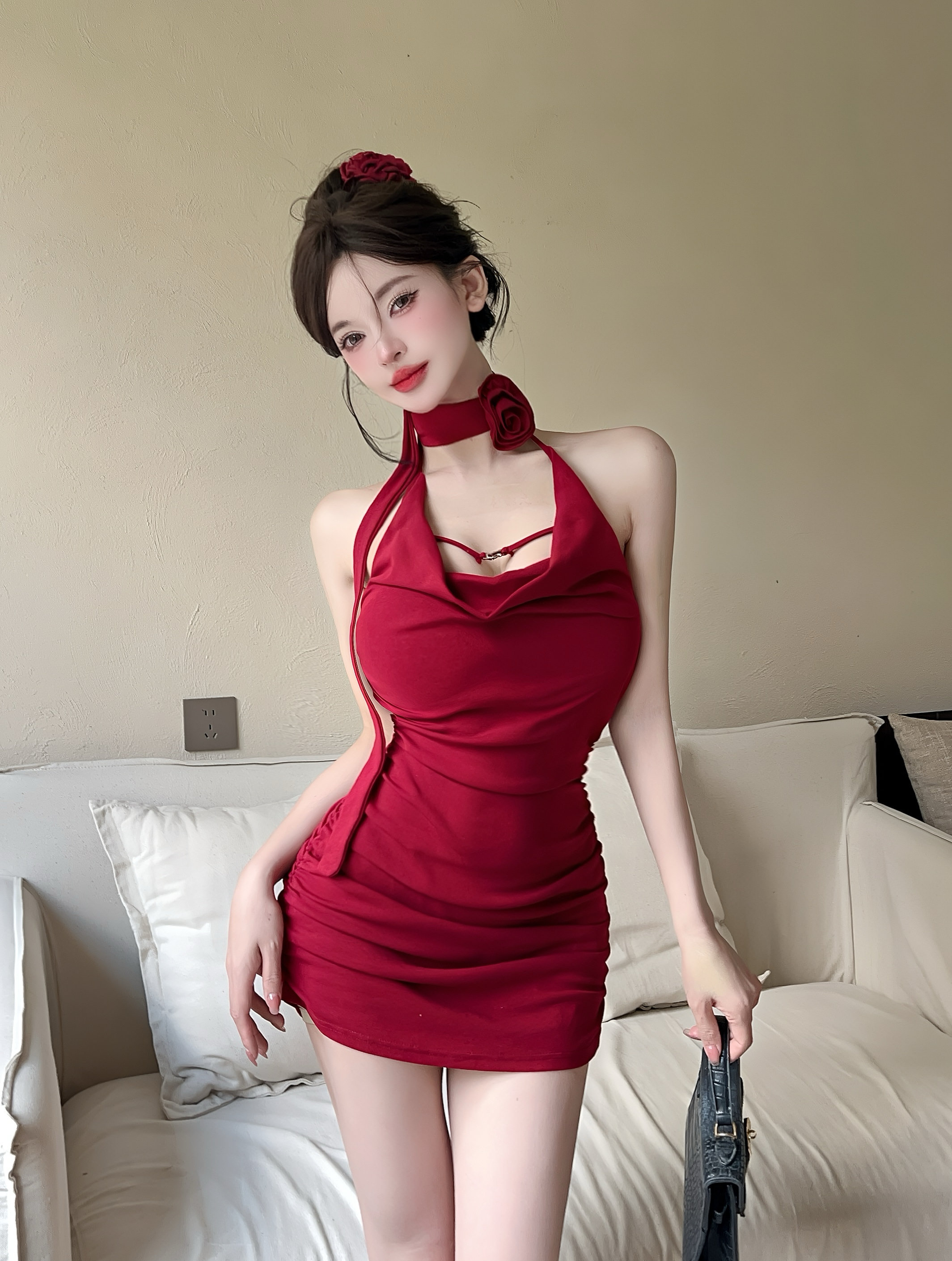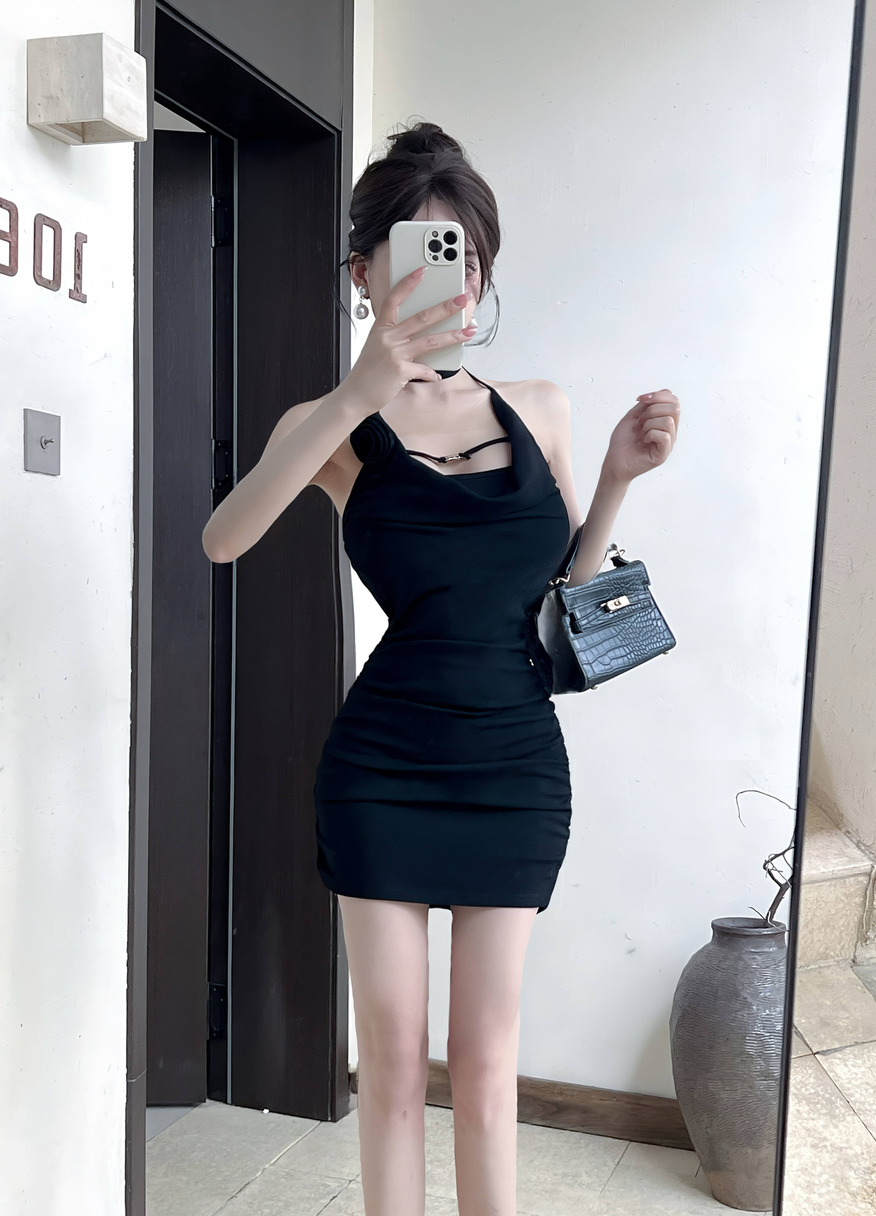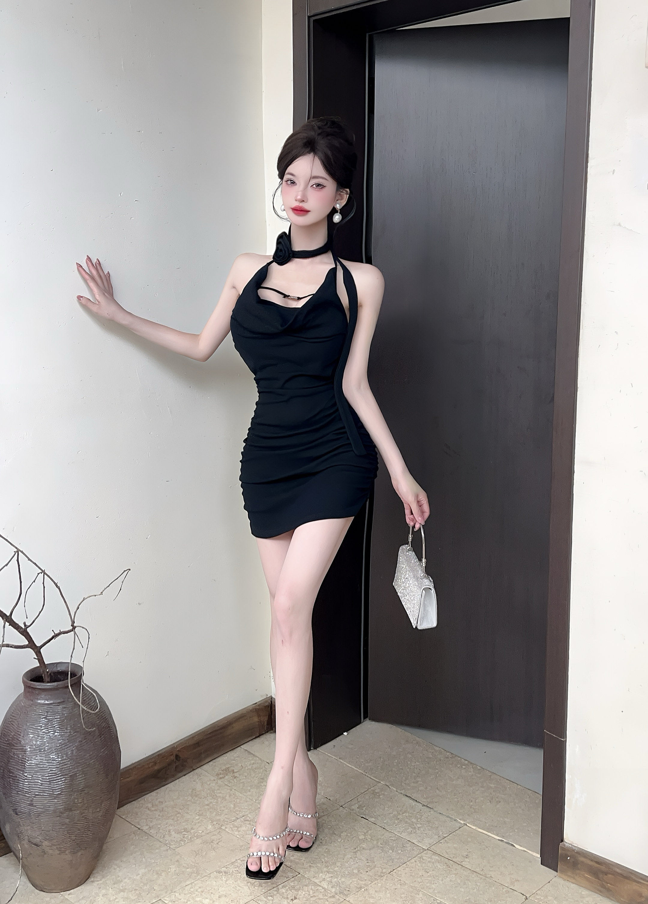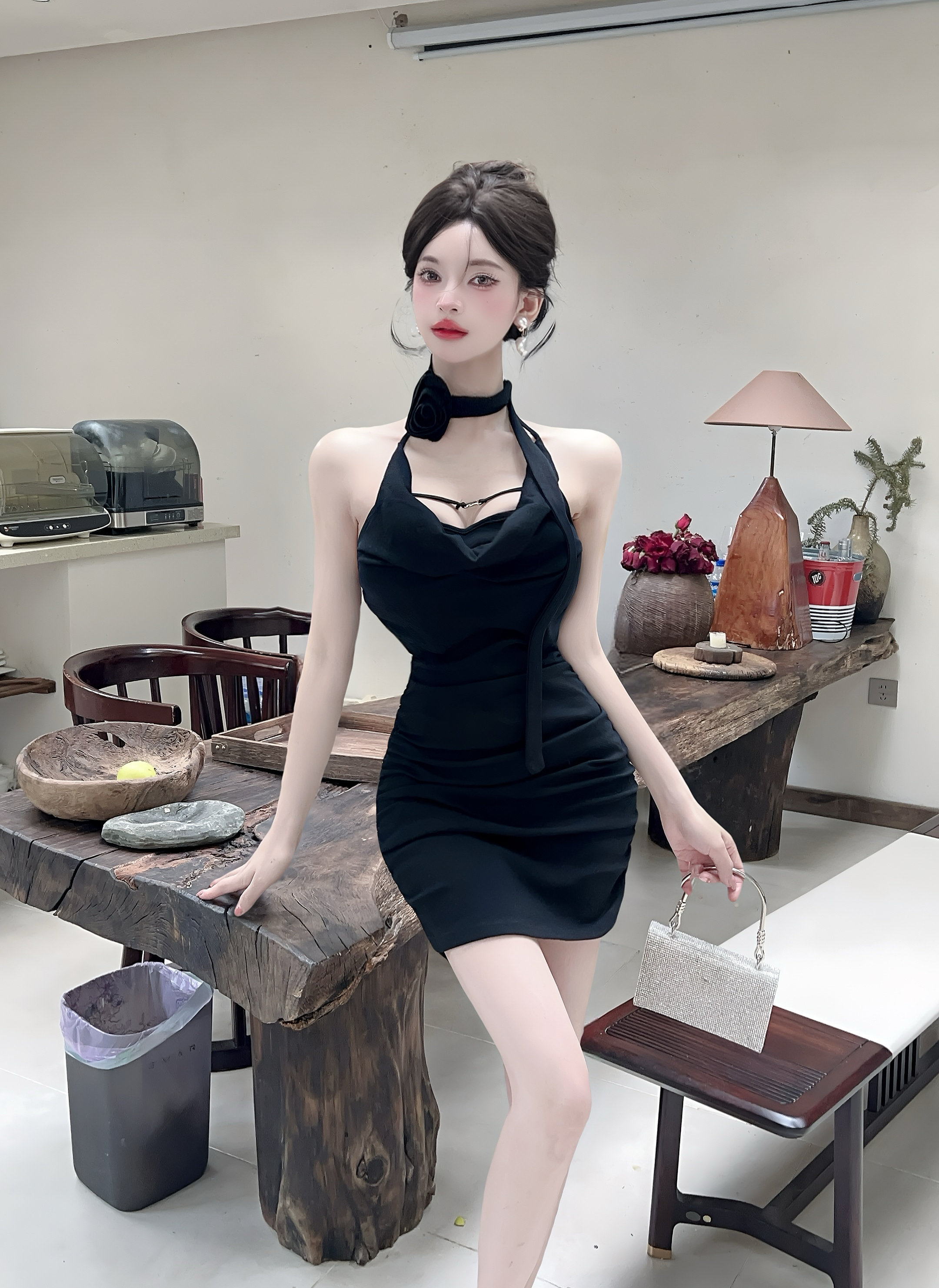 实拍2025夏季复古辣妹挂脖荡领飘带花朵性感包臀百搭洋气连衣裙