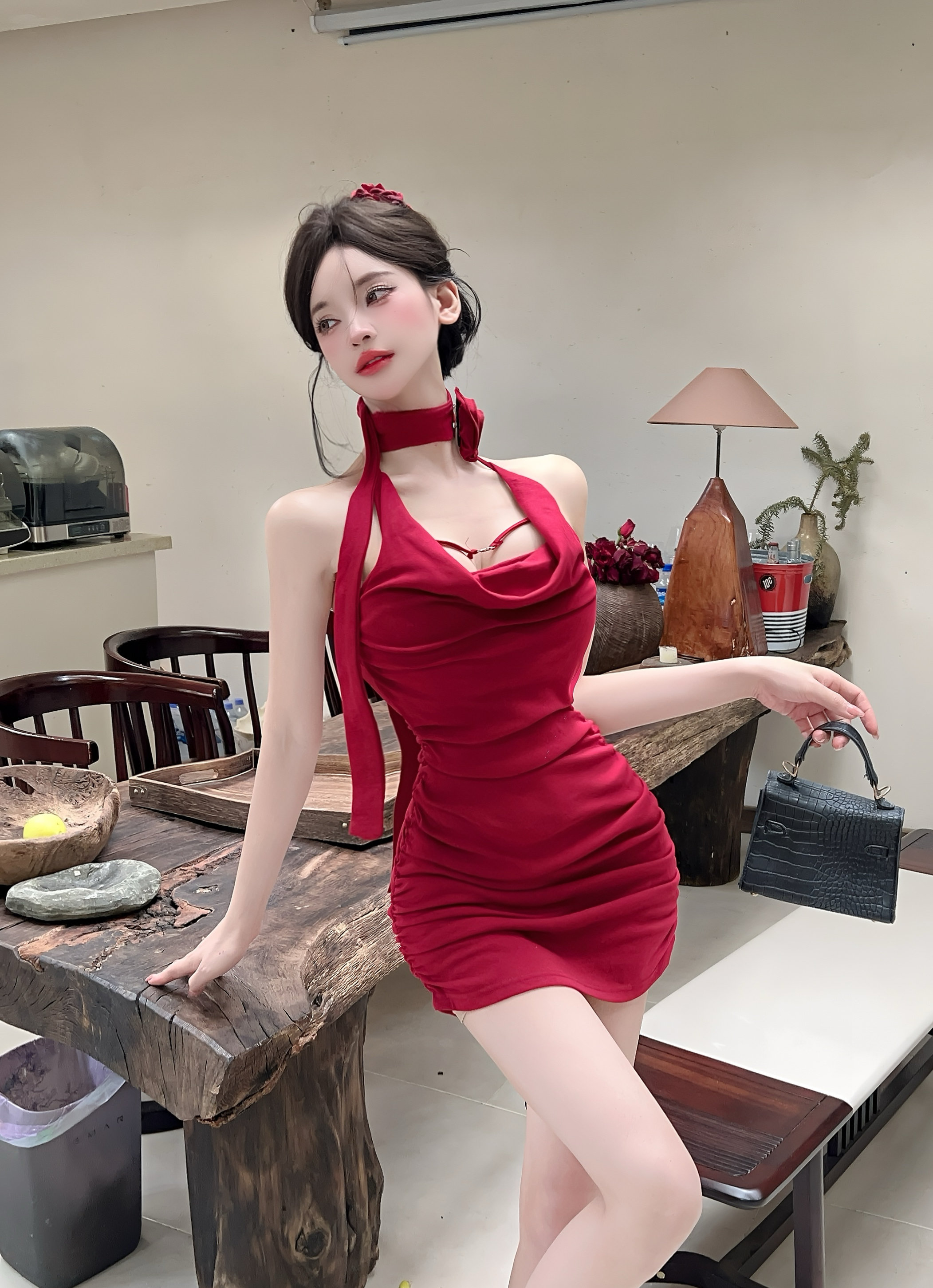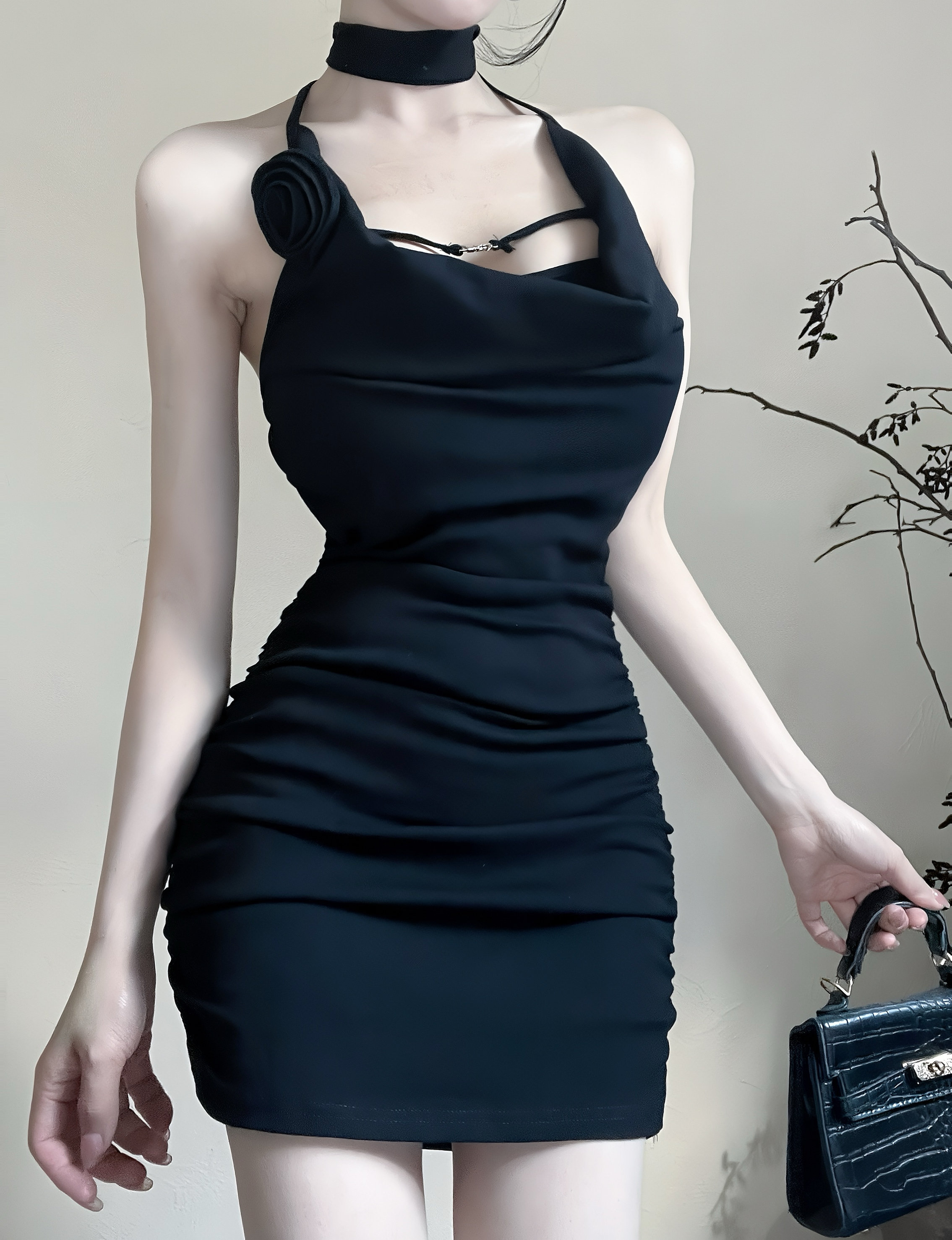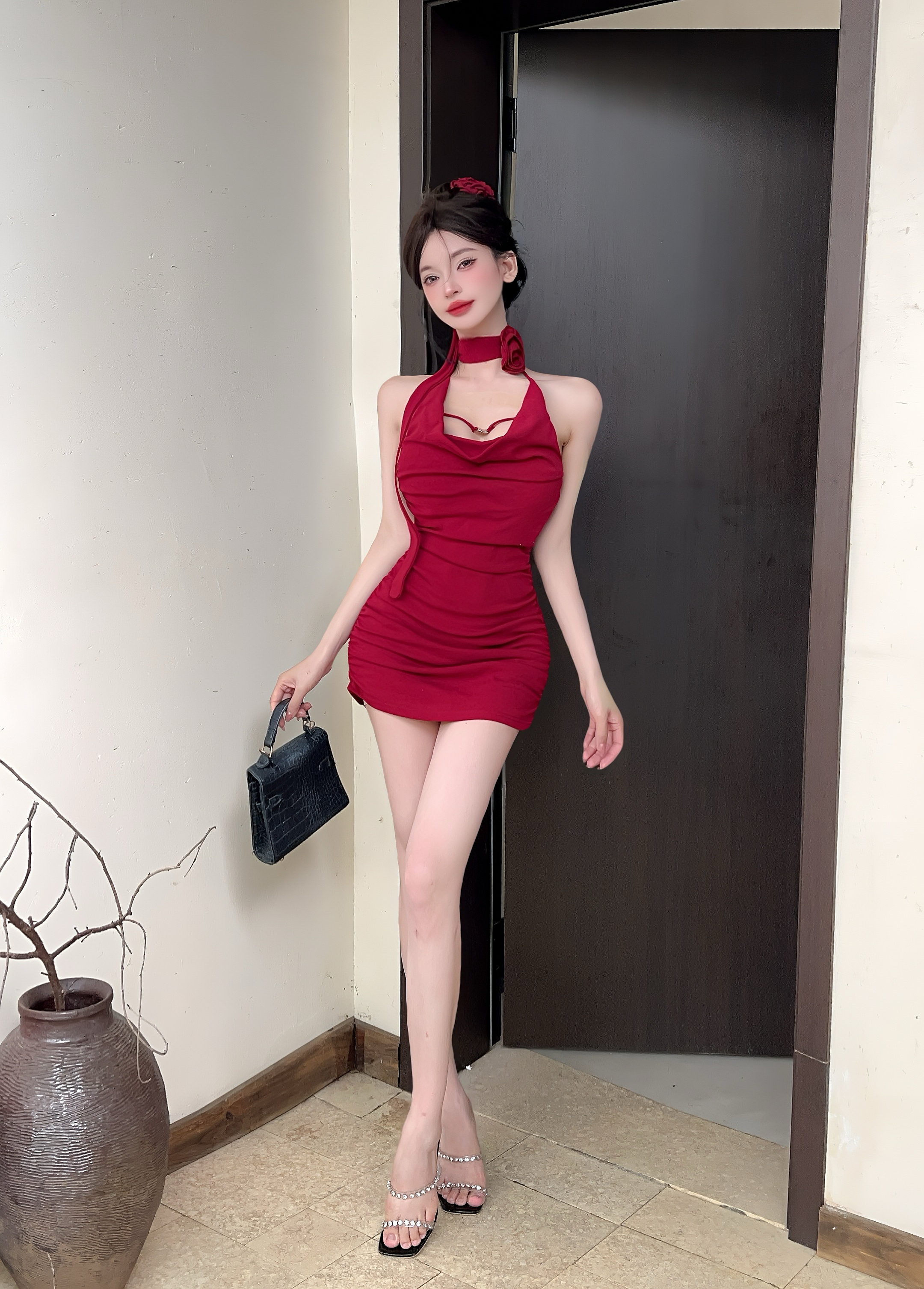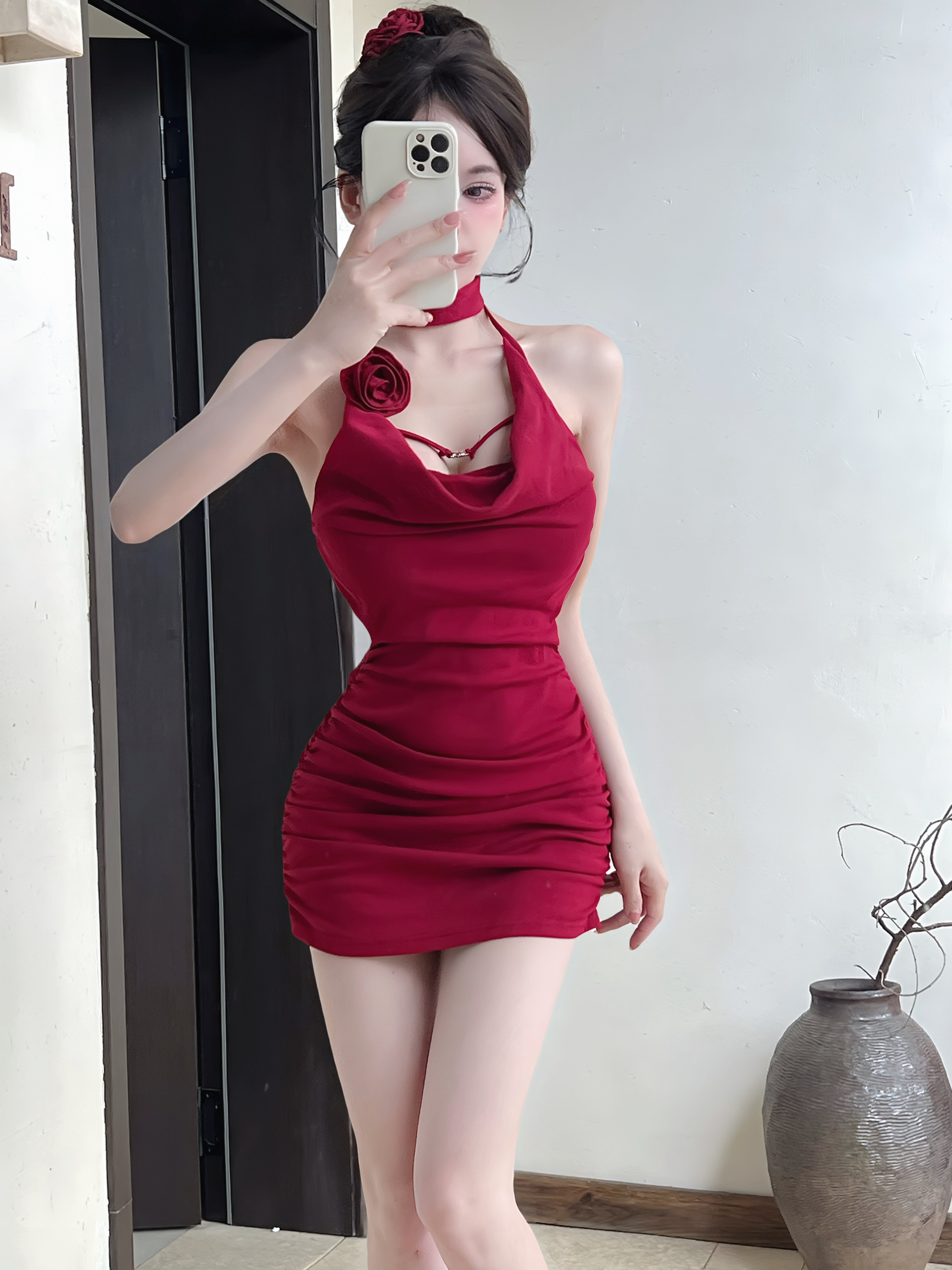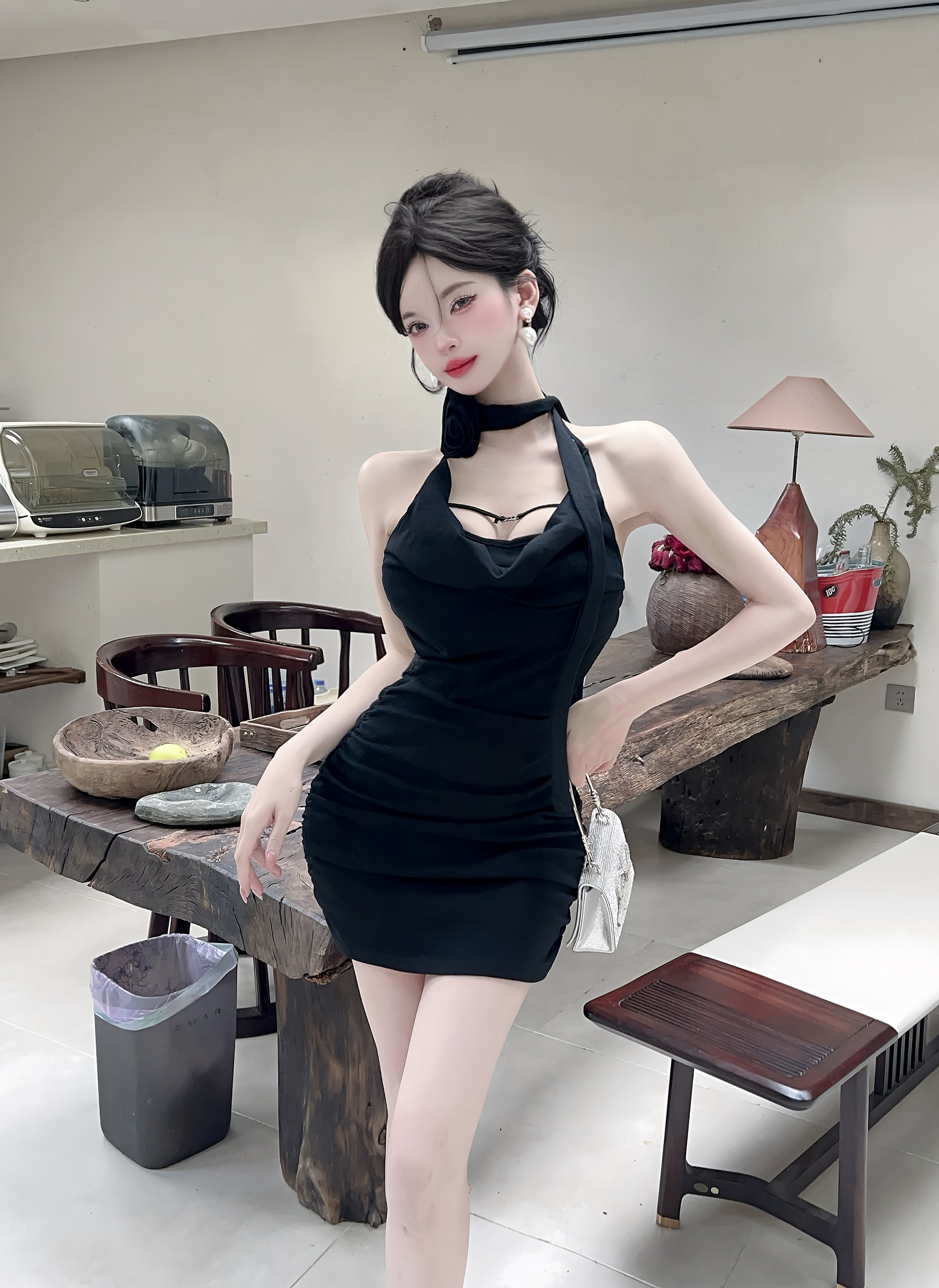实拍2025夏季复古辣妹挂脖荡领飘带花朵性感包臀百搭洋气连衣裙