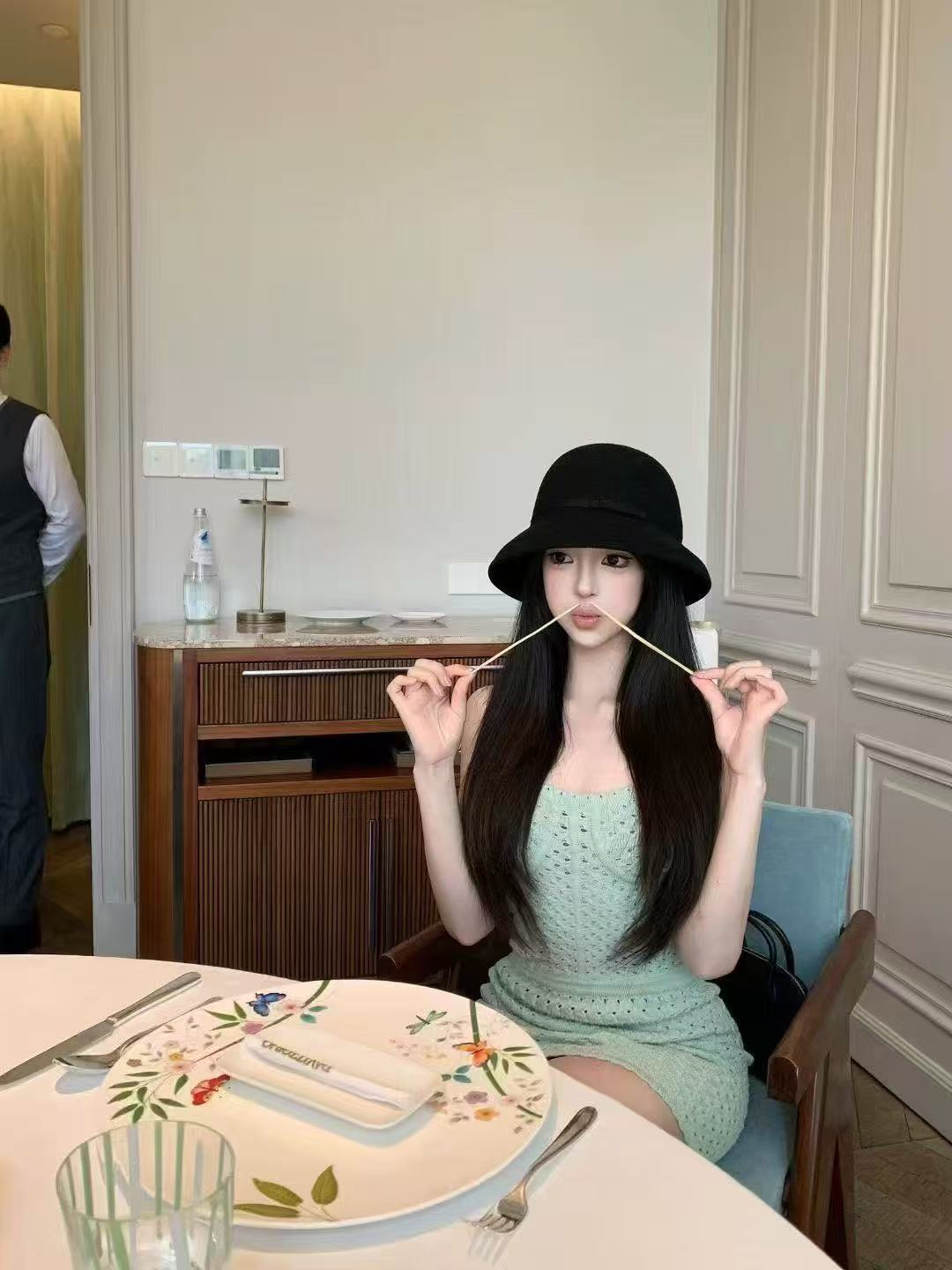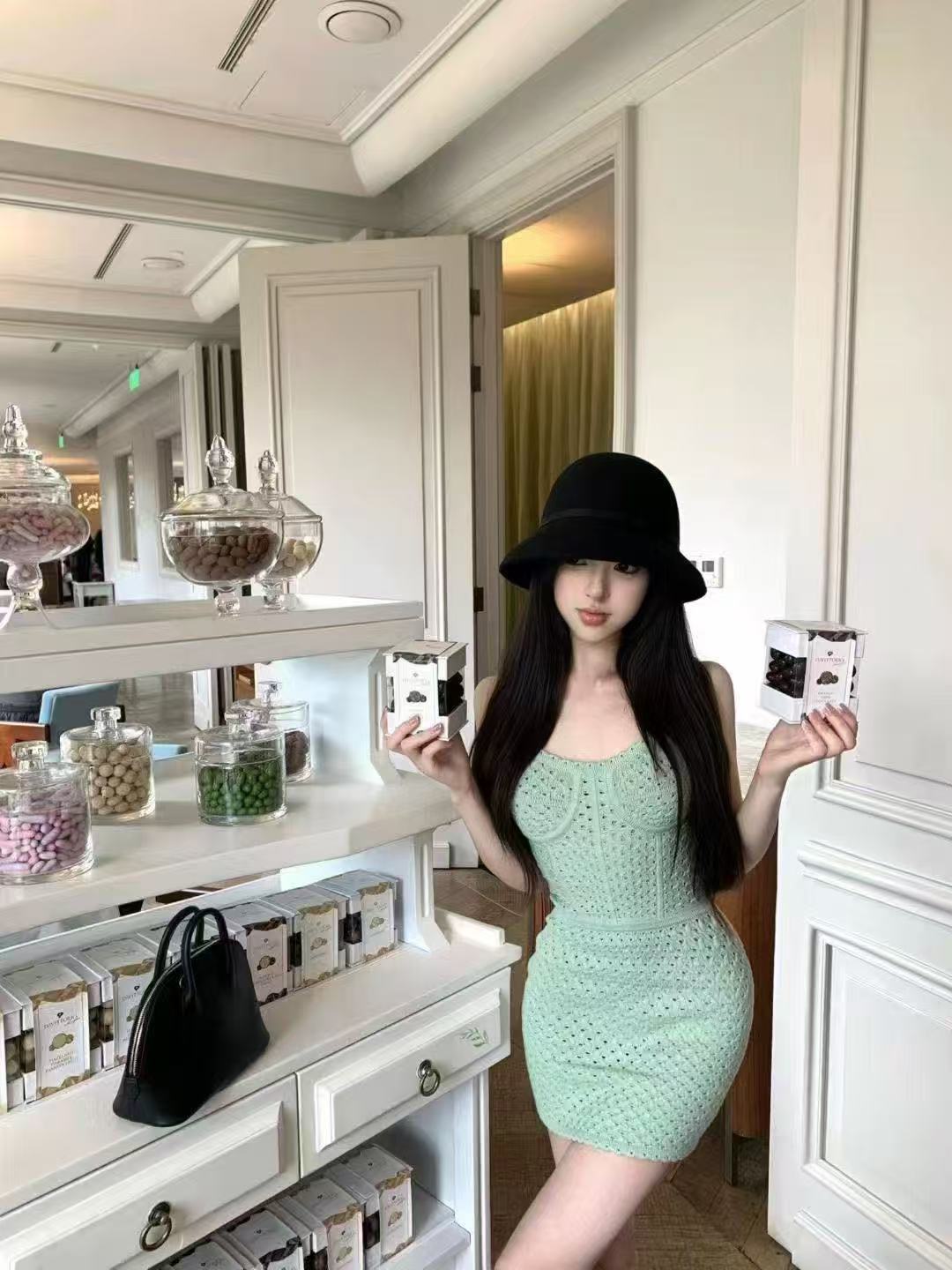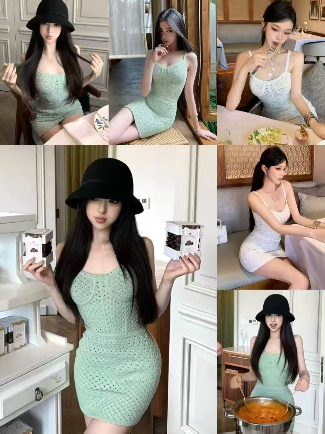 性感镂空钩花设计编织针织吊带裙千金感修身显瘦连衣裙