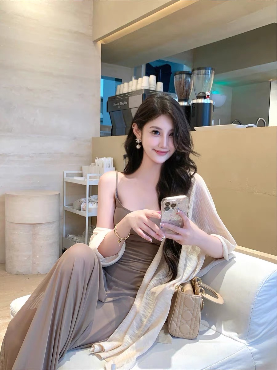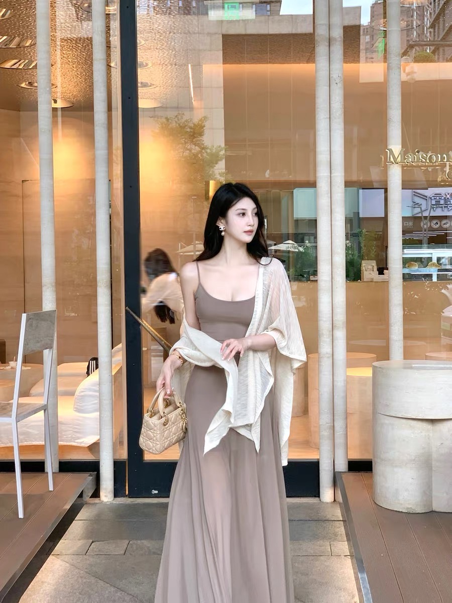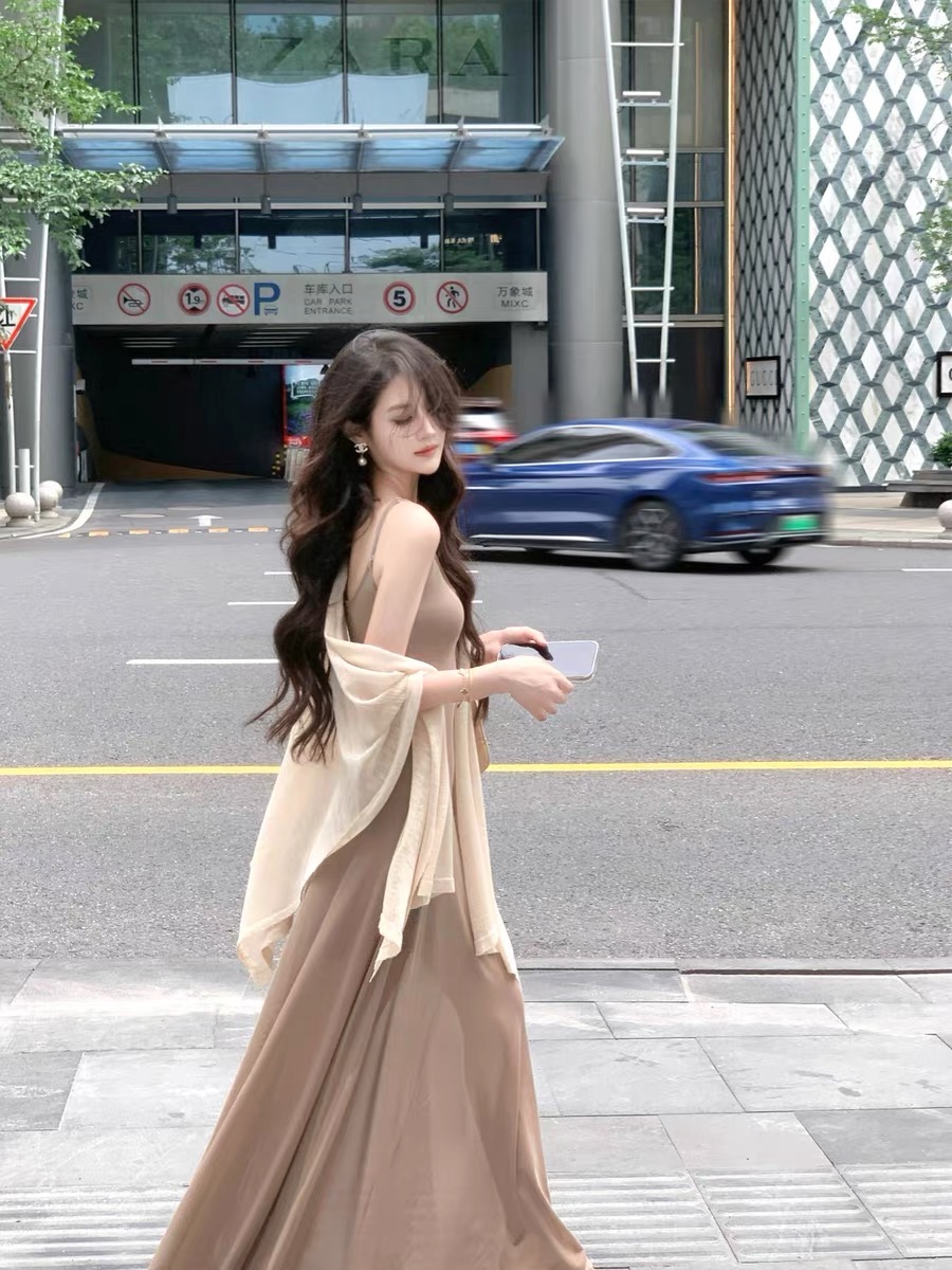 界相昔念卡其垂感网纱U领连衣裙女2025夏修身显瘦长款吊带裙