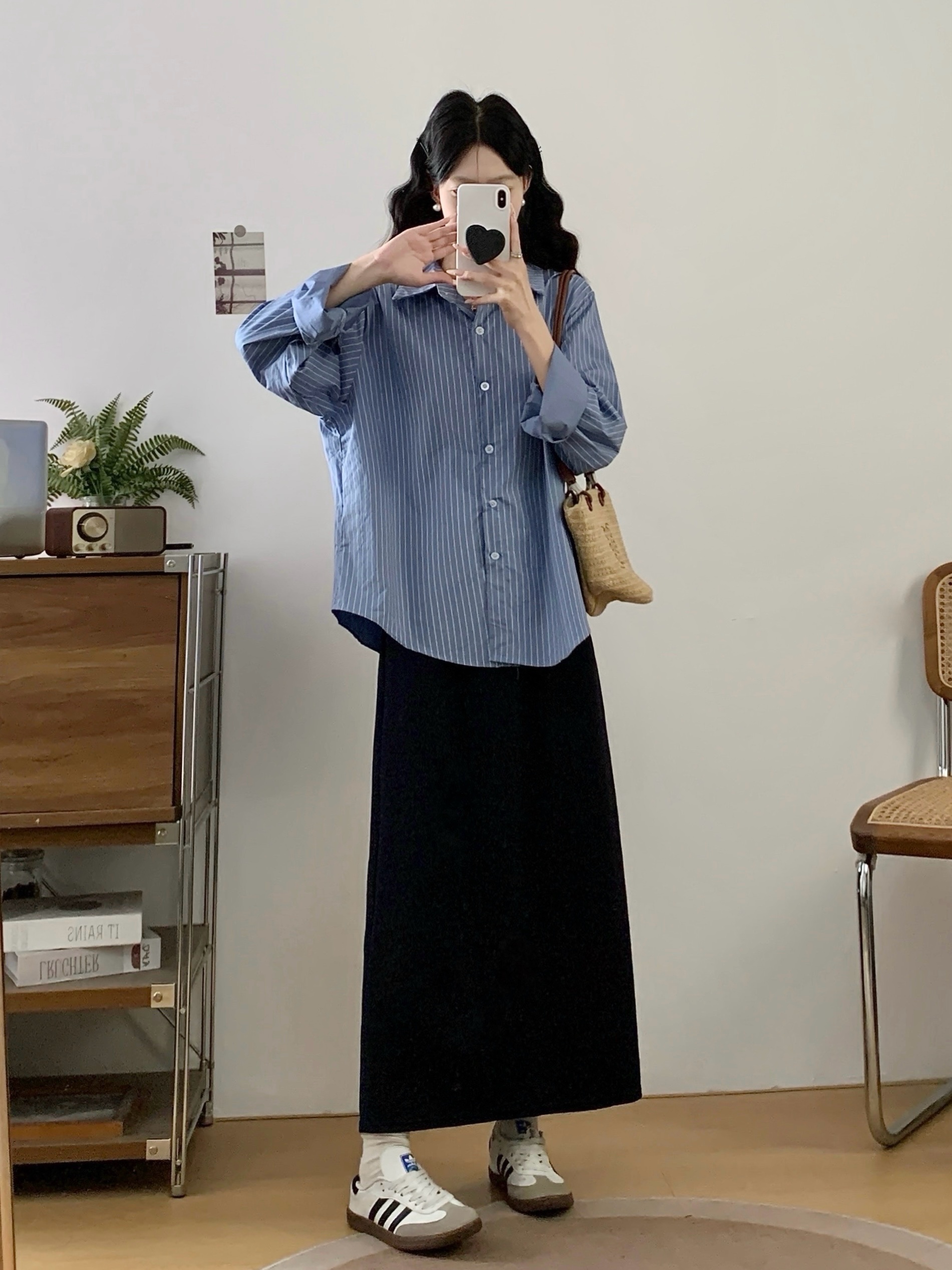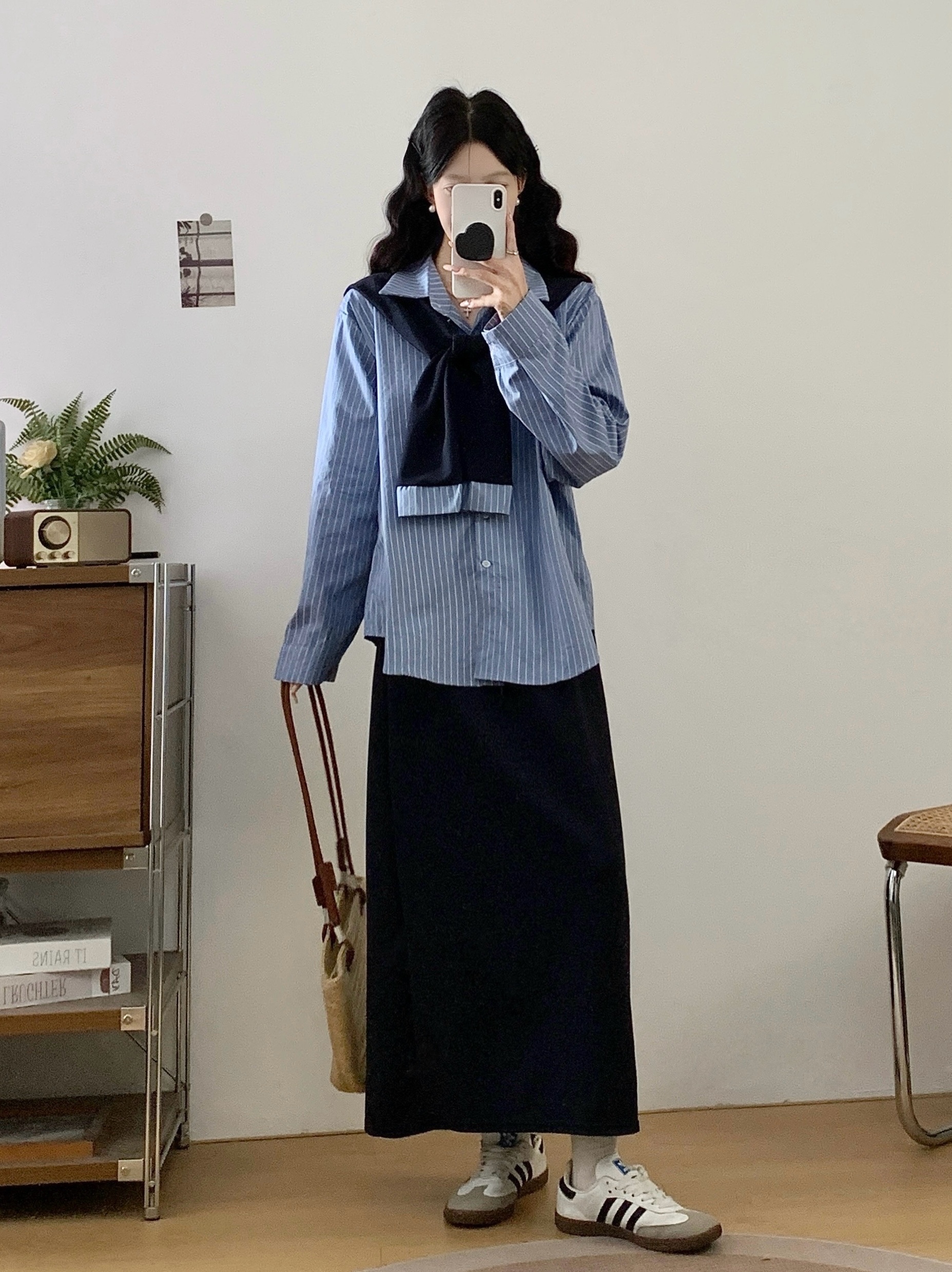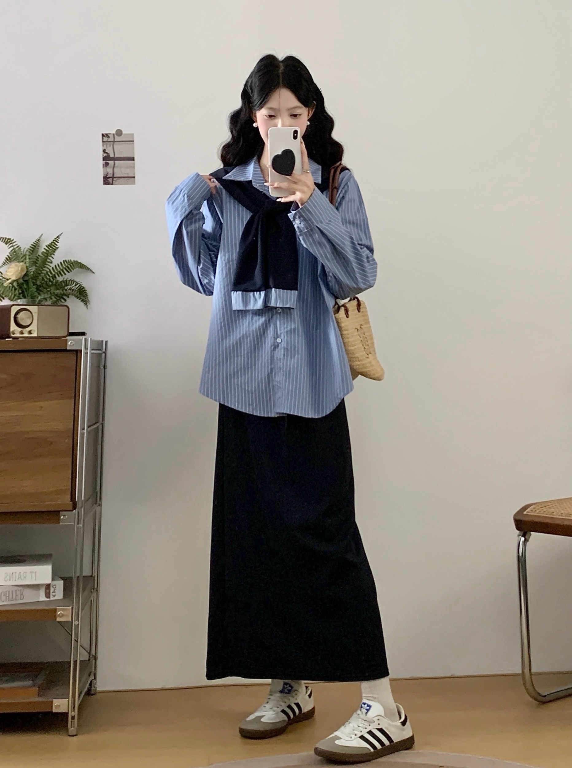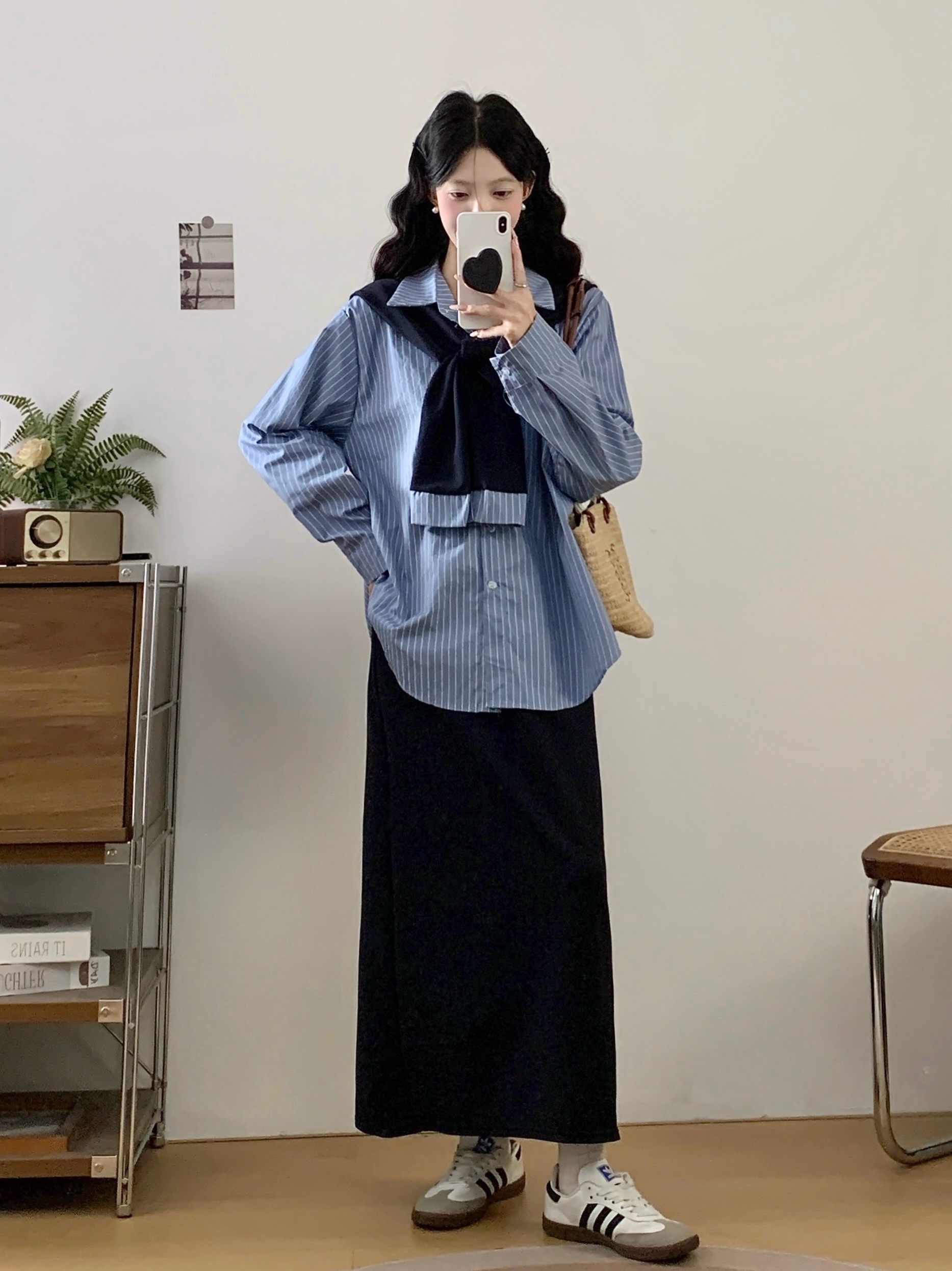 实拍~大码秋季复古韩系休闲蓝色条纹衬衫+披肩套装半身裙三件套