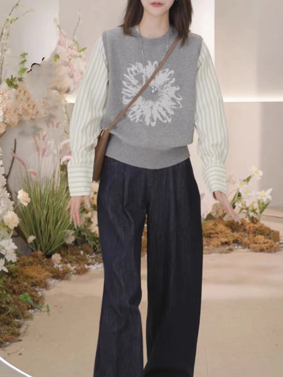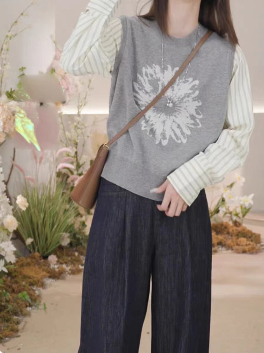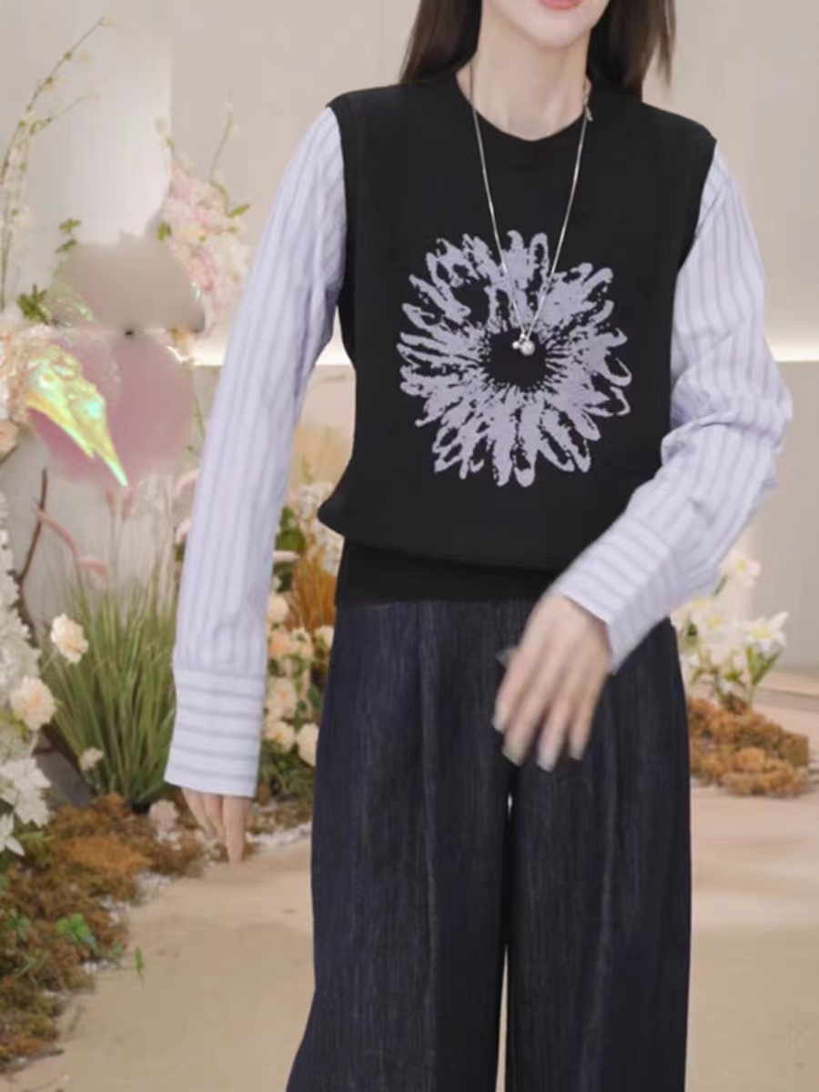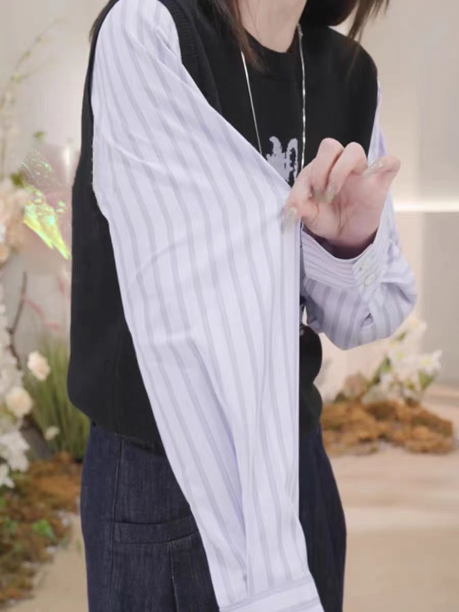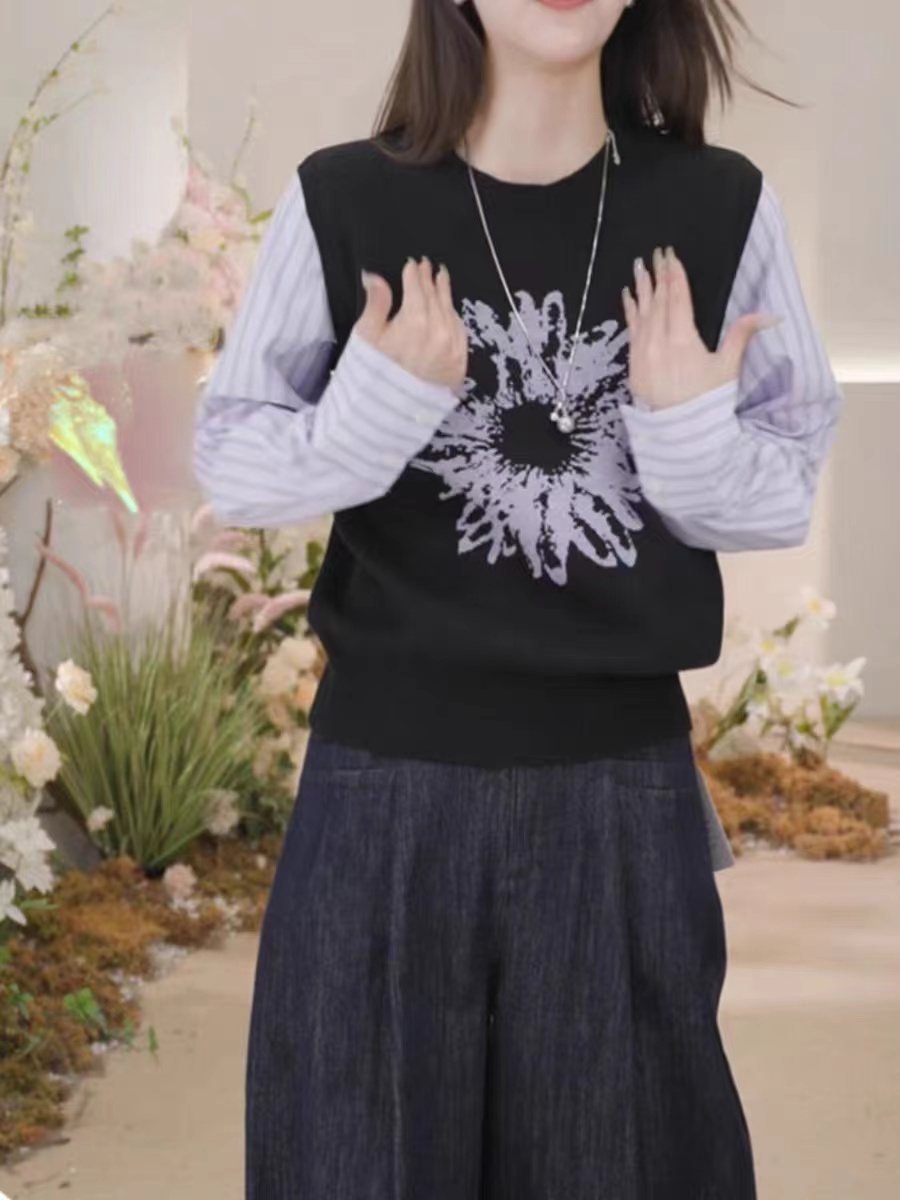 复古撞色时尚毛衣高级感衬衣袖拼接假两件针织衫小众印花上衣女秋