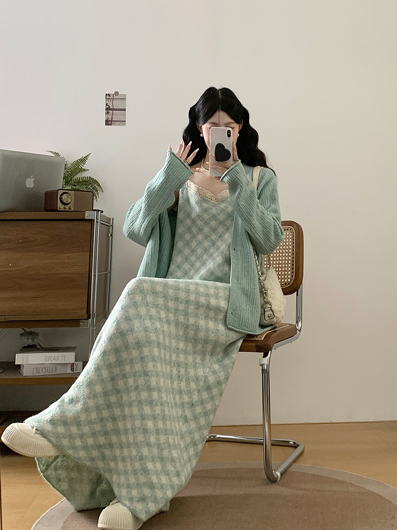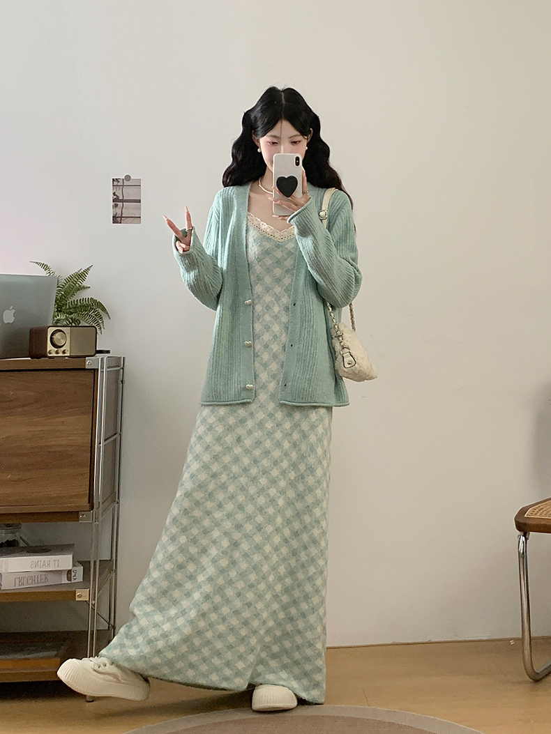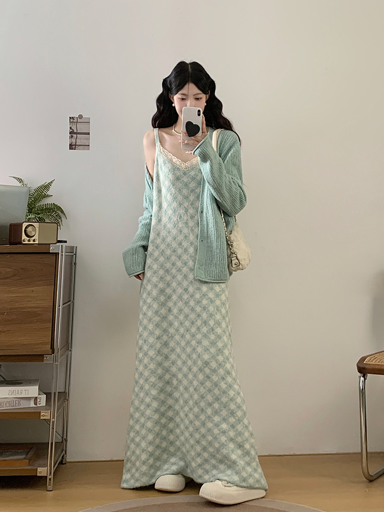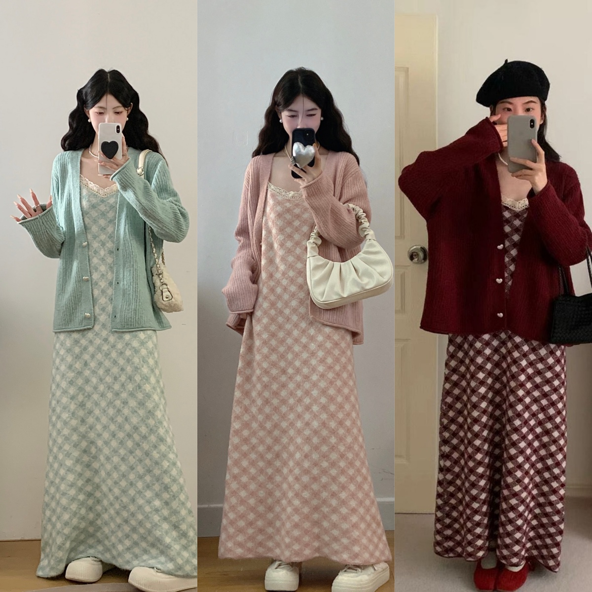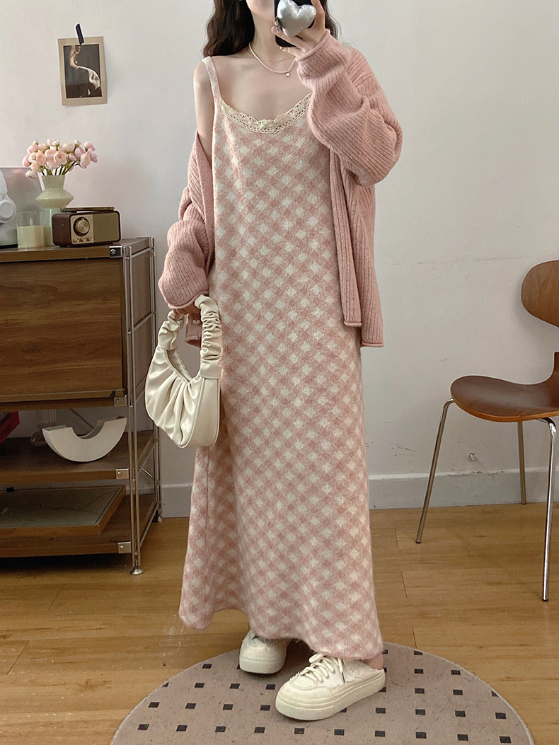 实拍大码秋冬韩系温柔蕾丝花边格子针织吊带裙+针织毛衣外套套装
