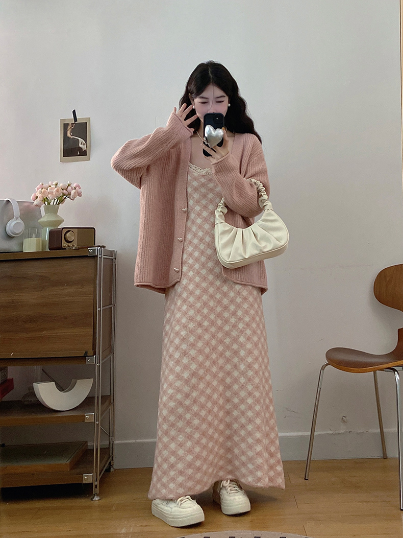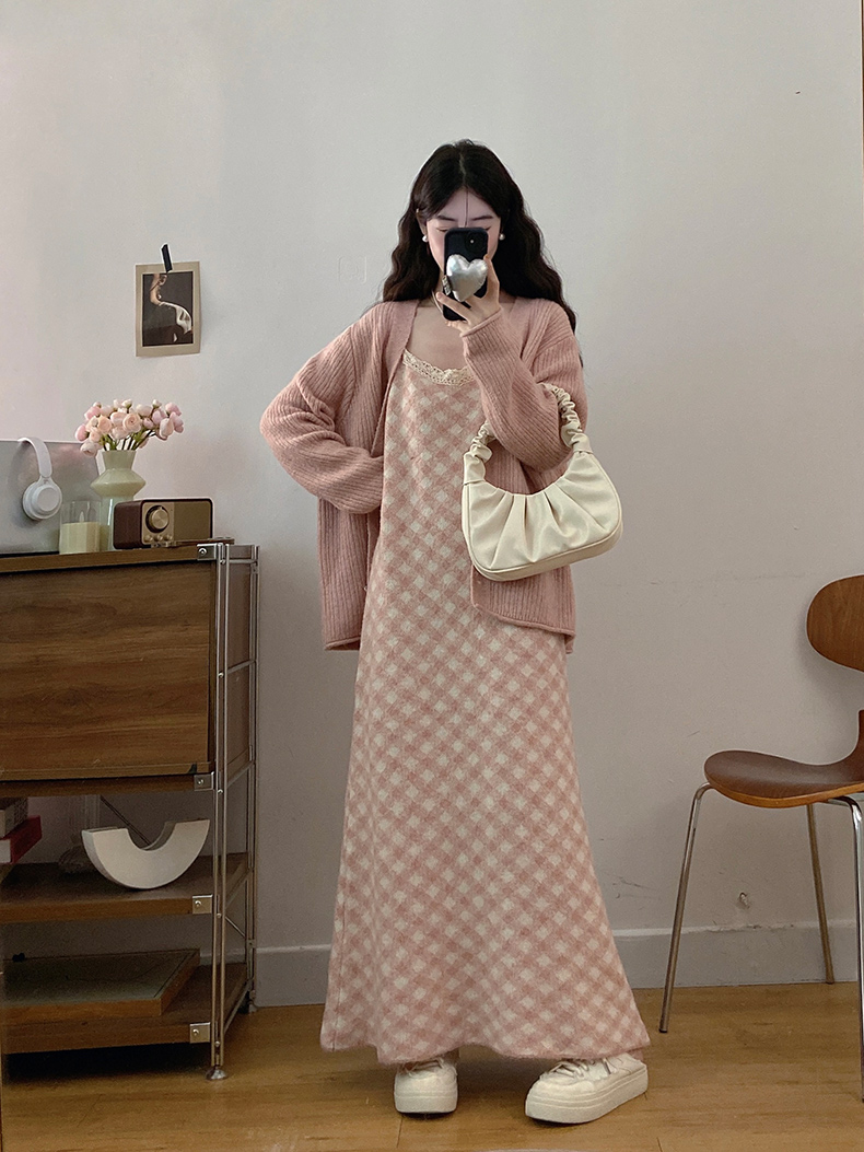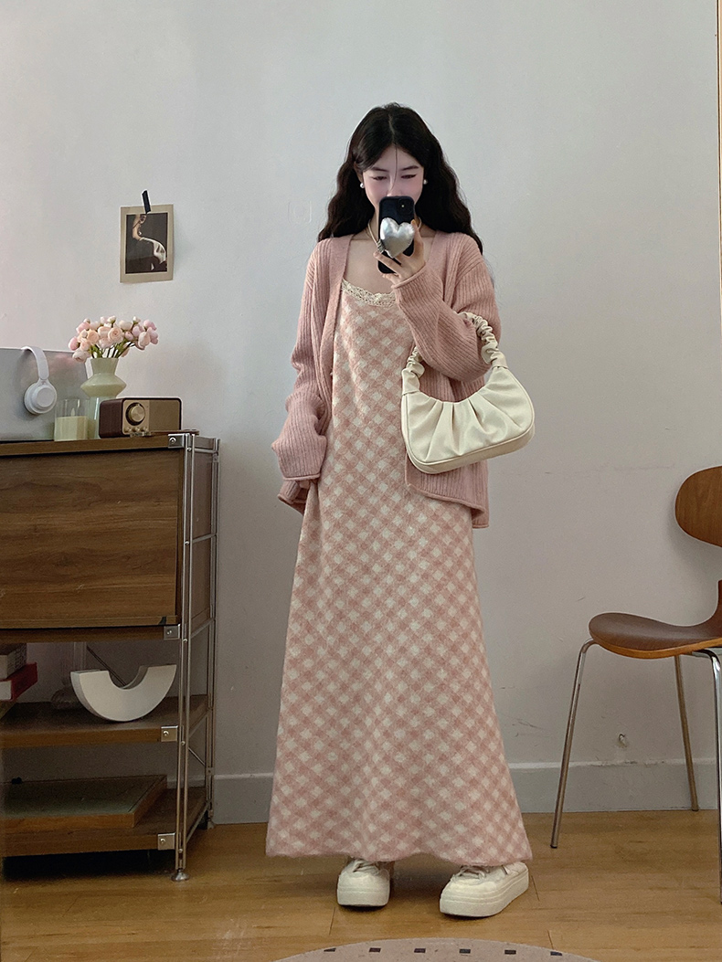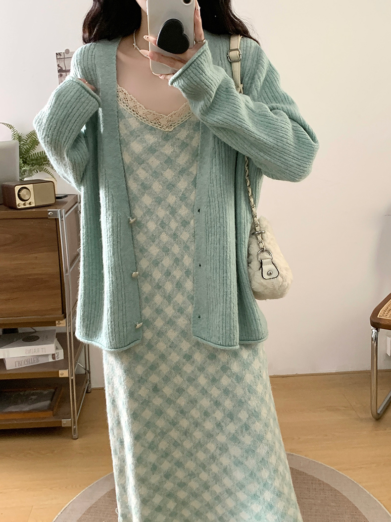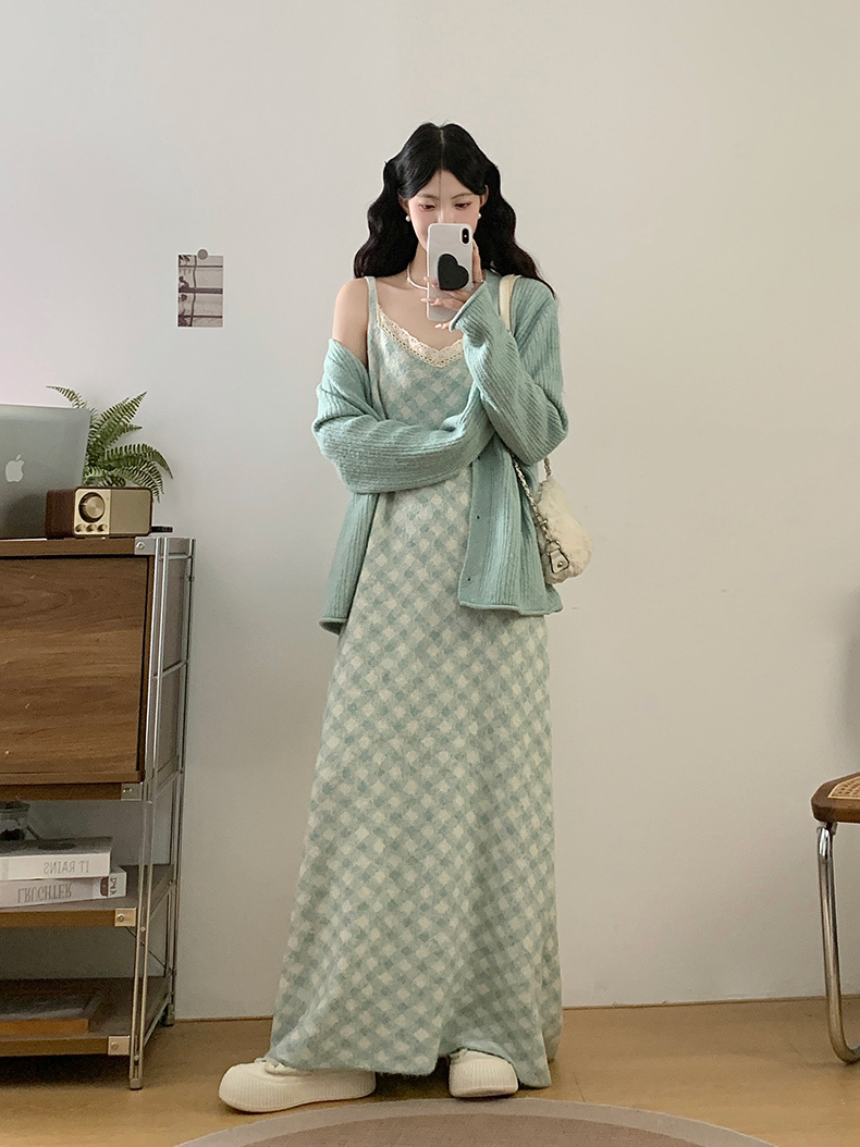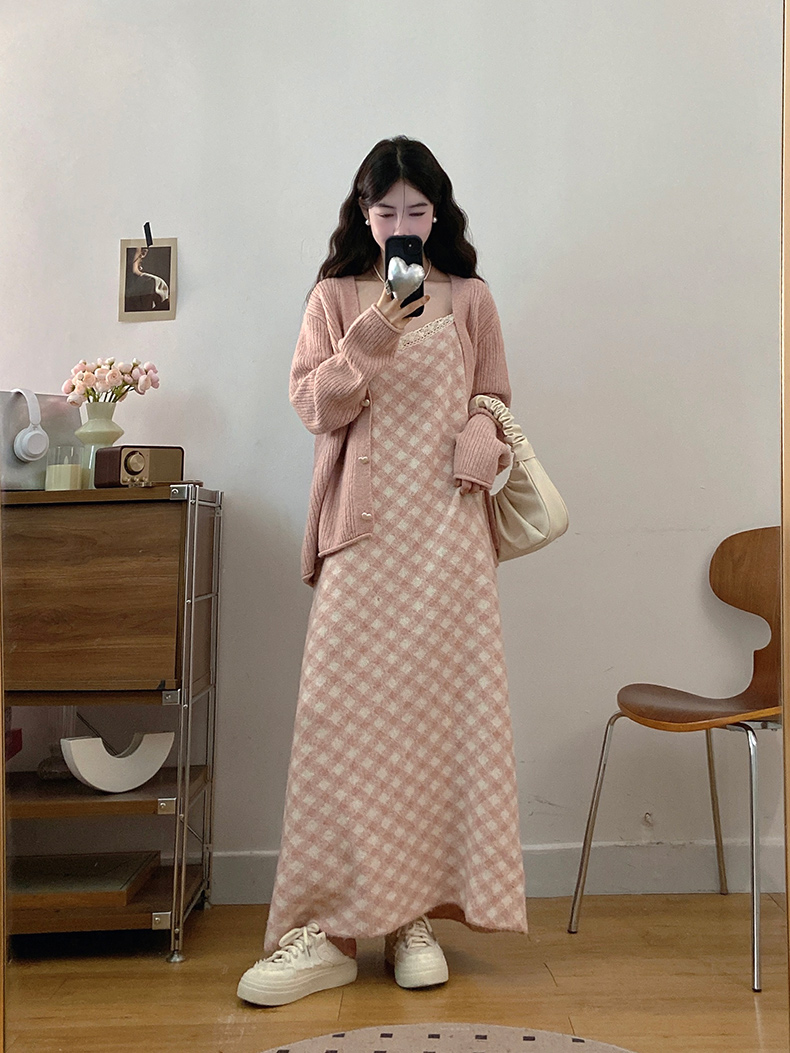 实拍大码秋冬韩系温柔蕾丝花边格子针织吊带裙+针织毛衣外套套装