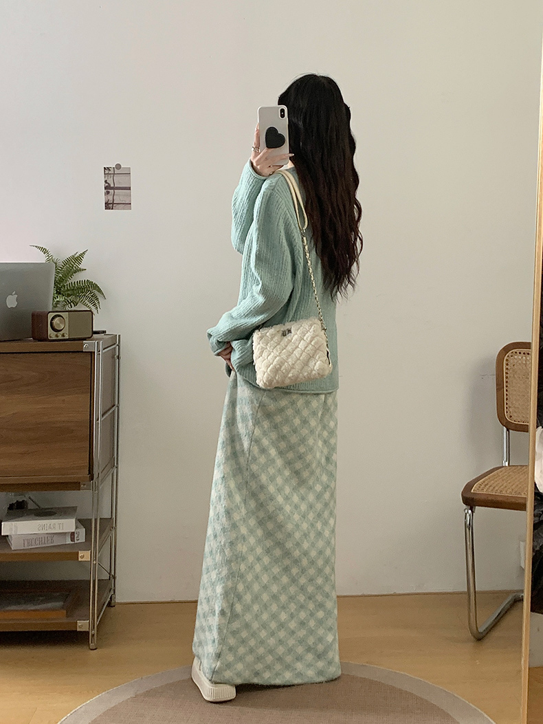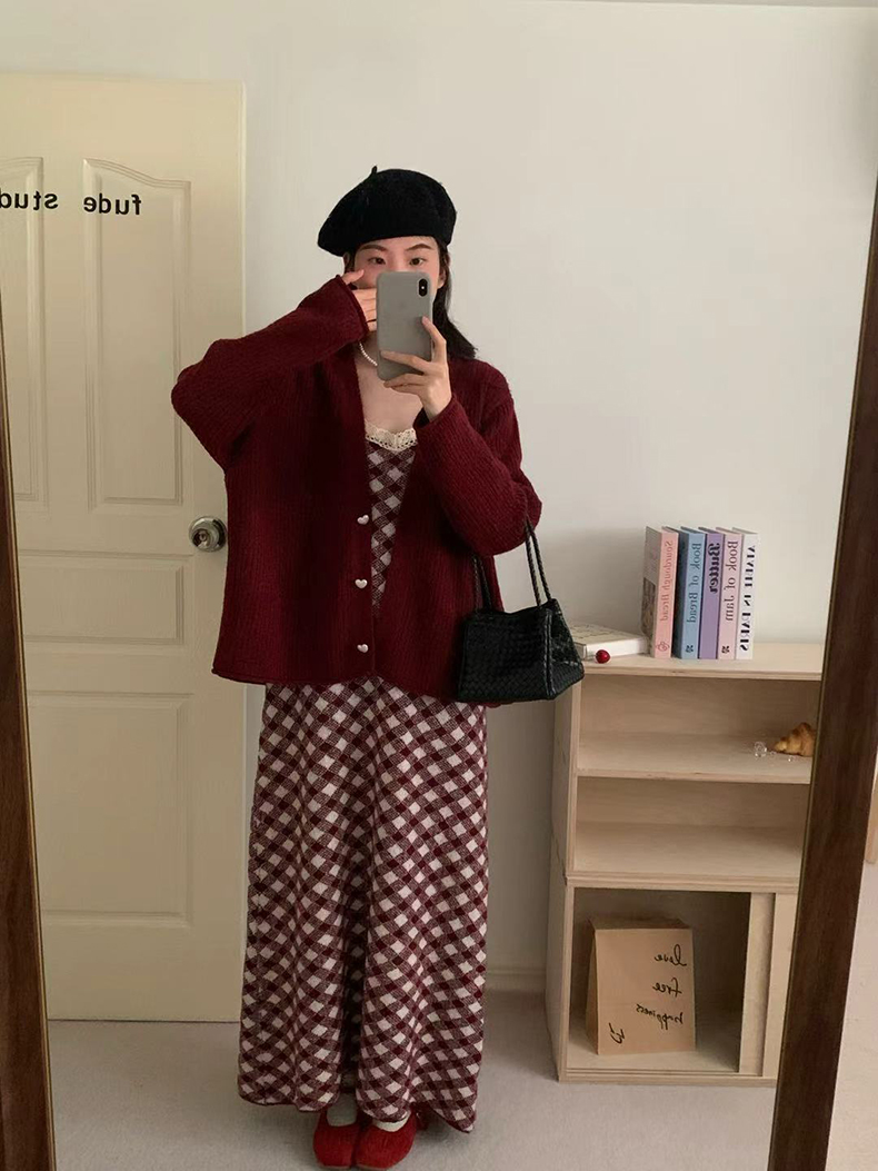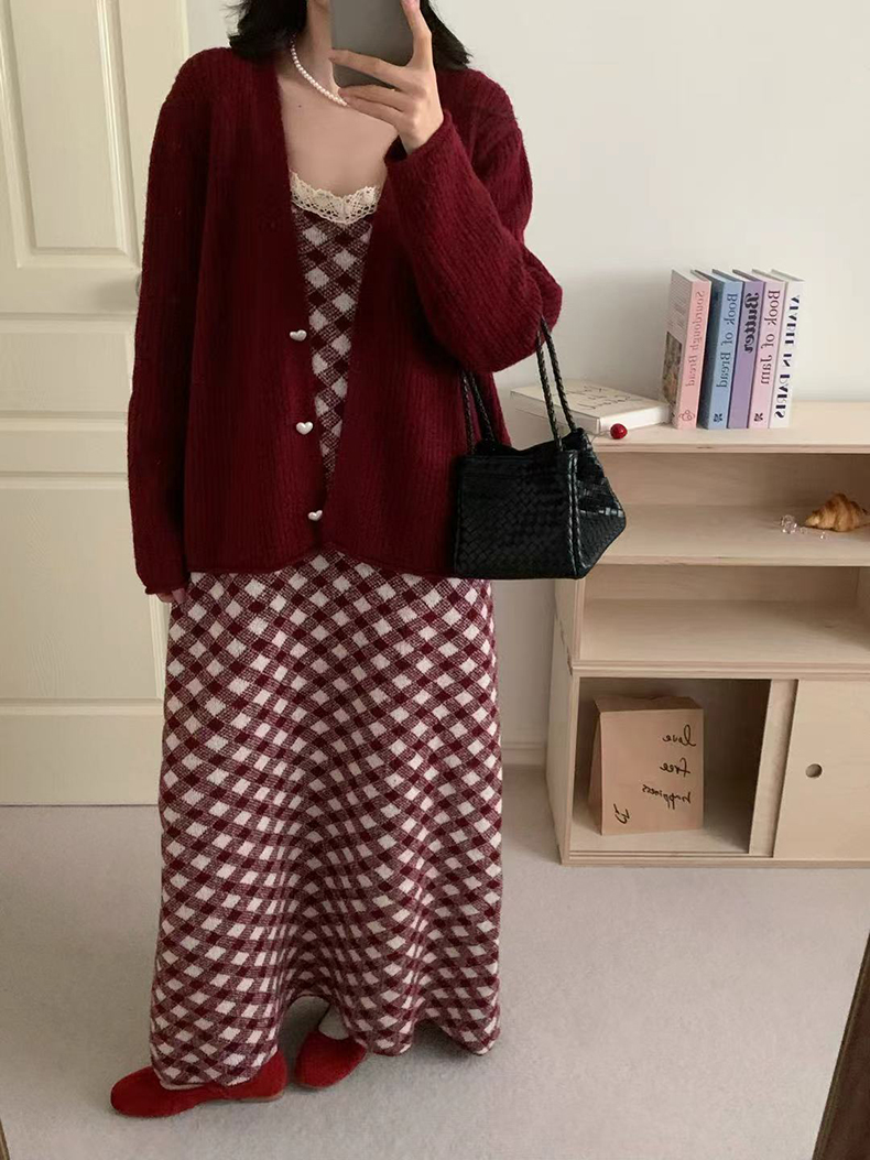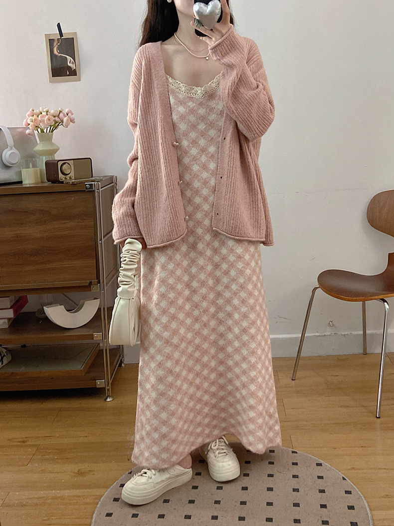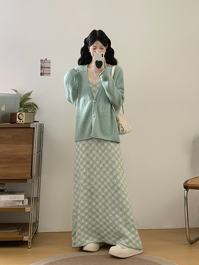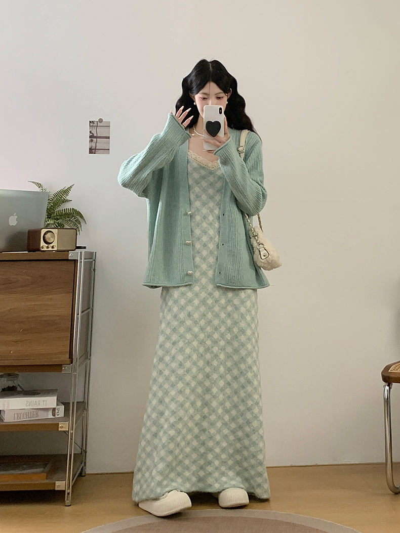 实拍大码秋冬韩系温柔蕾丝花边格子针织吊带裙+针织毛衣外套套装
