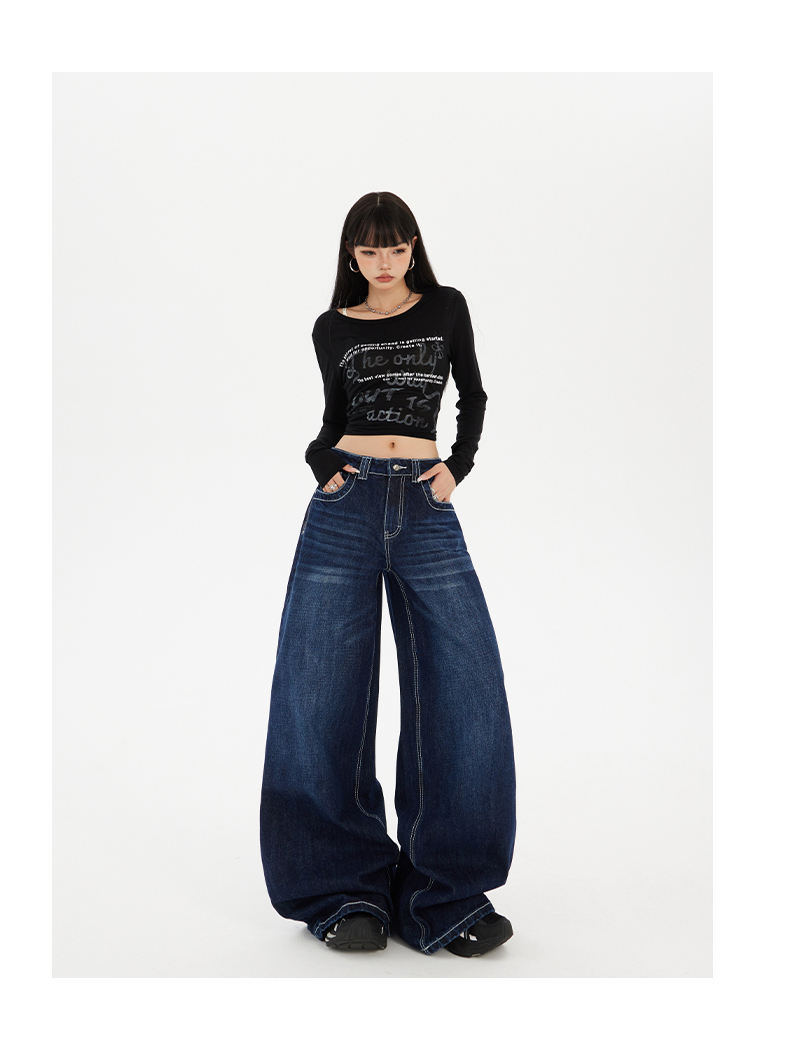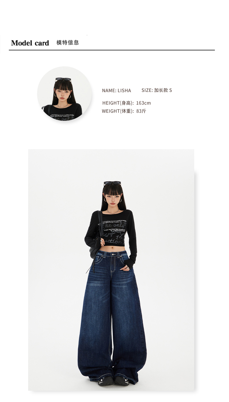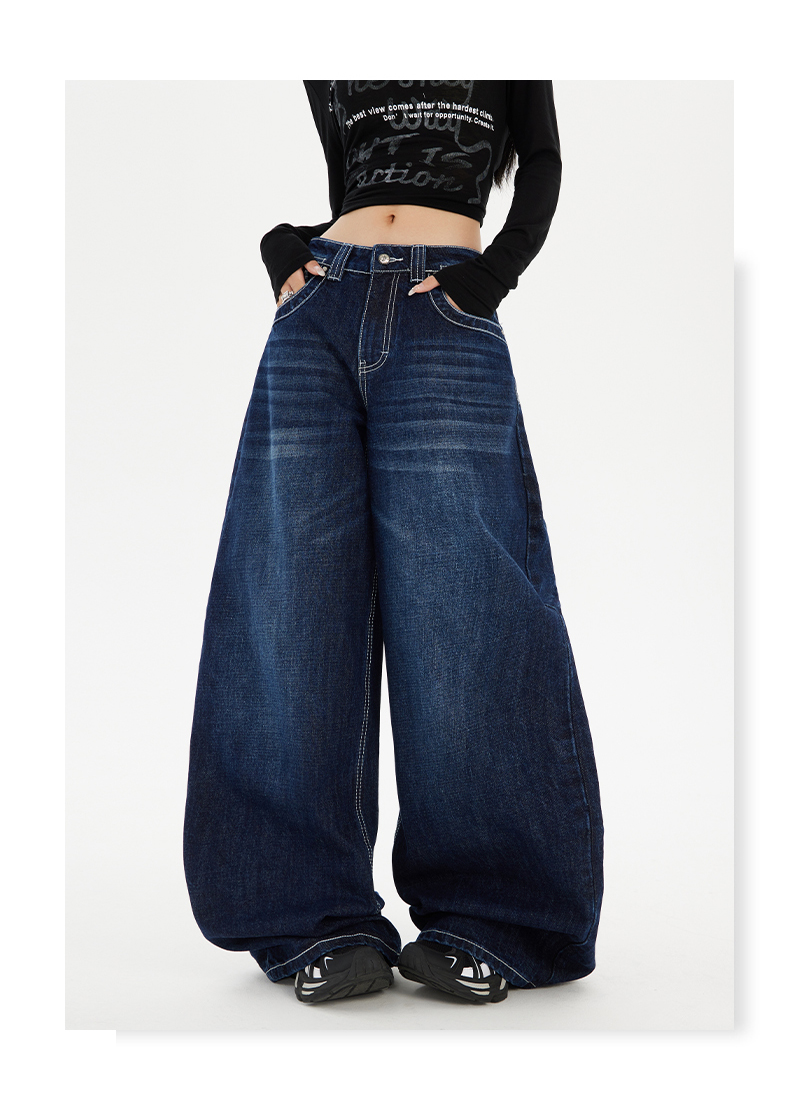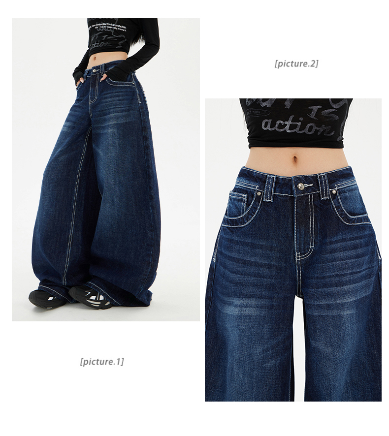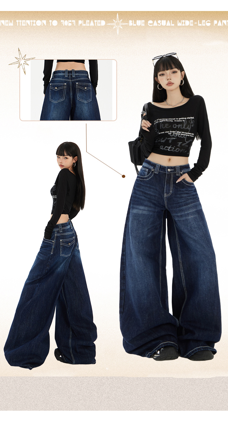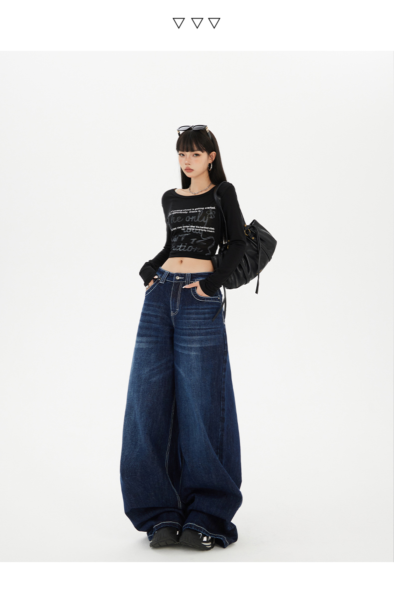 实拍美式复古高腰宽松阔腿裤秋冬百搭垂感猫纹直筒牛仔裤女新款