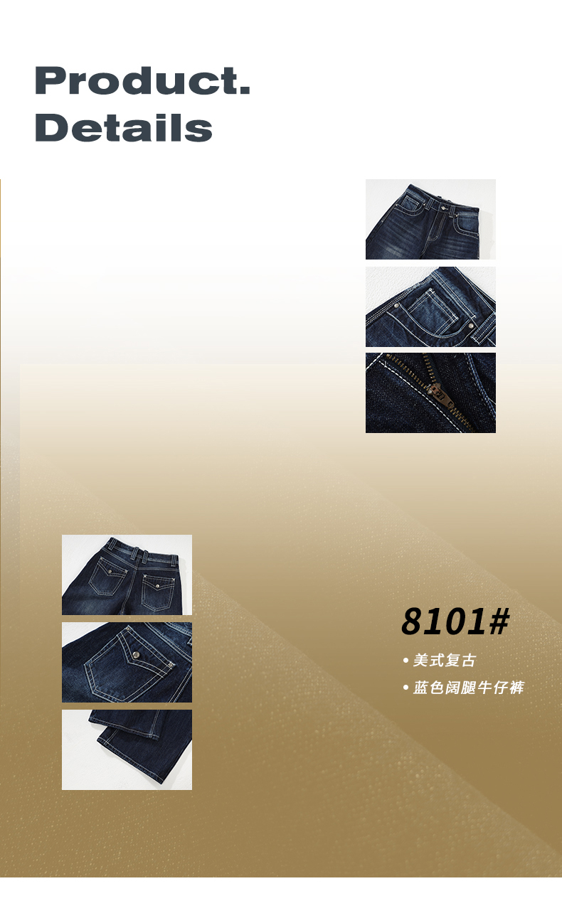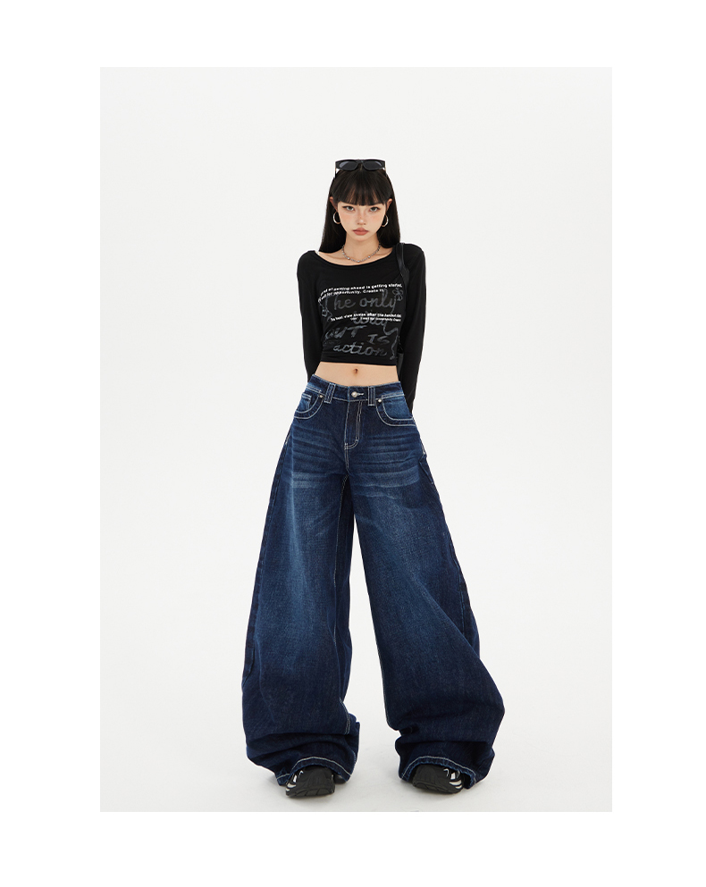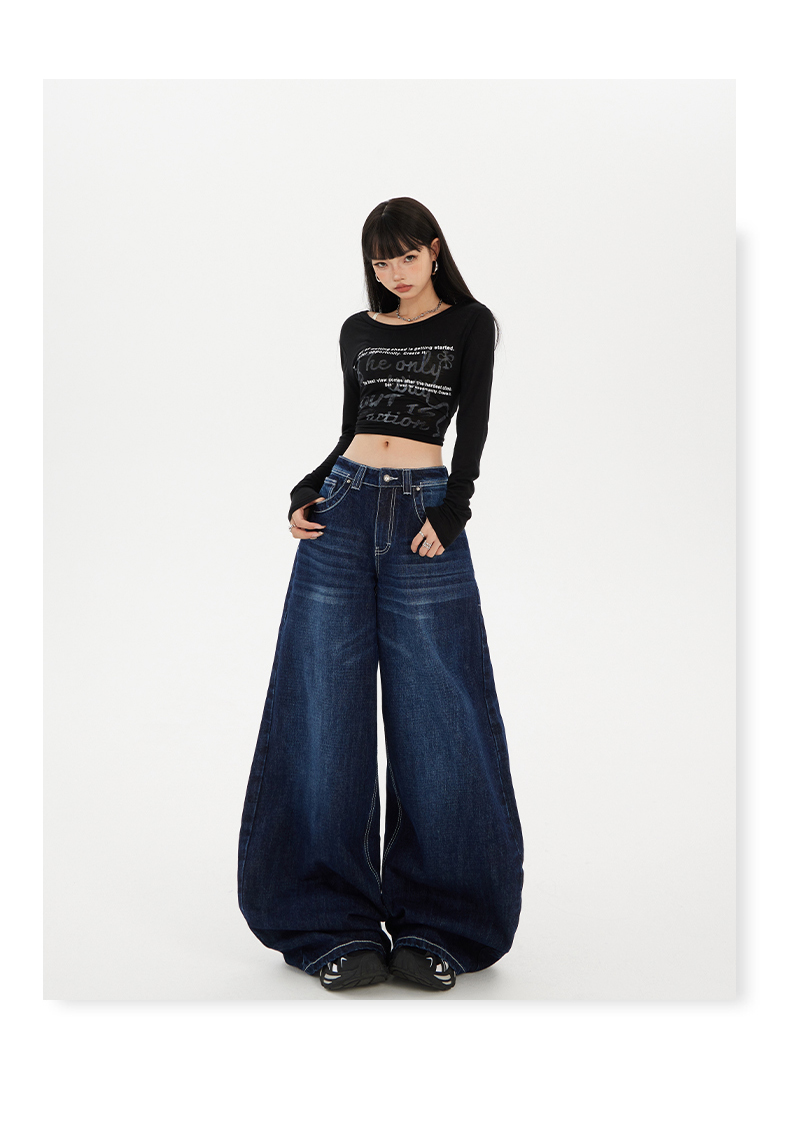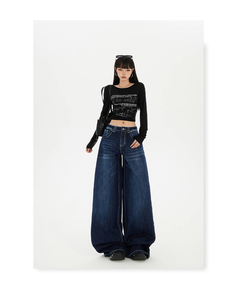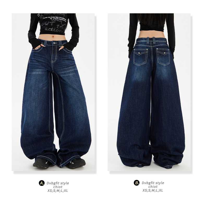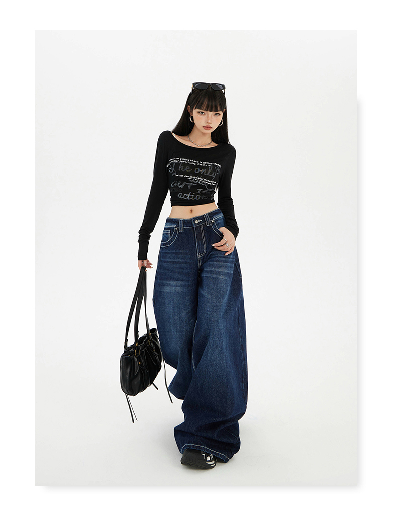 实拍美式复古高腰宽松阔腿裤秋冬百搭垂感猫纹直筒牛仔裤女新款