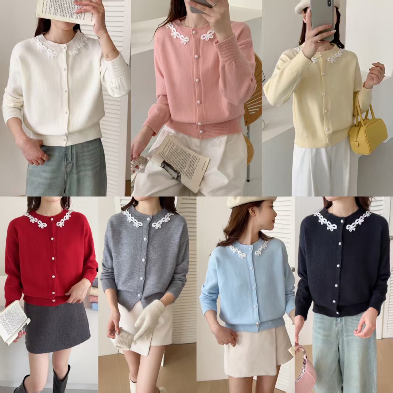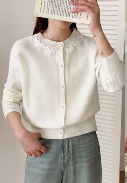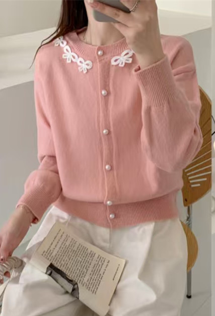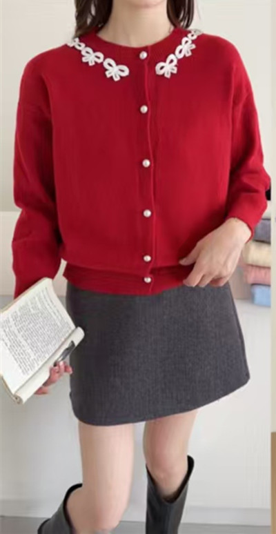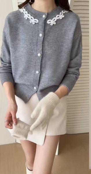 秋冬新款小香风重工钉珠针织开衫外套韩系减龄奶蓝色排扣毛衣外套