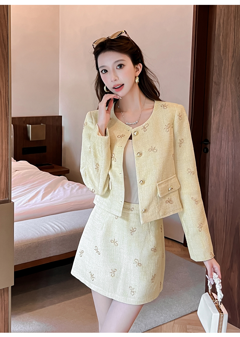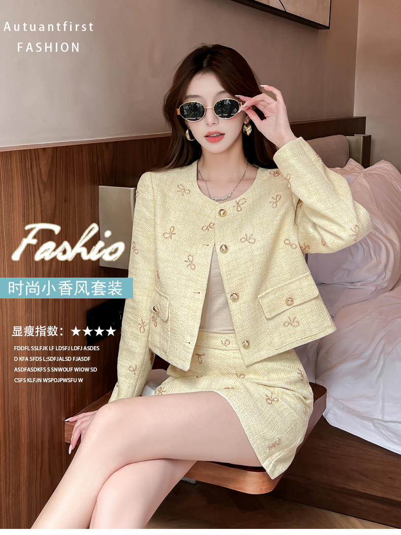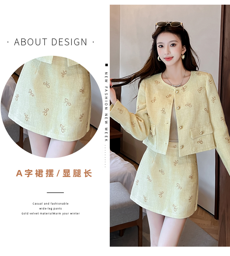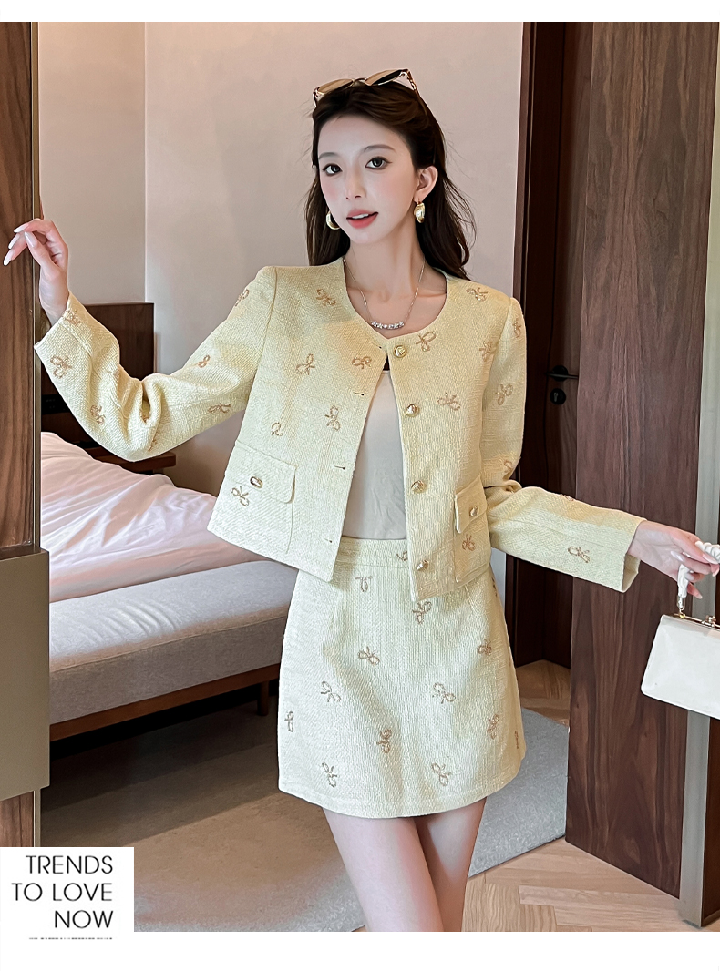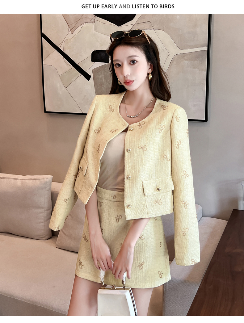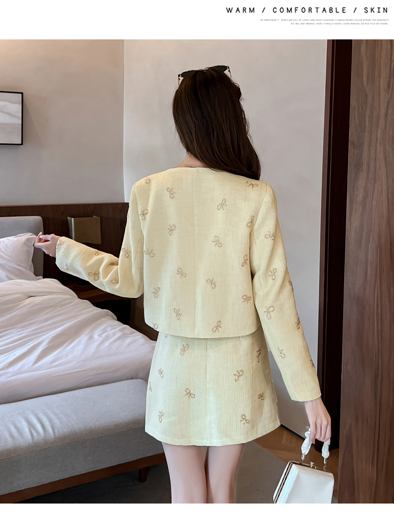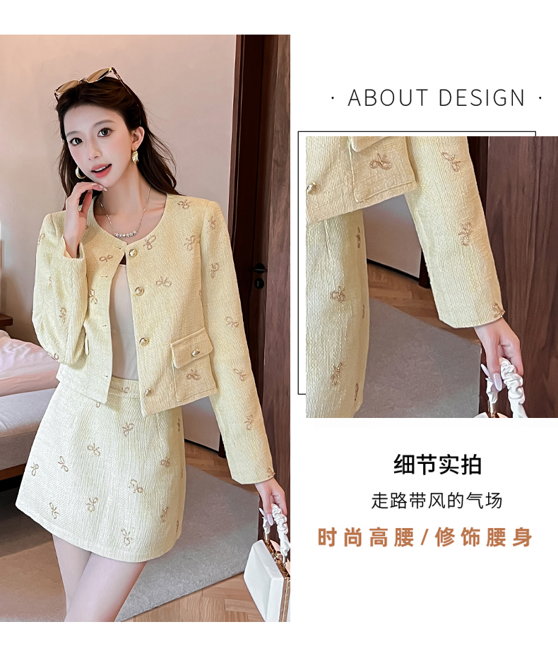 实拍2025早秋法式气质名媛蝴蝶结串珠小香风外套+A字半身裙套装