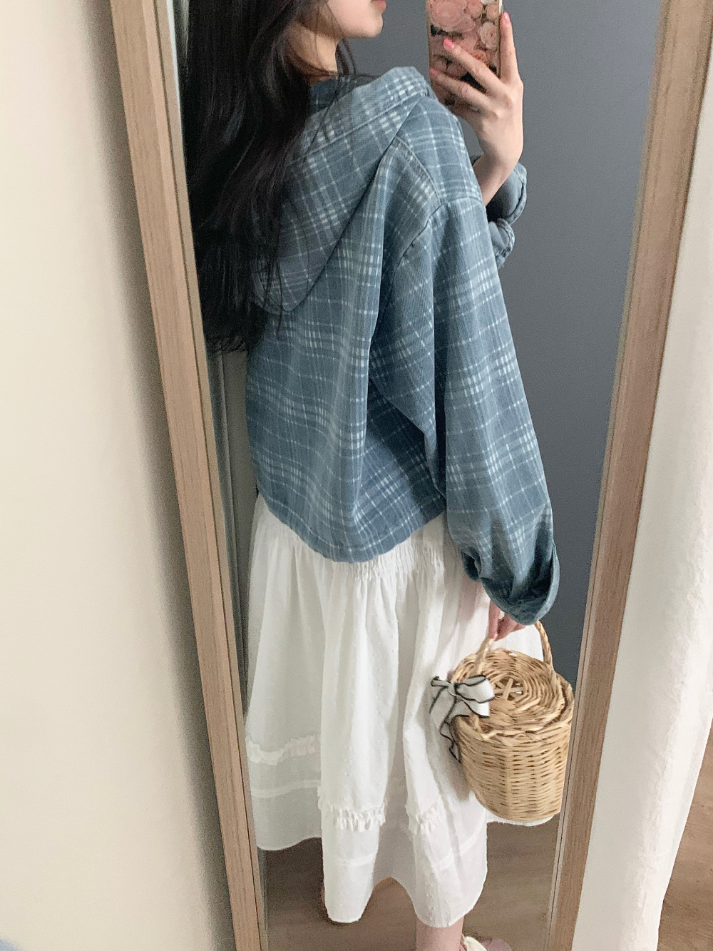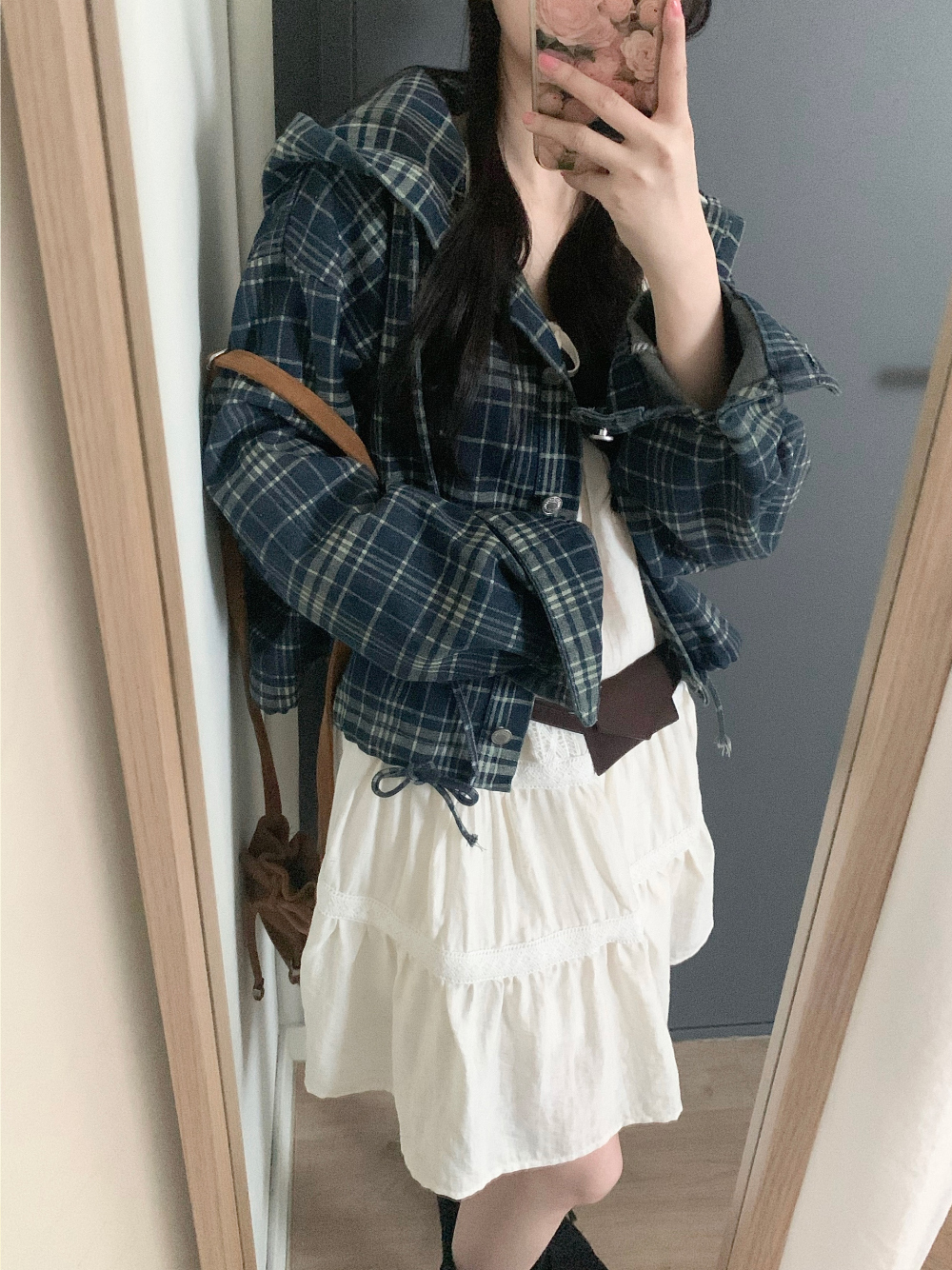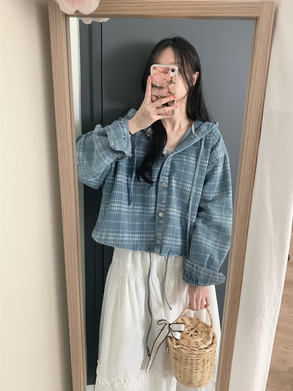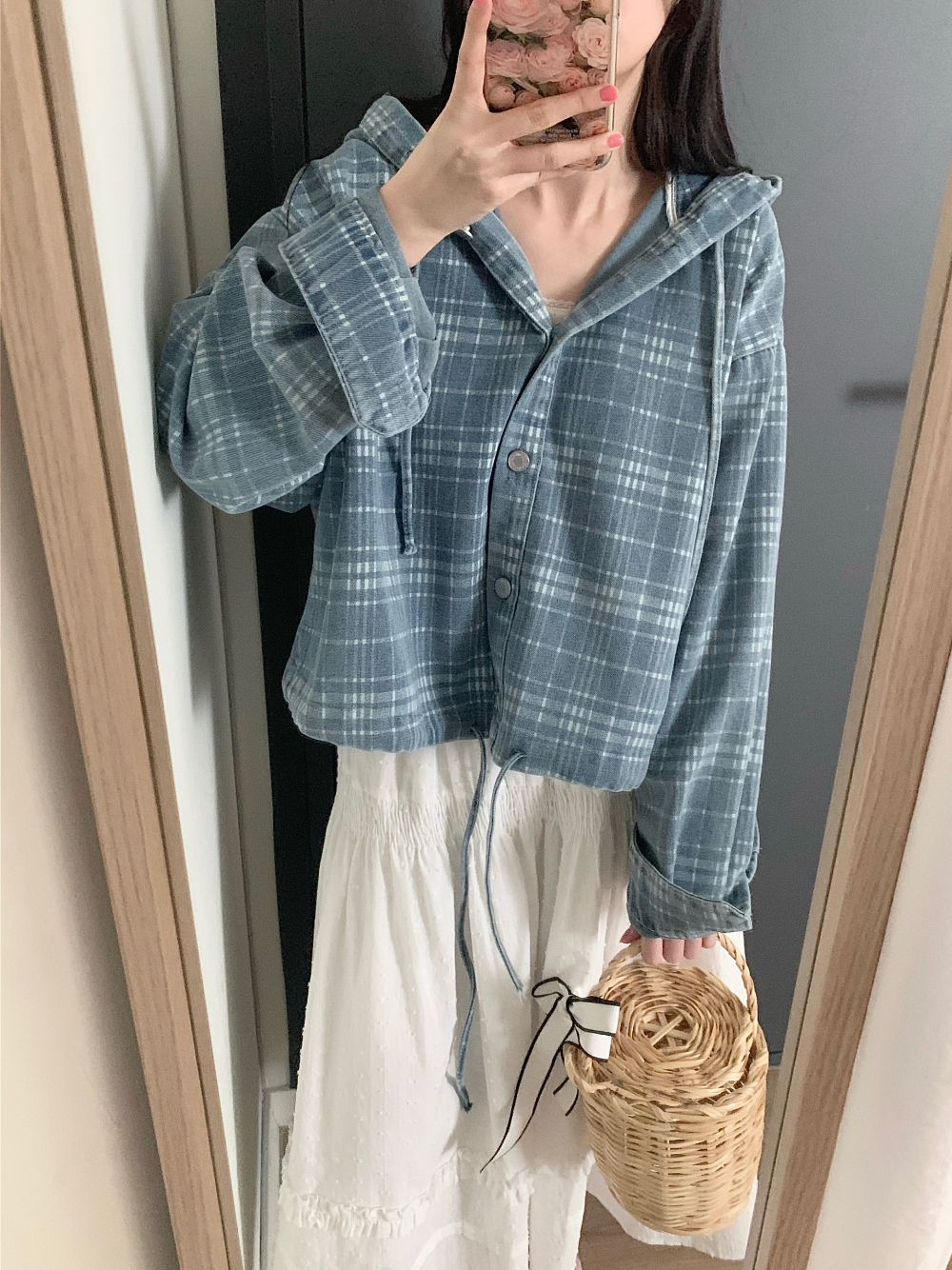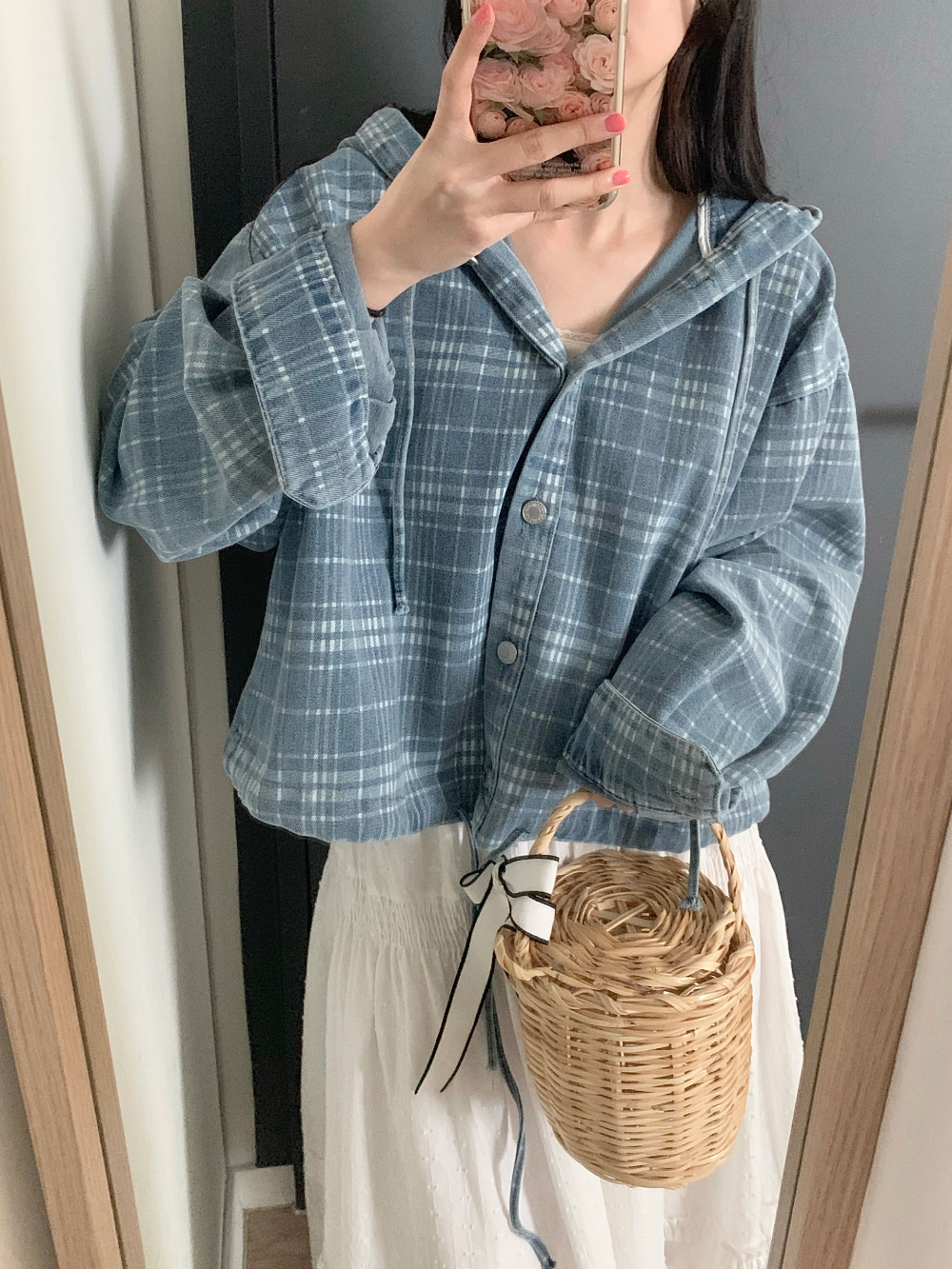 韩版复古苏格兰格纹连帽牛仔外套女秋季新款抽绳短款上衣