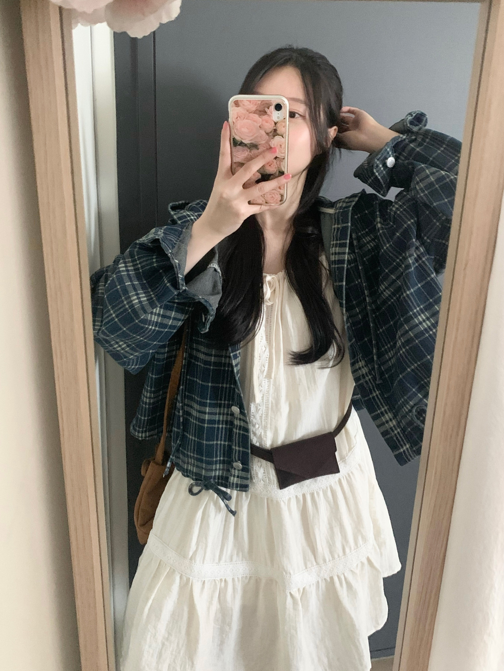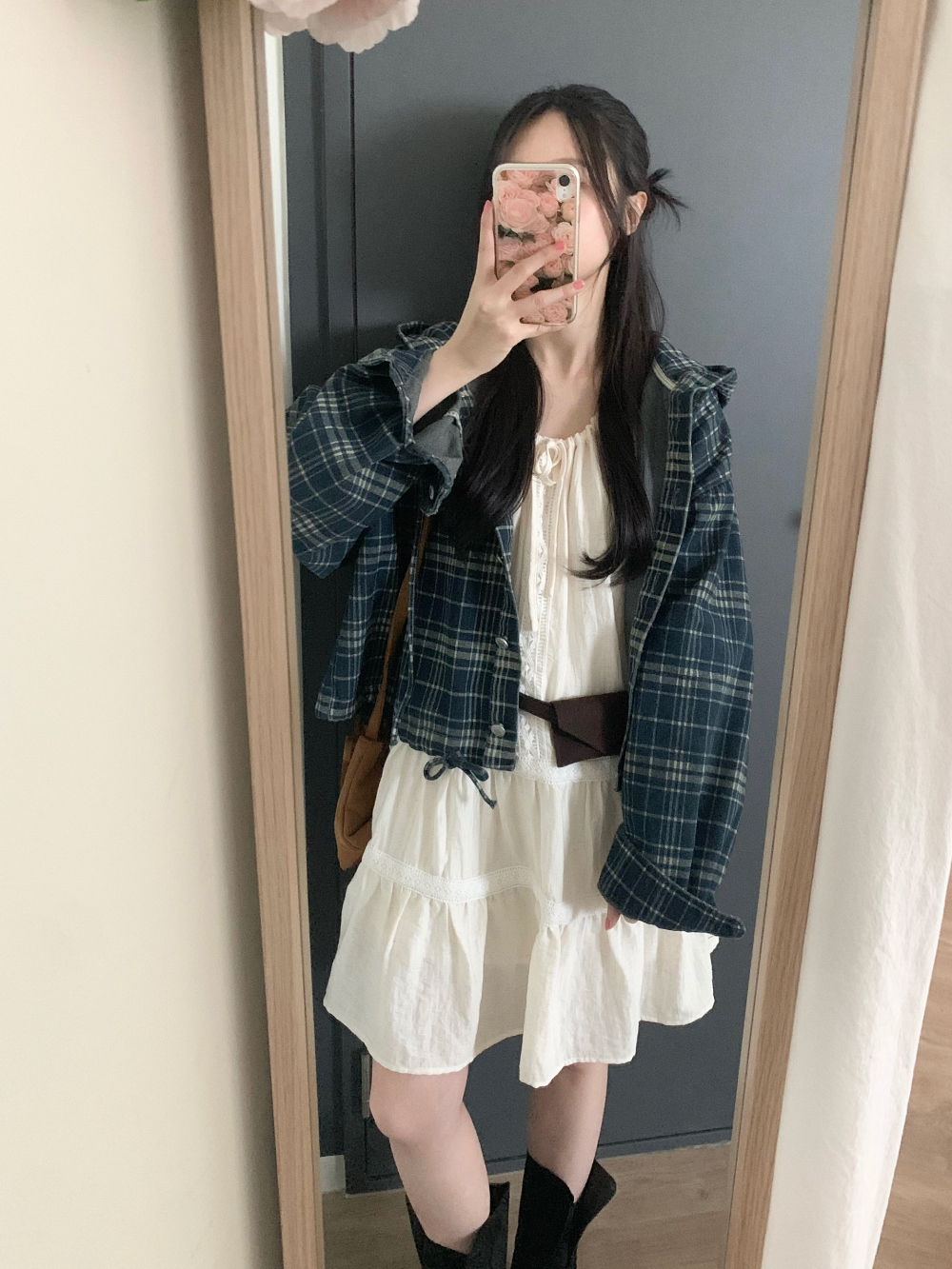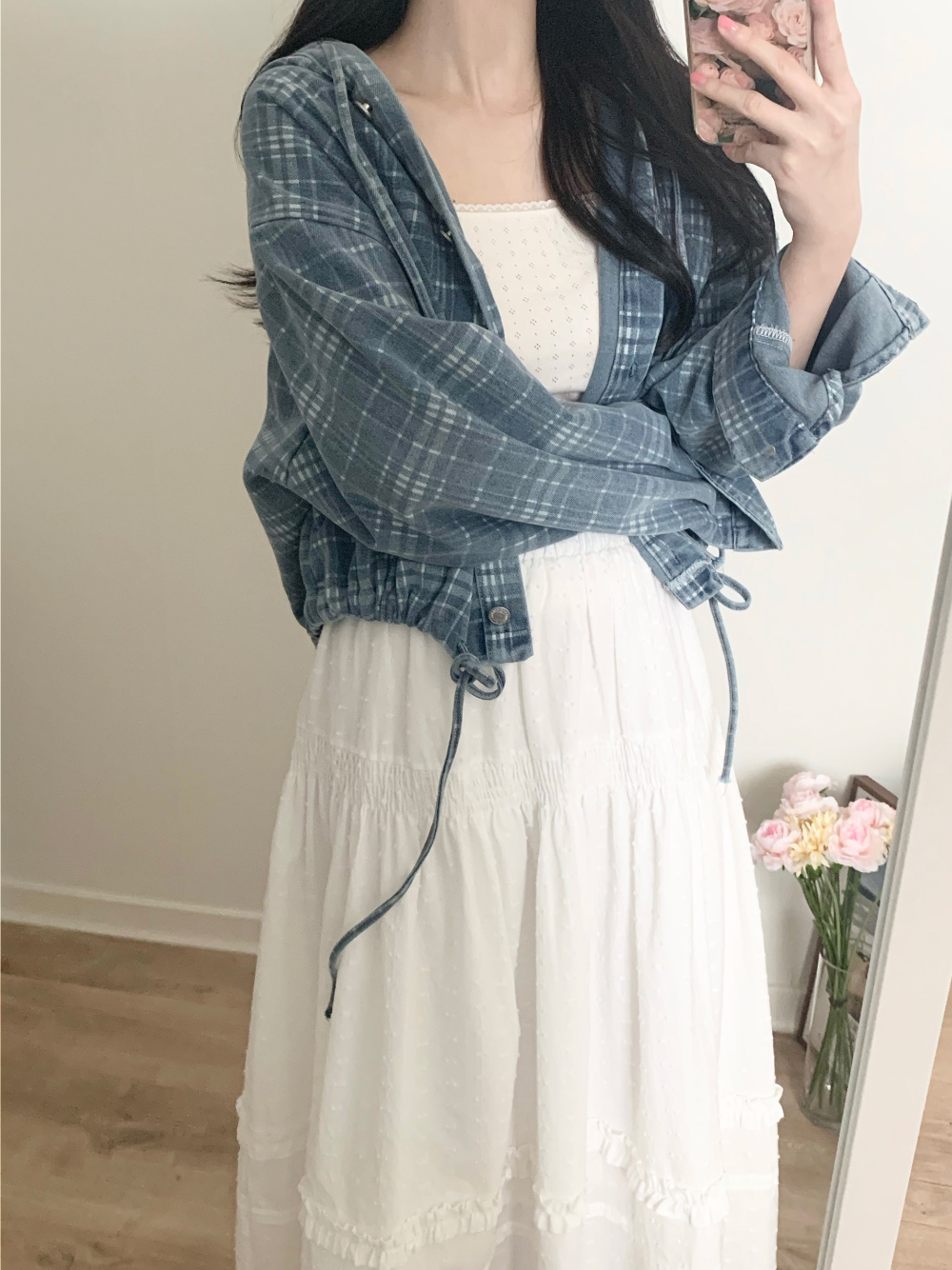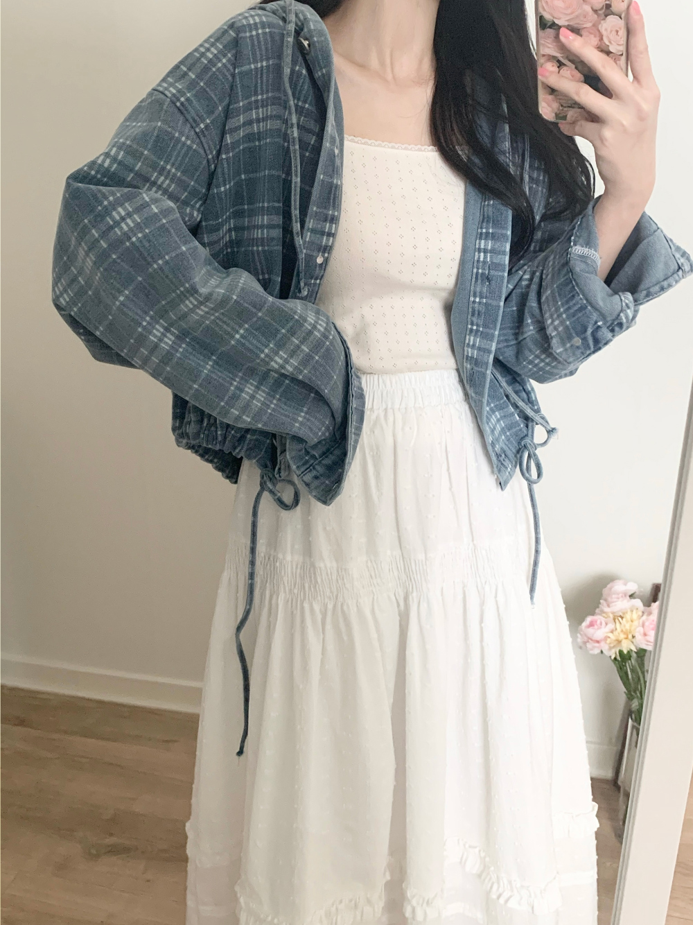 韩版复古苏格兰格纹连帽牛仔外套女秋季新款抽绳短款上衣