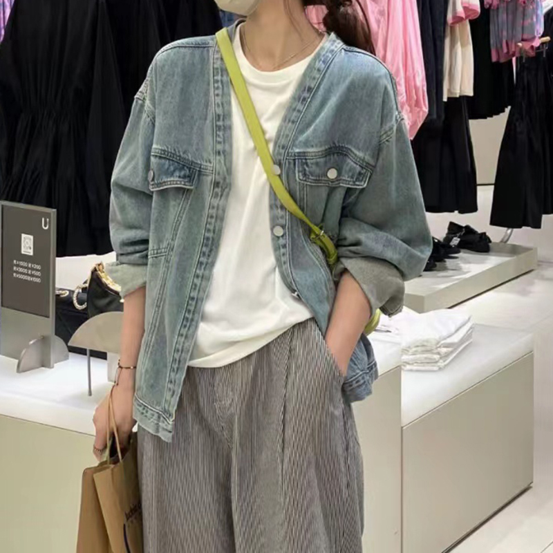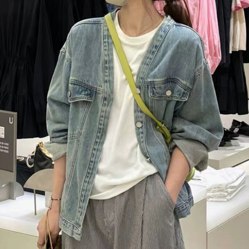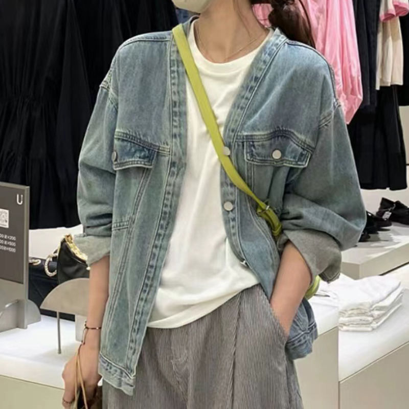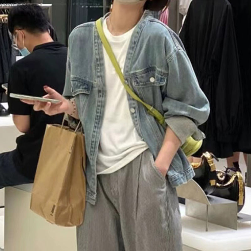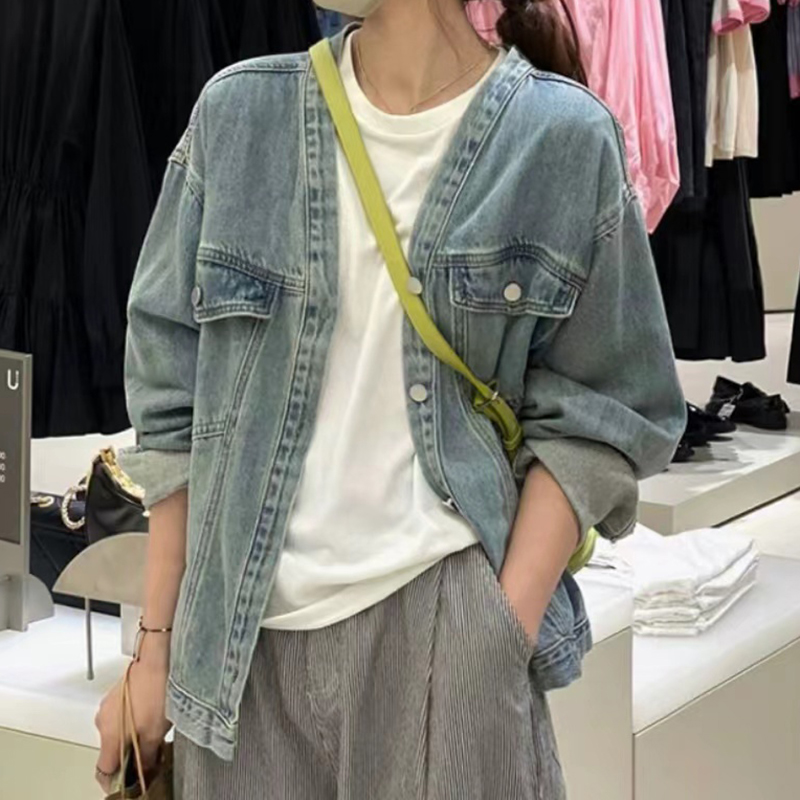 韩版设计感V领牛仔夹克上衣 宽松开衫短款牛仔外套