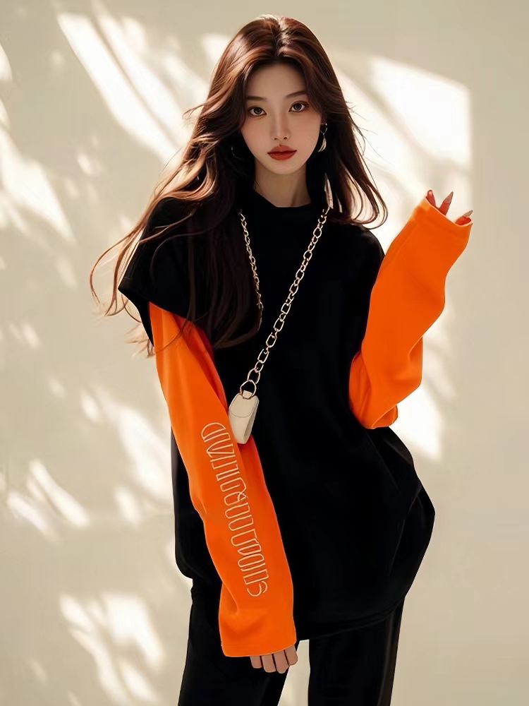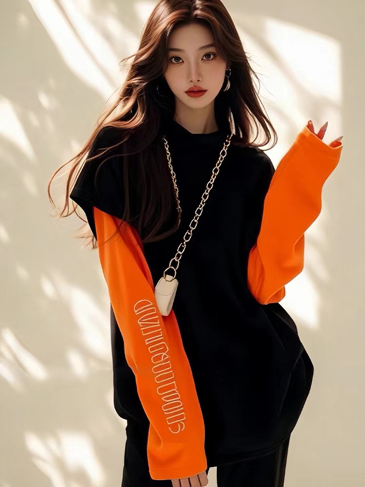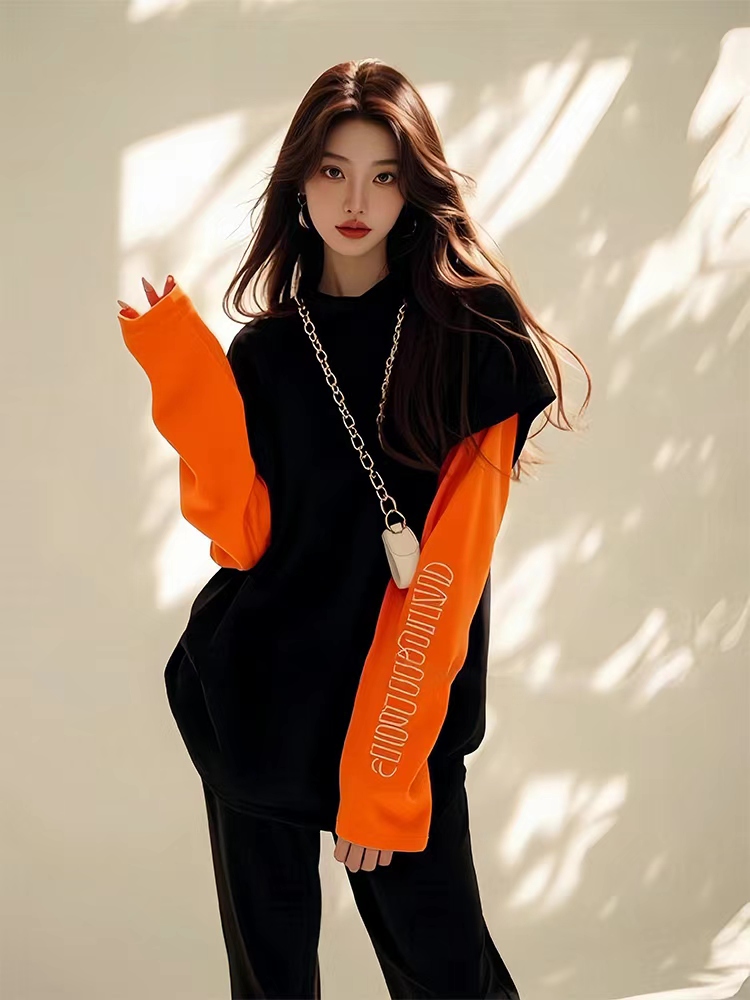 2025秋季洋气独特别致绝美漂亮小上衣美式复古风黑橙色假两件T恤