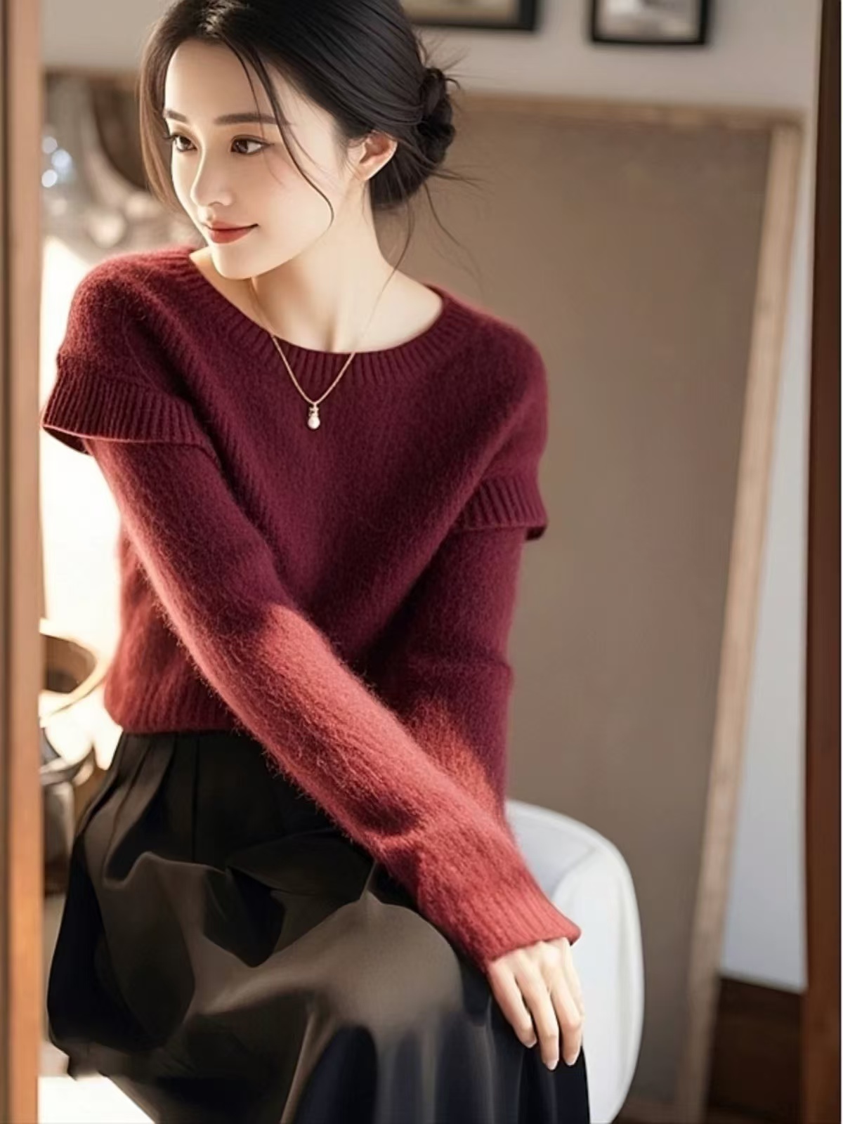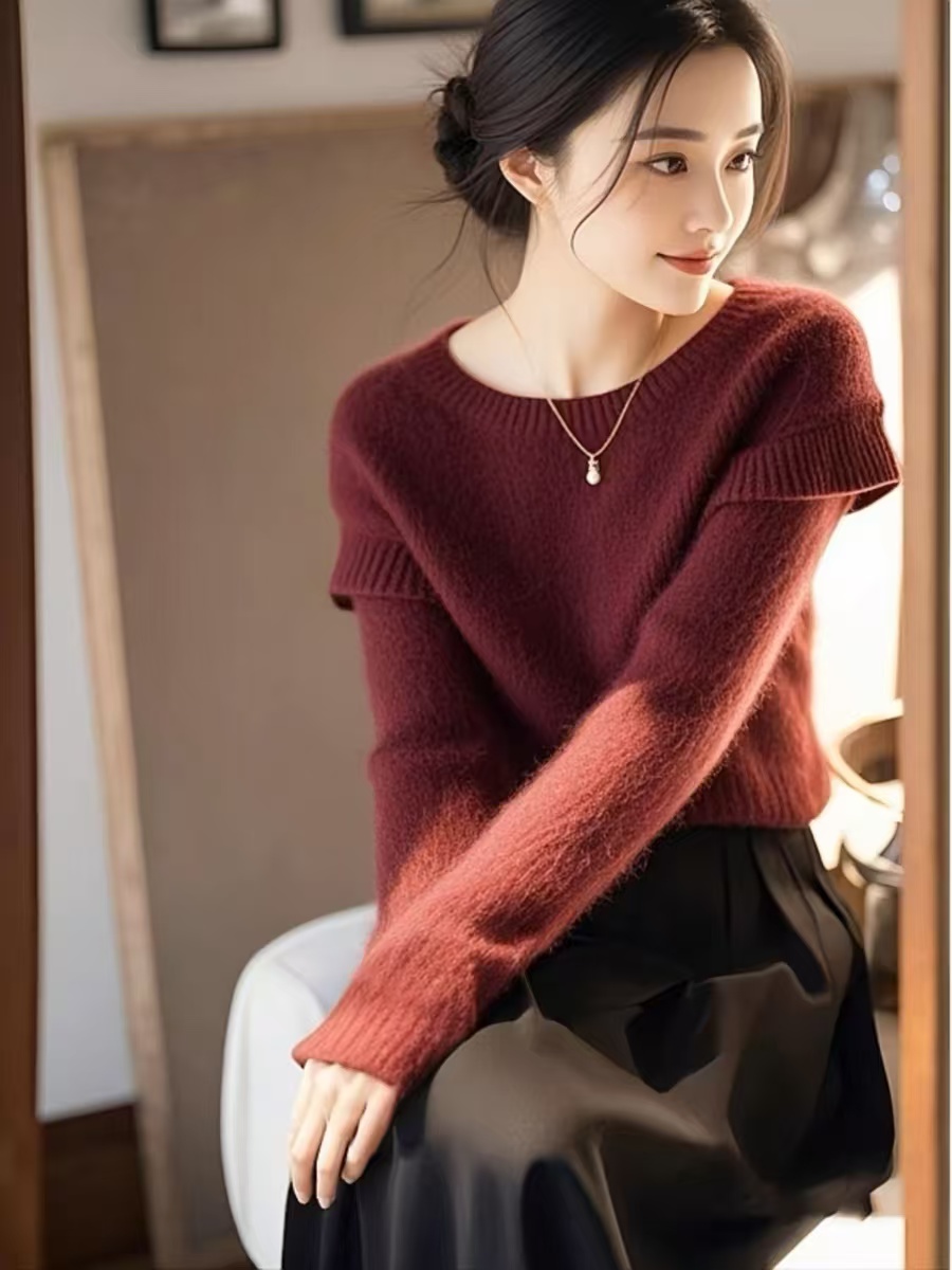 安可拉红色马海毛衣女2025秋冬新款温柔小个子超好看拼接针织上衣