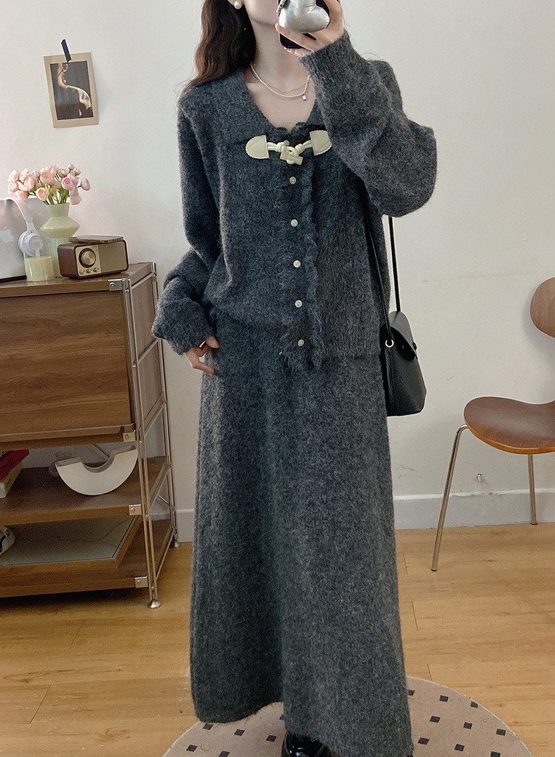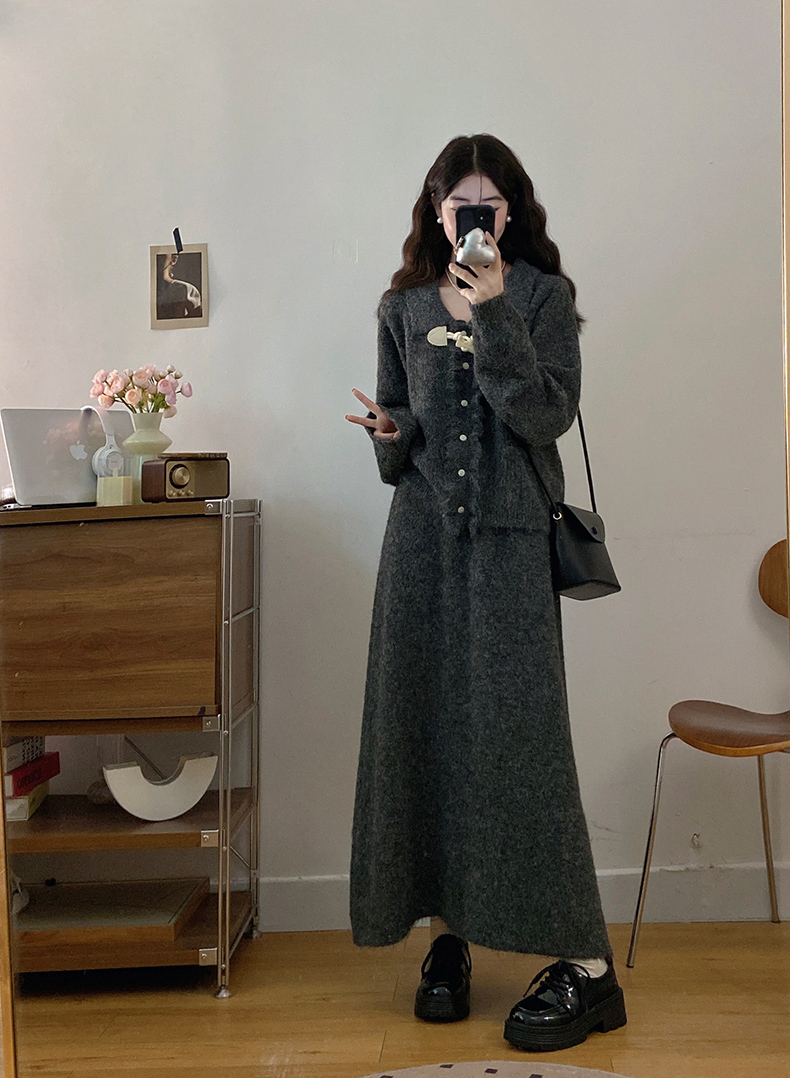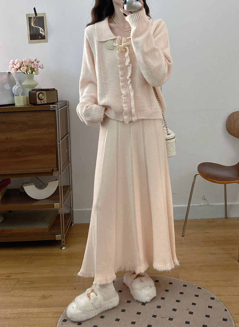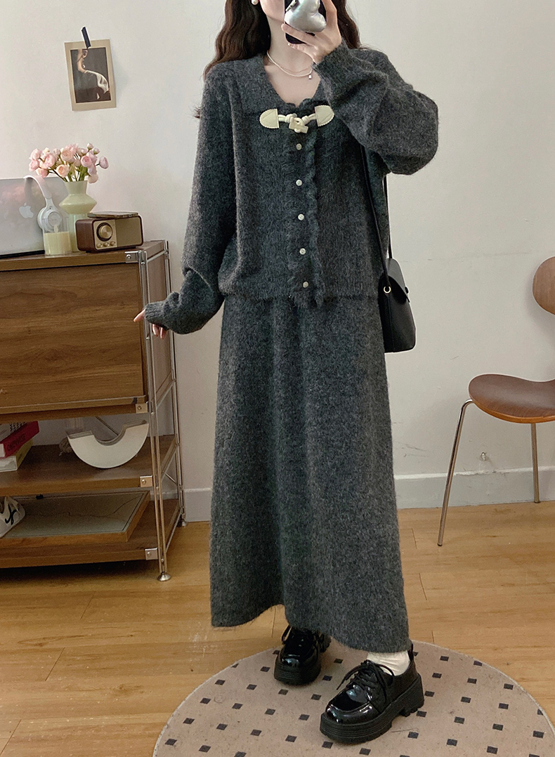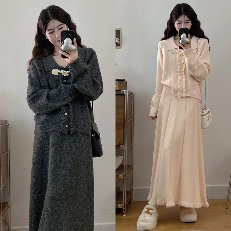 实拍大码慵懒风牛角扣温柔木耳边毛衣开衫针织上衣'+半身裙套装