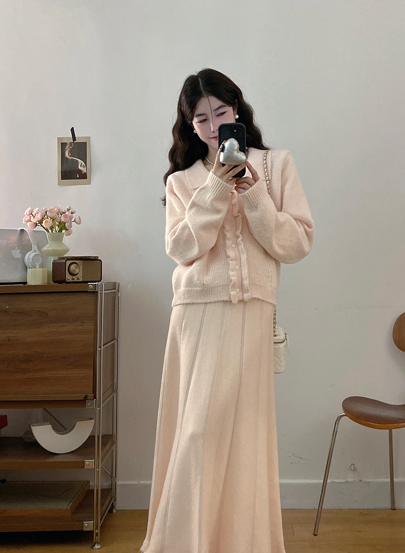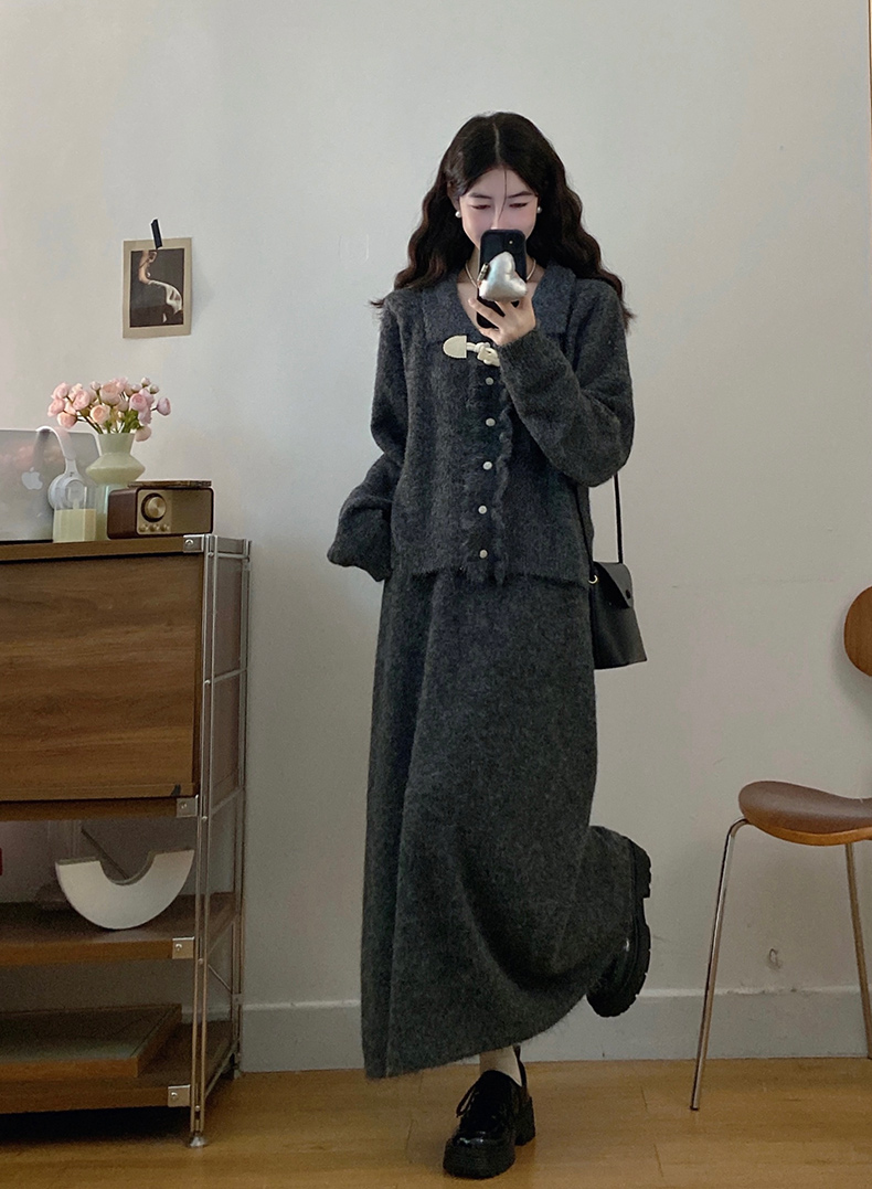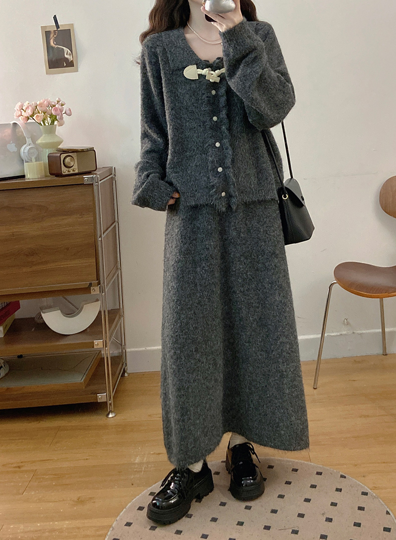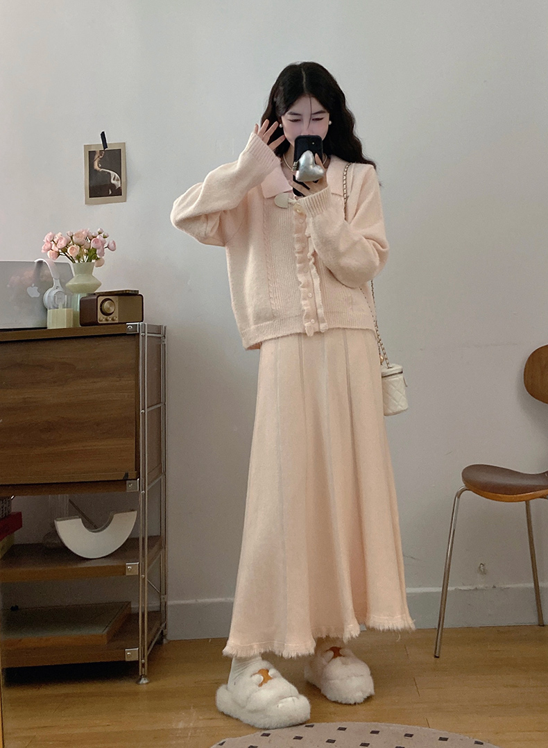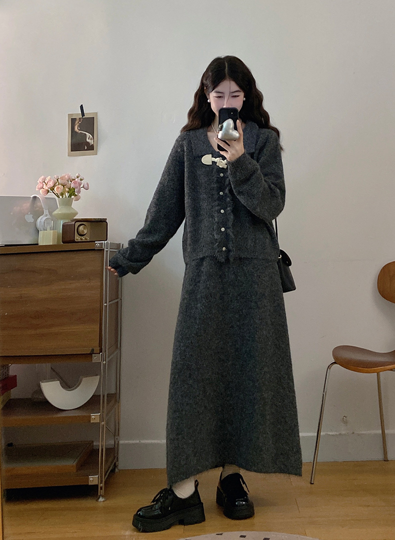 实拍大码慵懒风牛角扣温柔木耳边毛衣开衫针织上衣'+半身裙套装