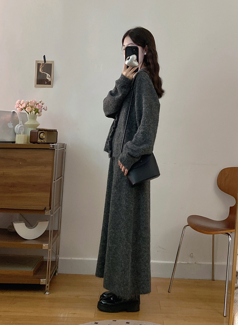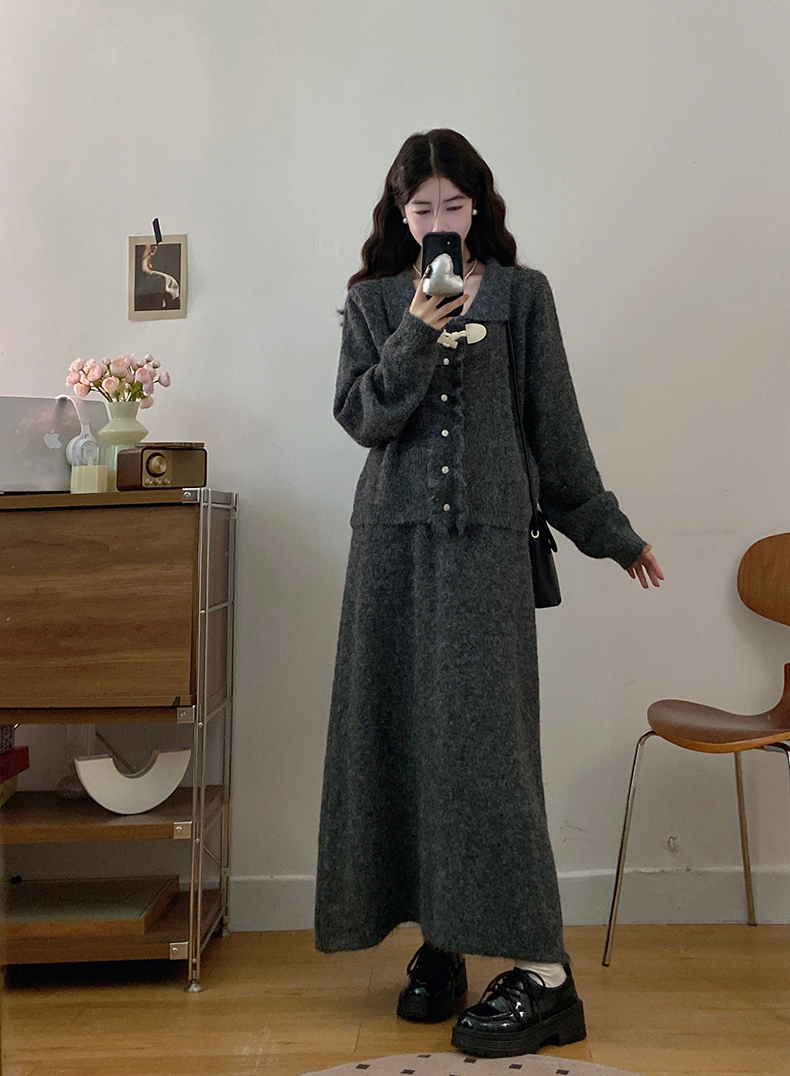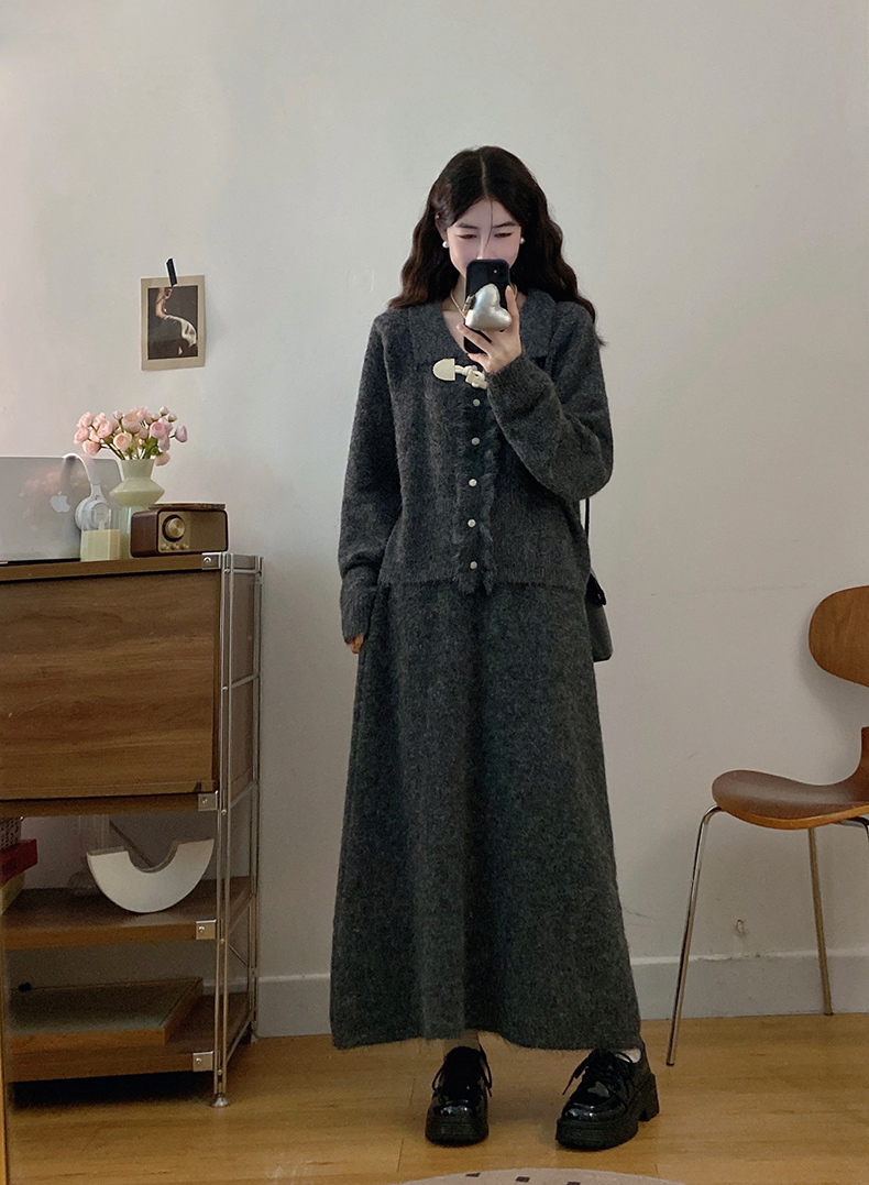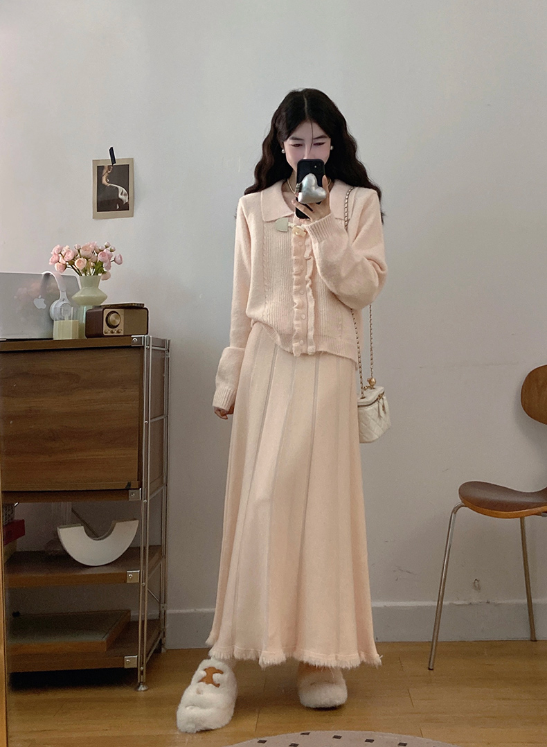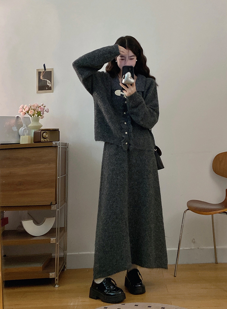 实拍大码慵懒风牛角扣温柔木耳边毛衣开衫针织上衣'+半身裙套装