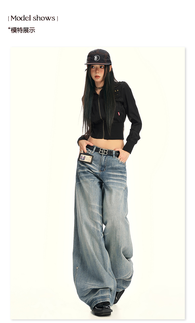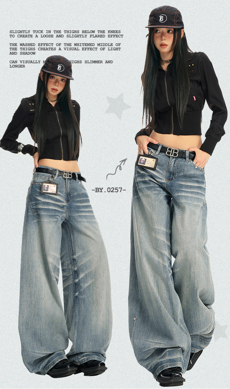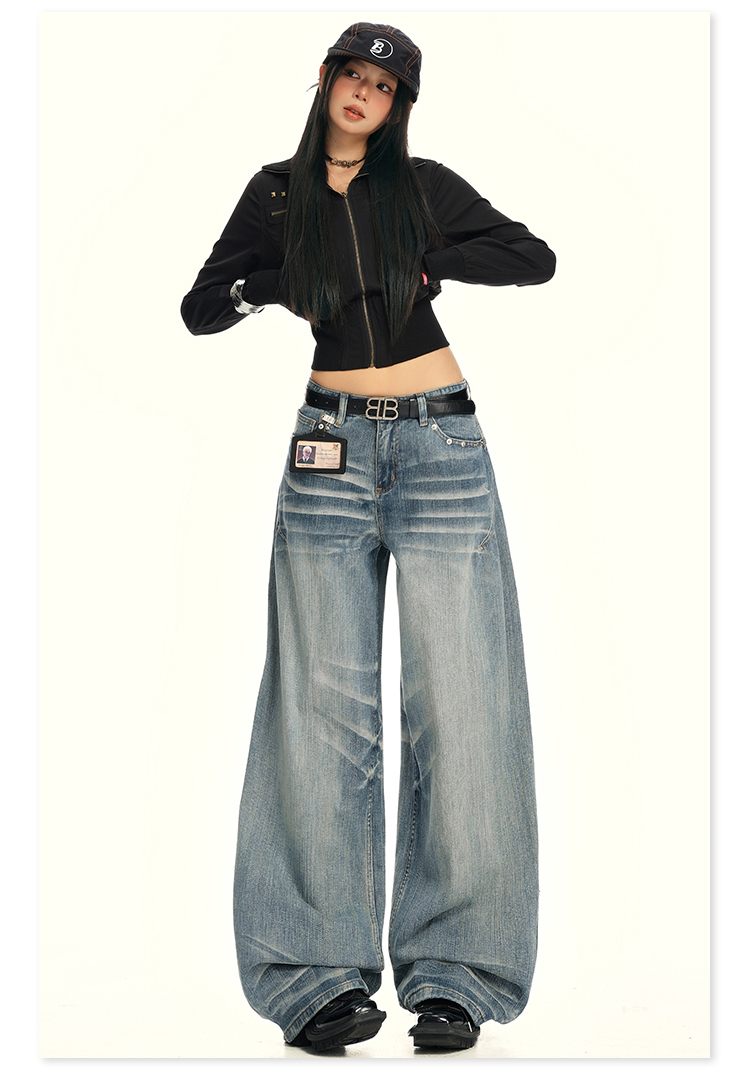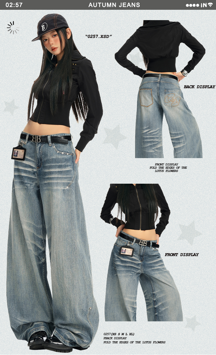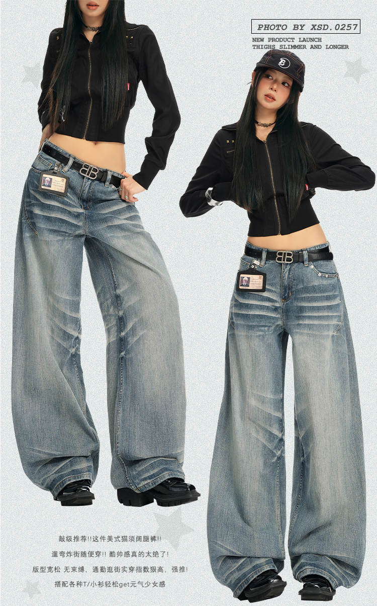 实拍25th ootd!|无侧缝立体猫须休闲牛仔蓝色阔腿裤