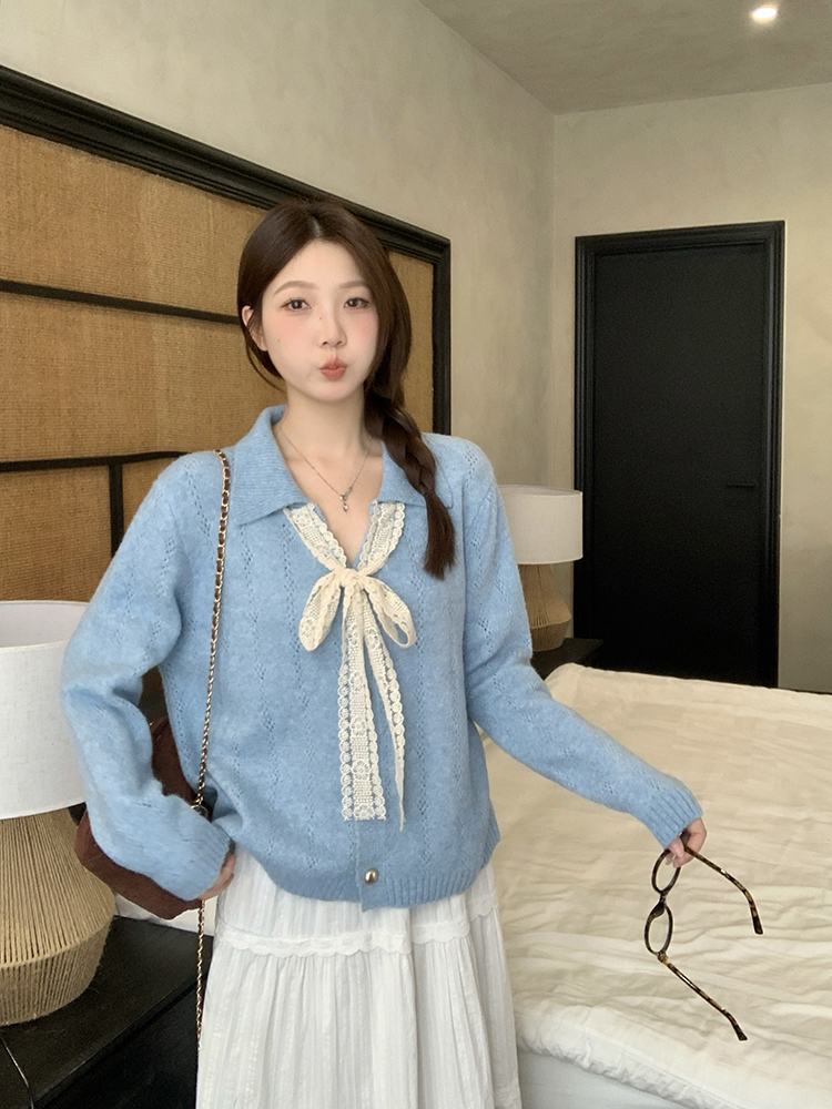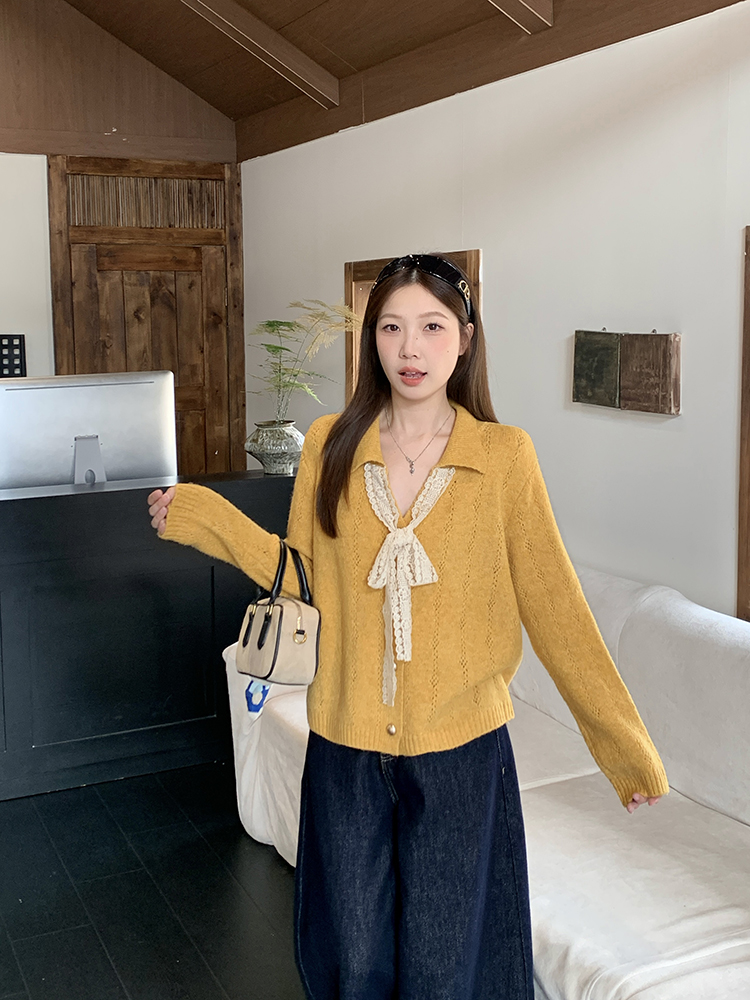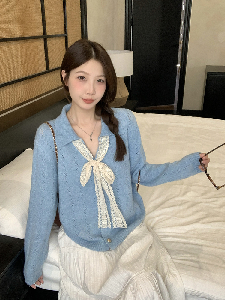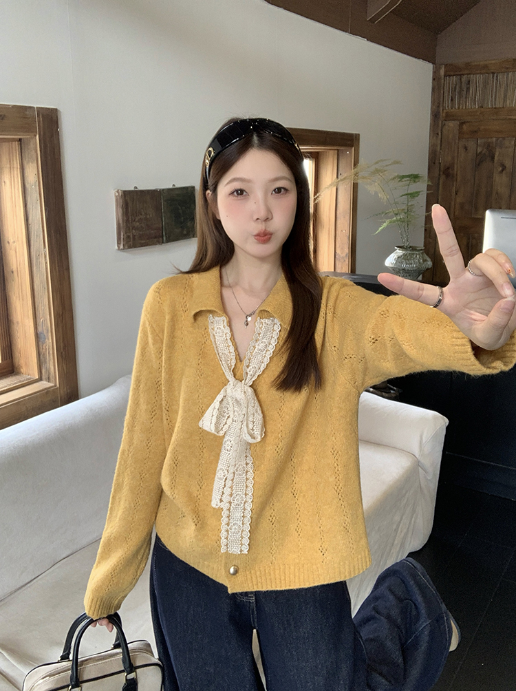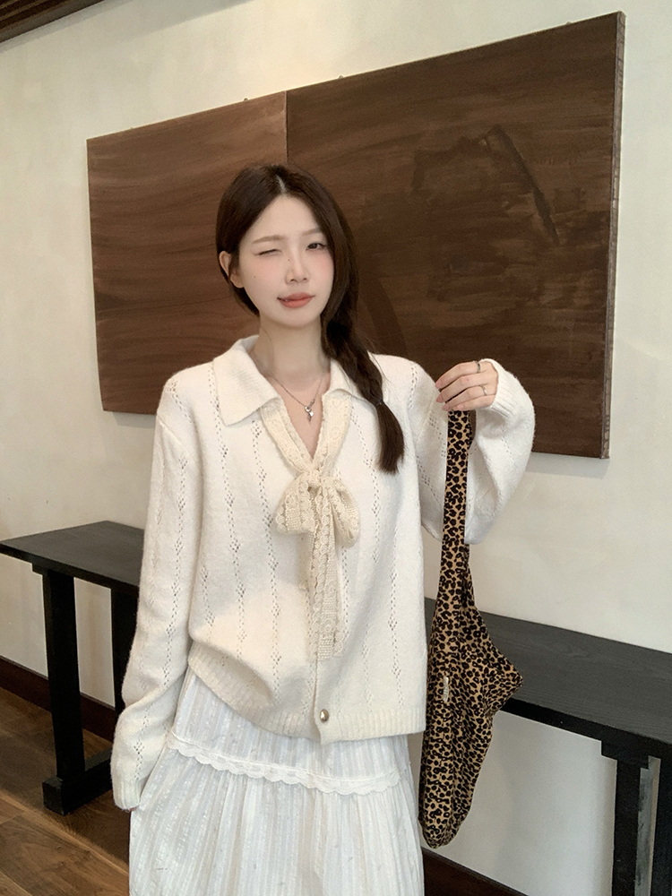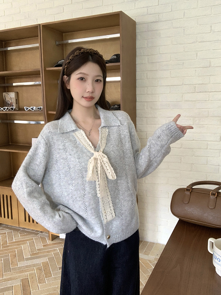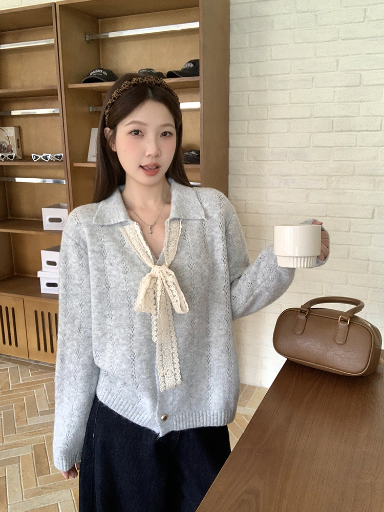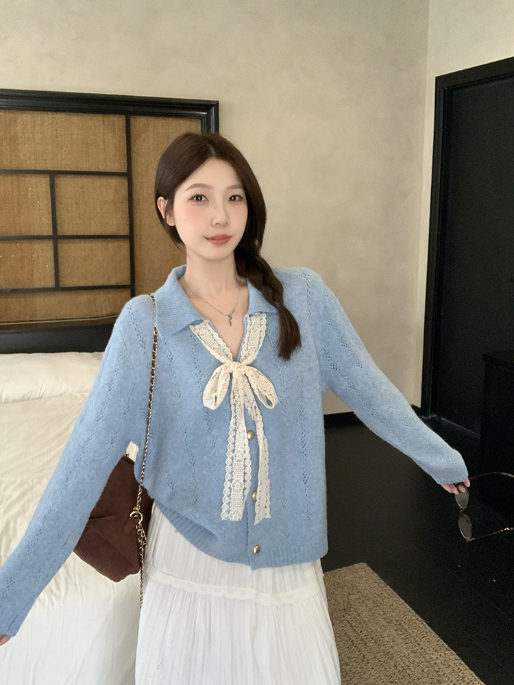 实拍2025秋装新款胖mm大码女温柔风v领系带蝴蝶结针织上衣
