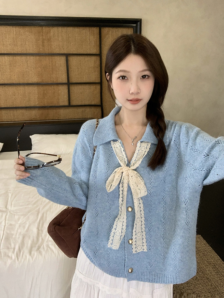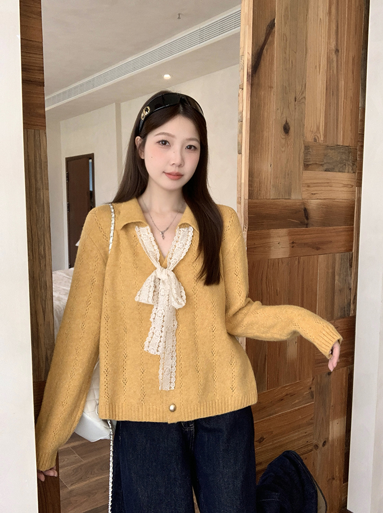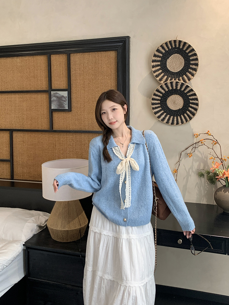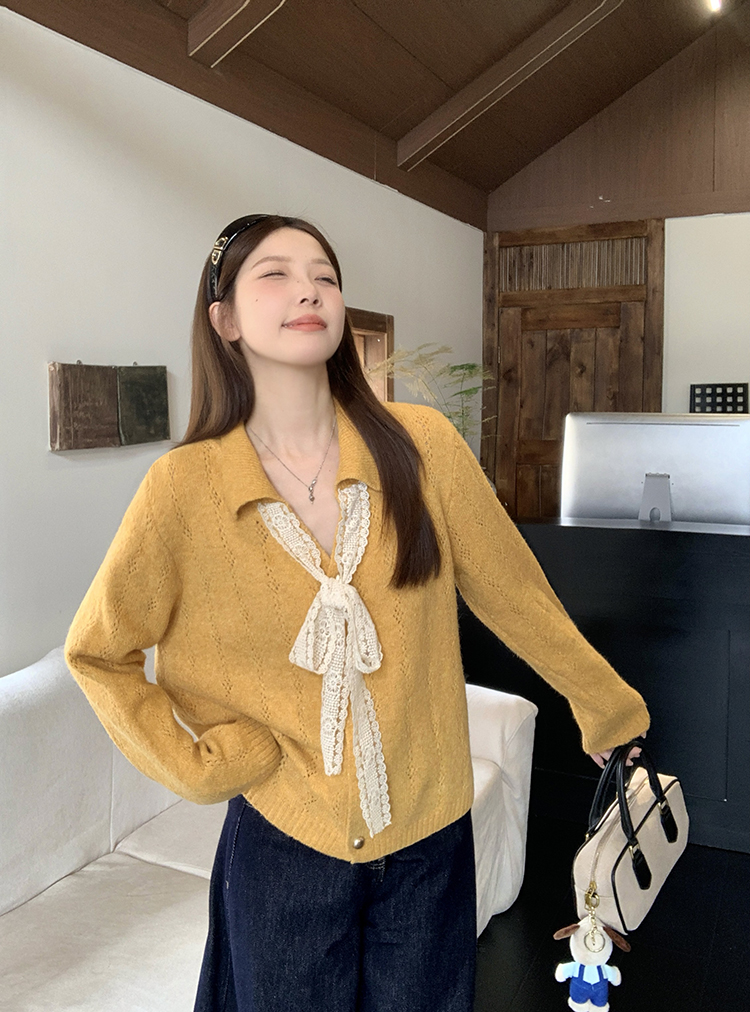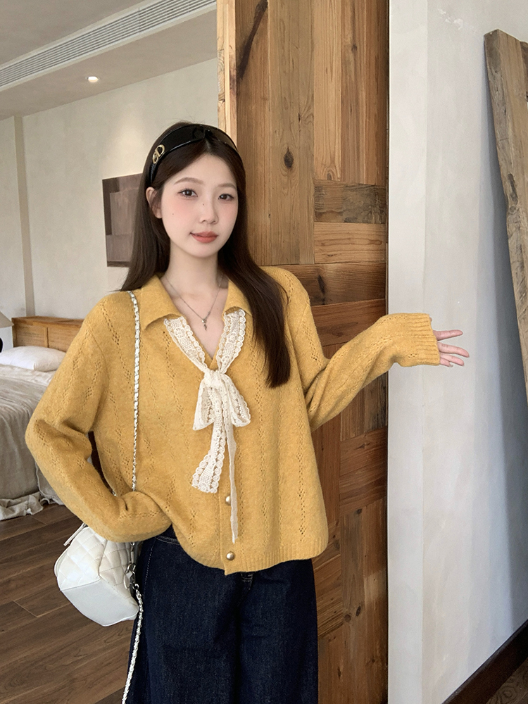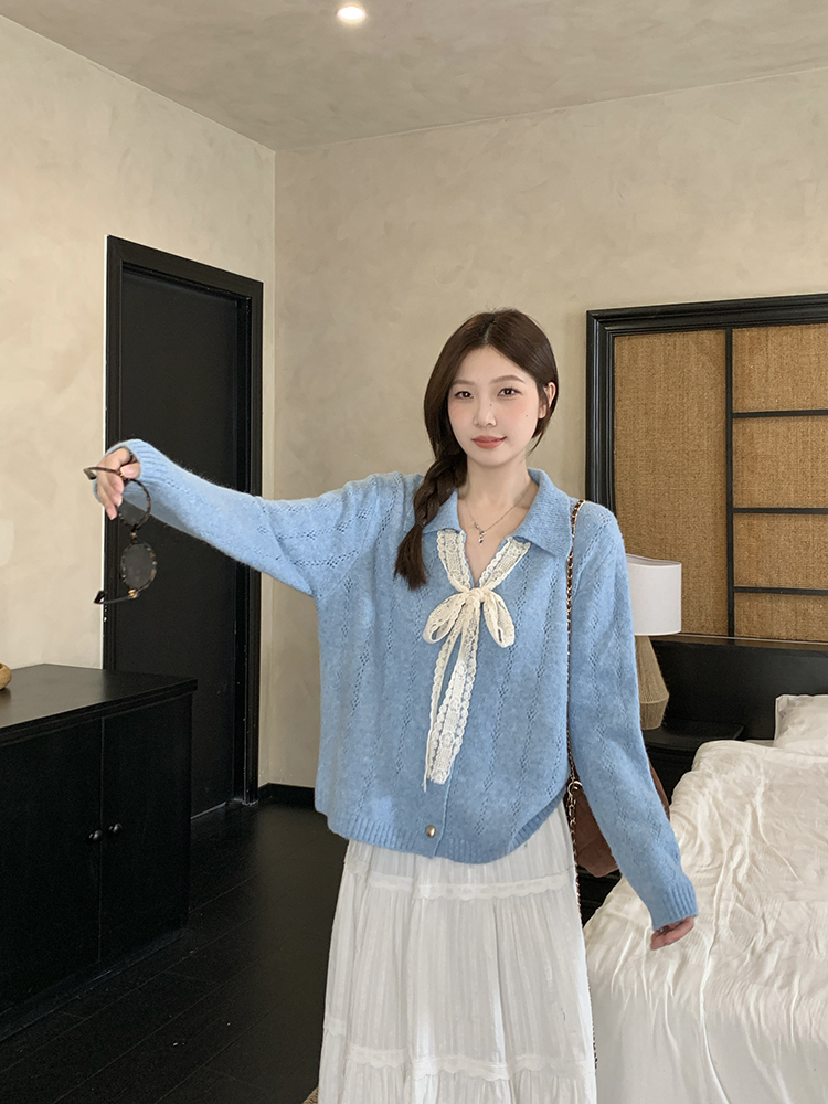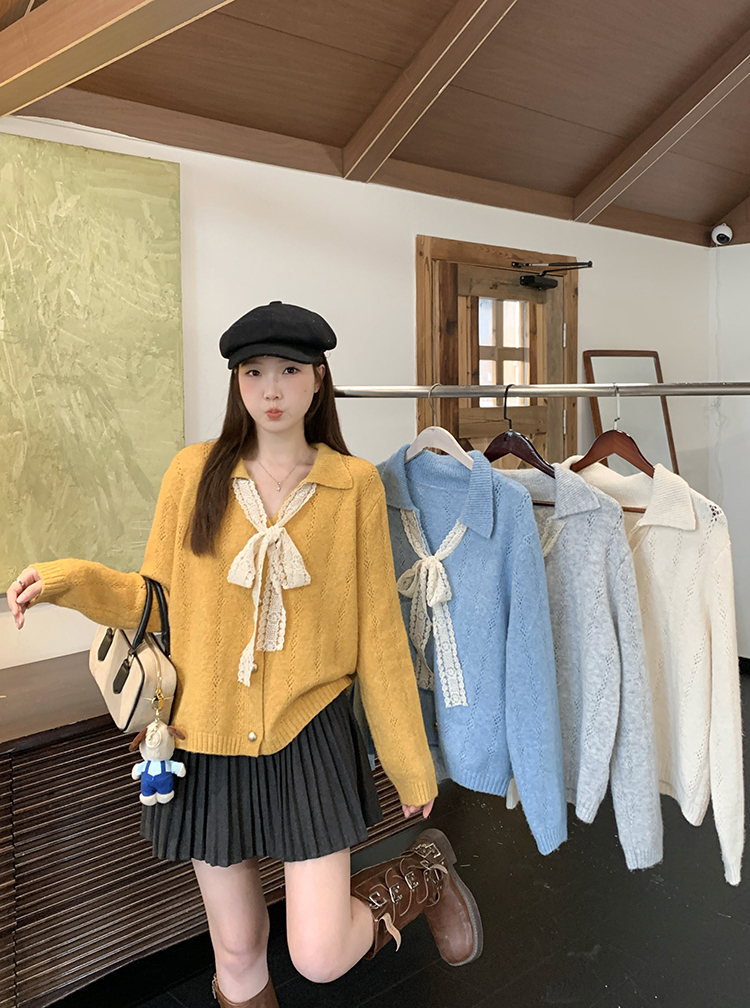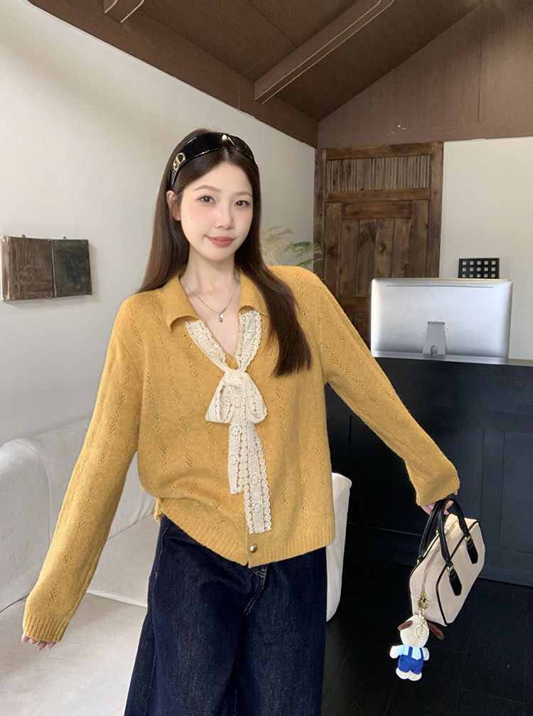 实拍2025秋装新款胖mm大码女温柔风v领系带蝴蝶结针织上衣
