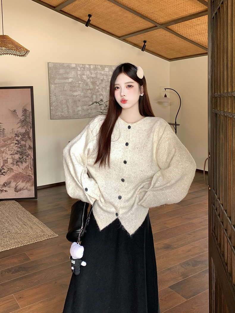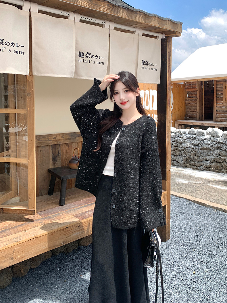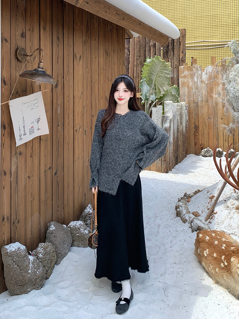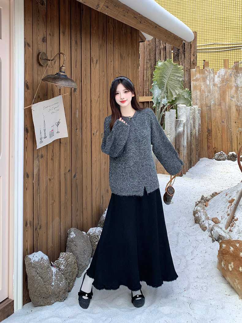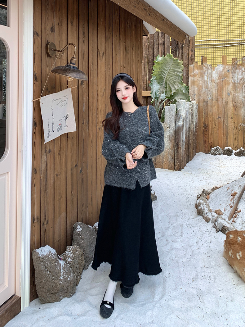 实拍大码秋冬亮闪闪喇叭袖宽松显瘦针织衫毛衣+针织半身裙套装