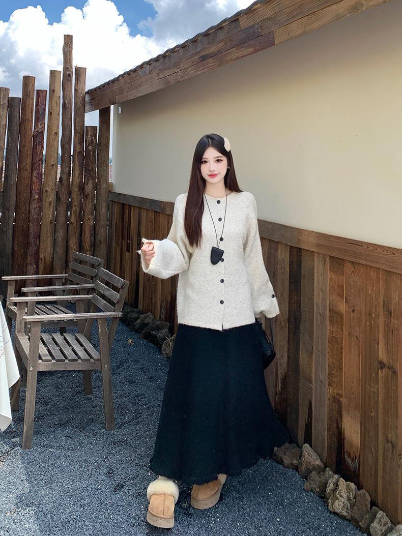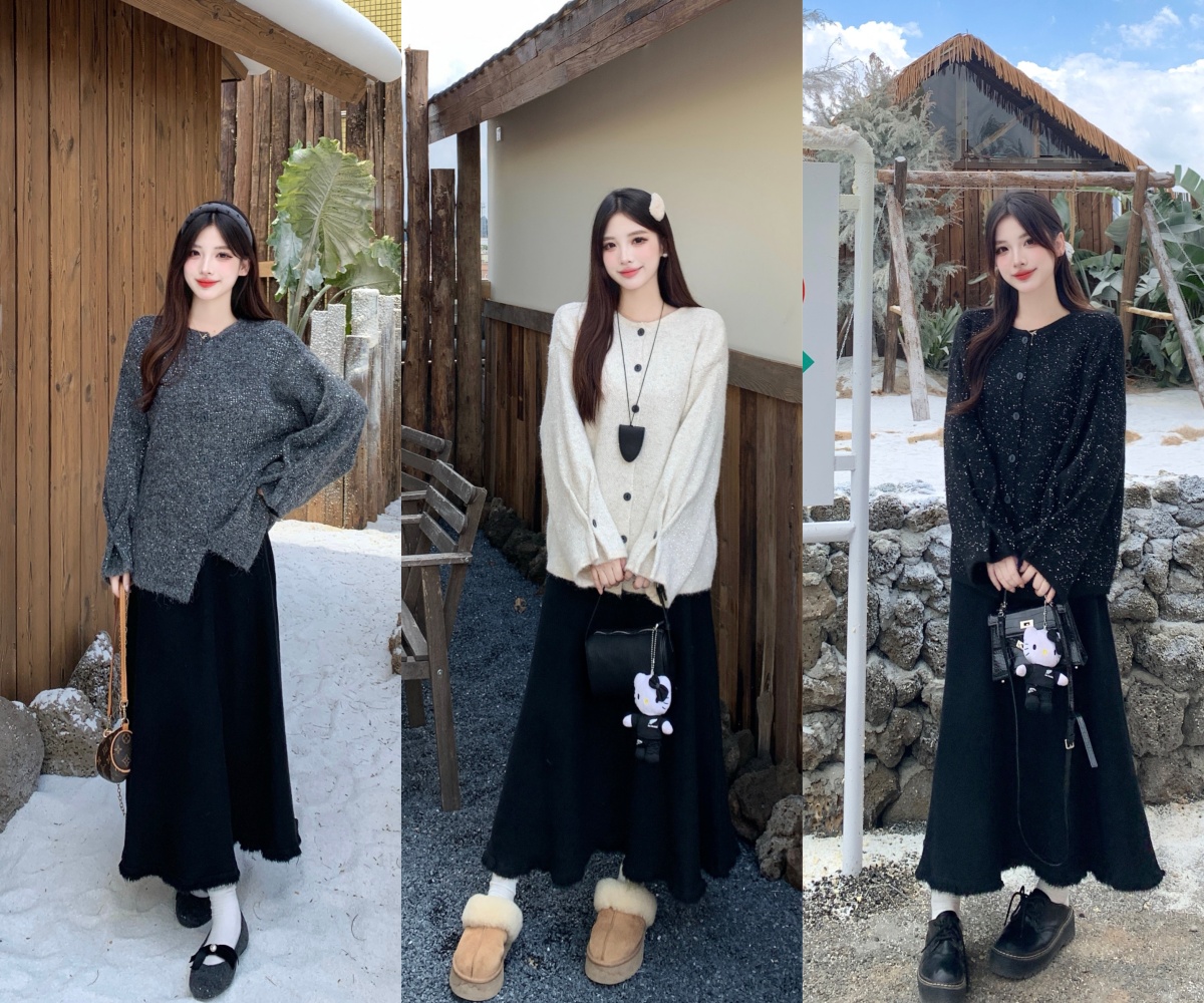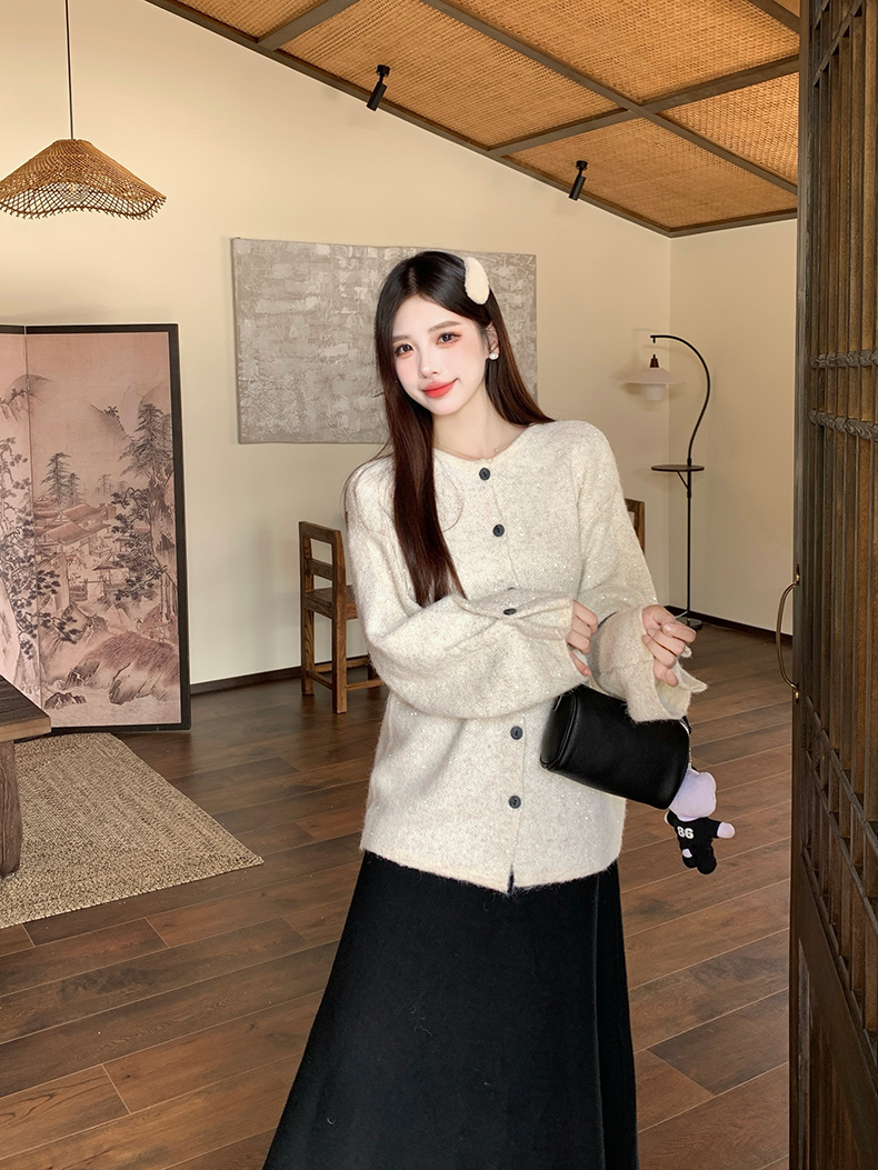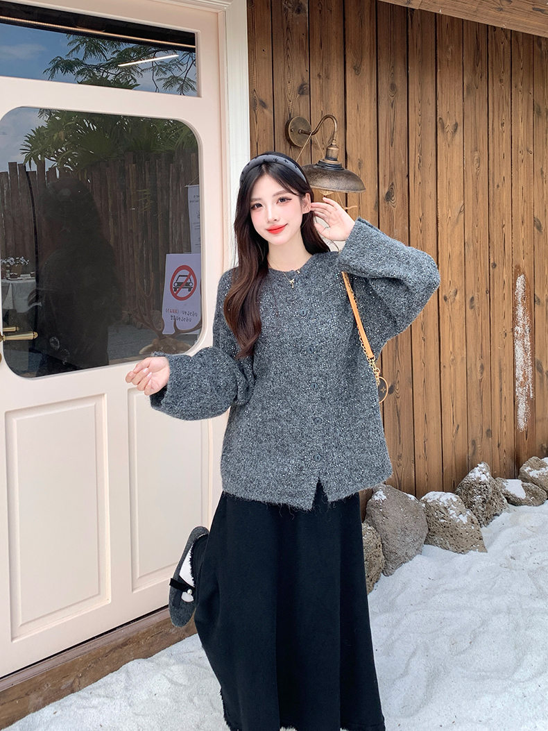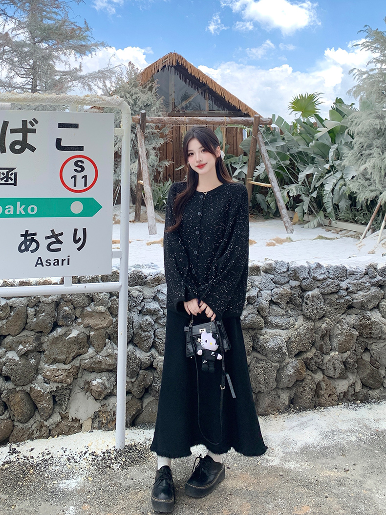 实拍大码秋冬亮闪闪喇叭袖宽松显瘦针织衫毛衣+针织半身裙套装