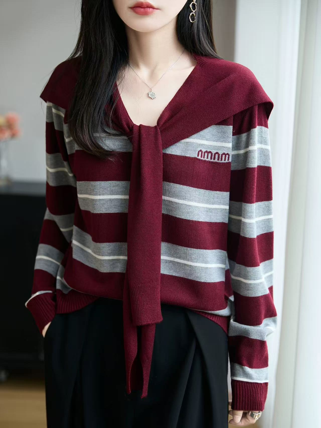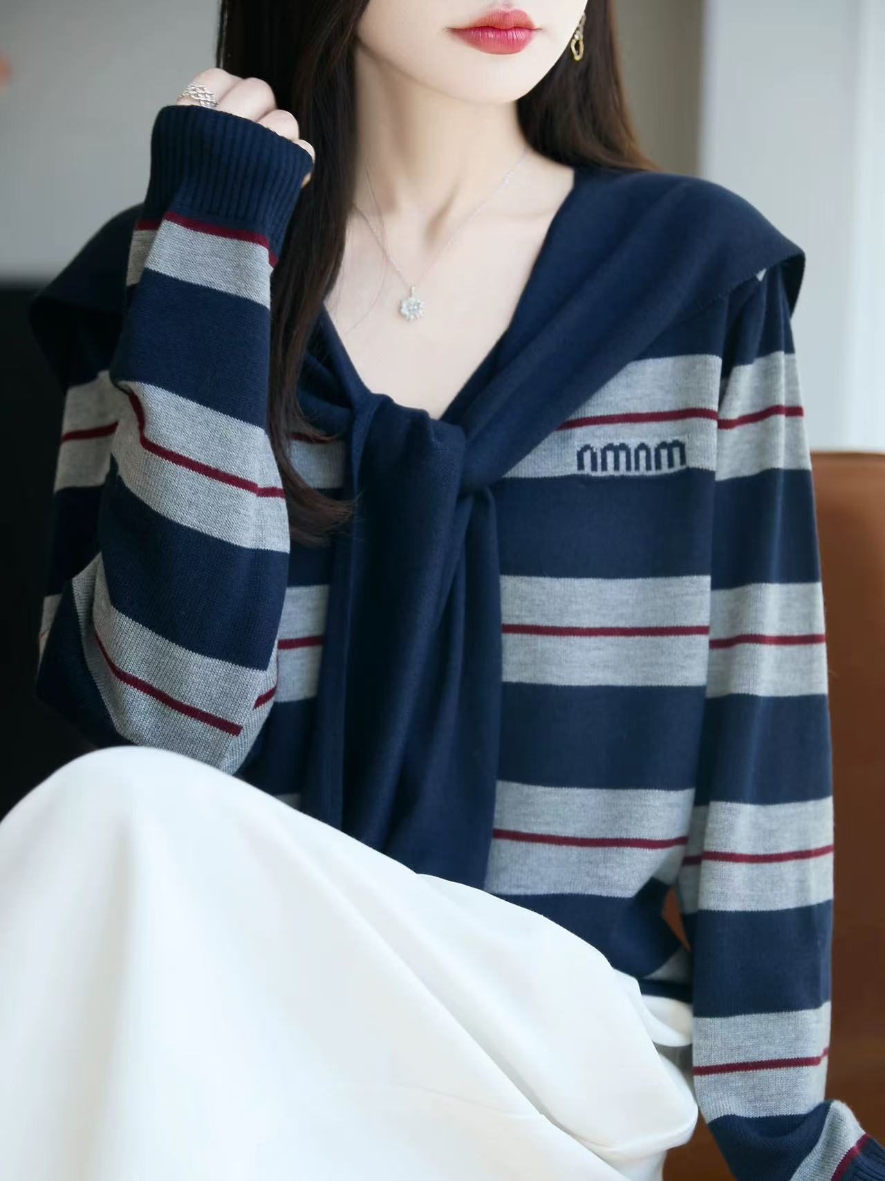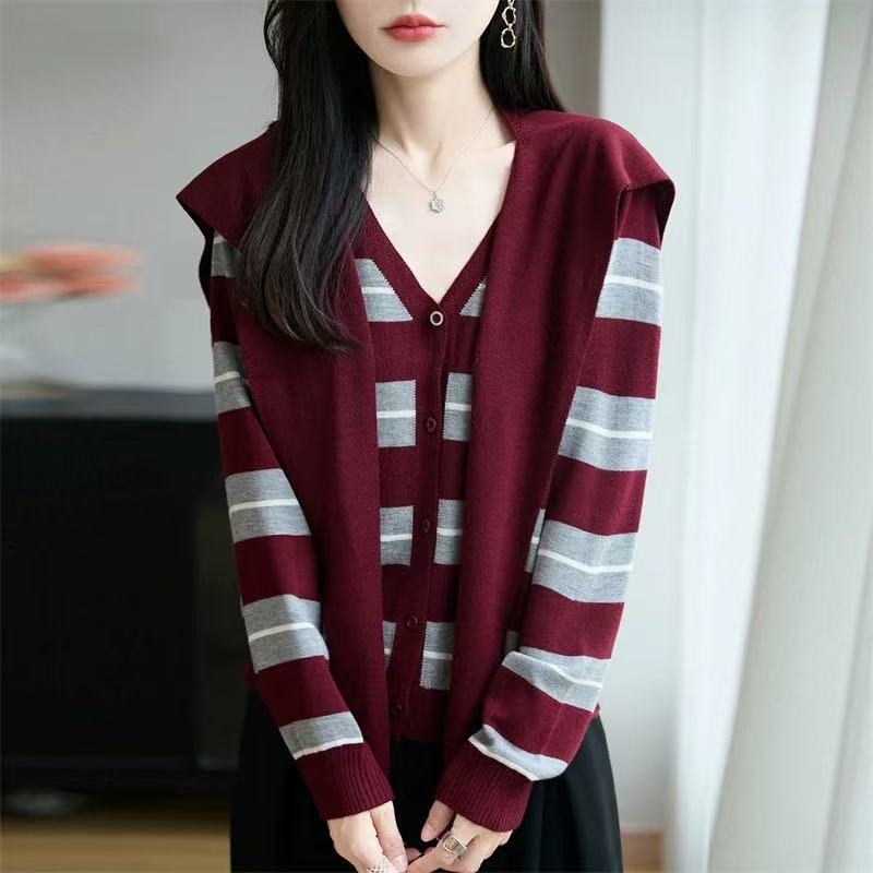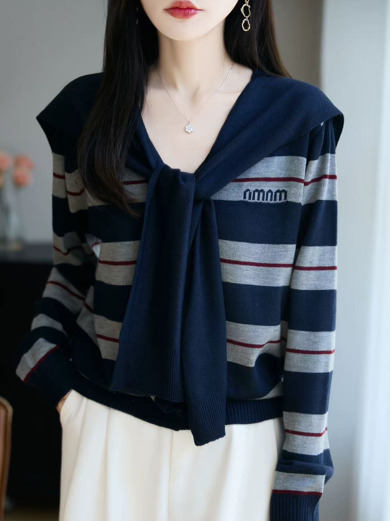 法式撞色条纹假两件披肩针织开衫女短外套毛衣2025宽松设计感上衣