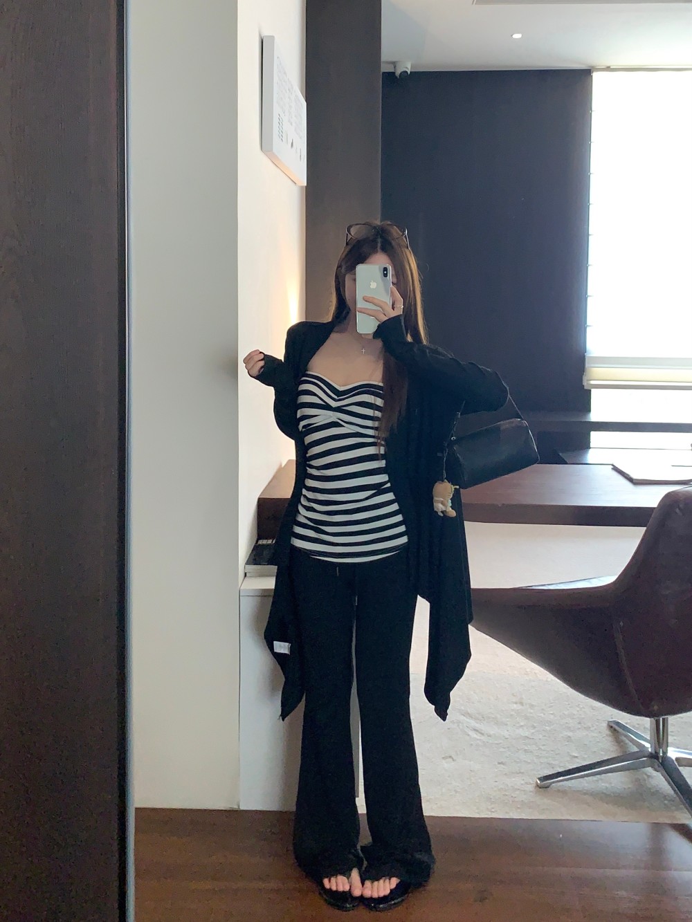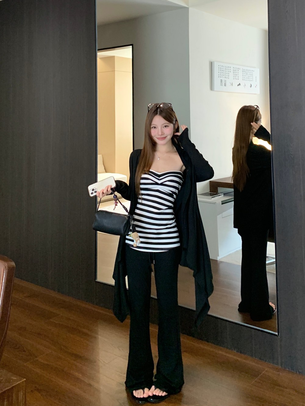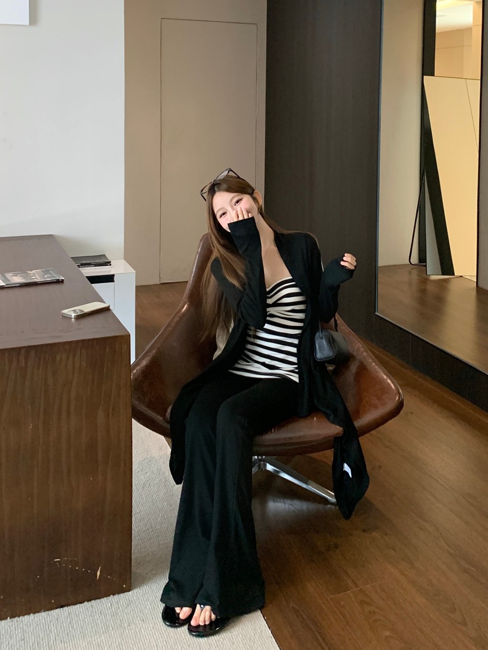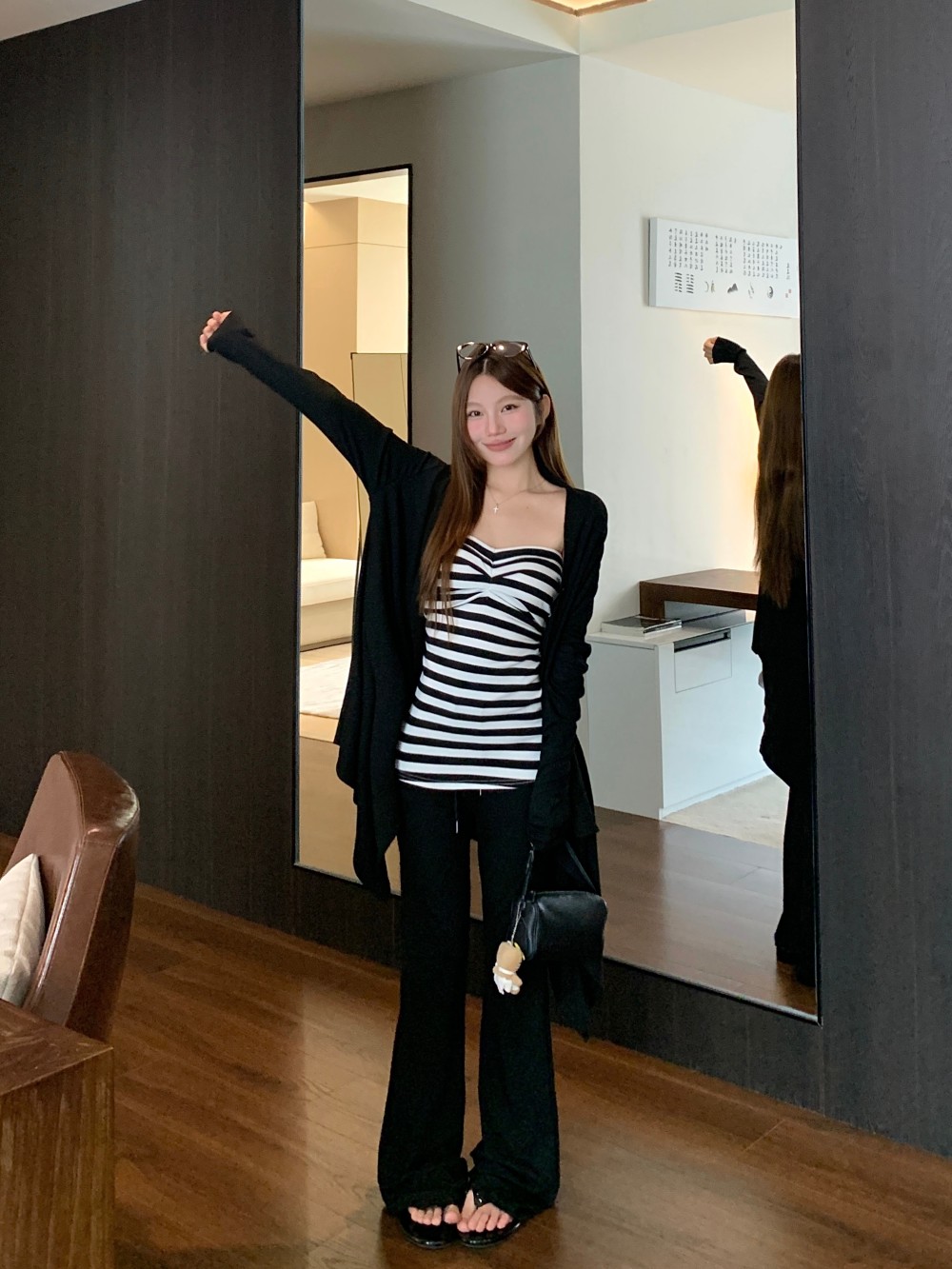慵懒不规则长袖开衫外套条纹抹胸女秋季松弛感套装
