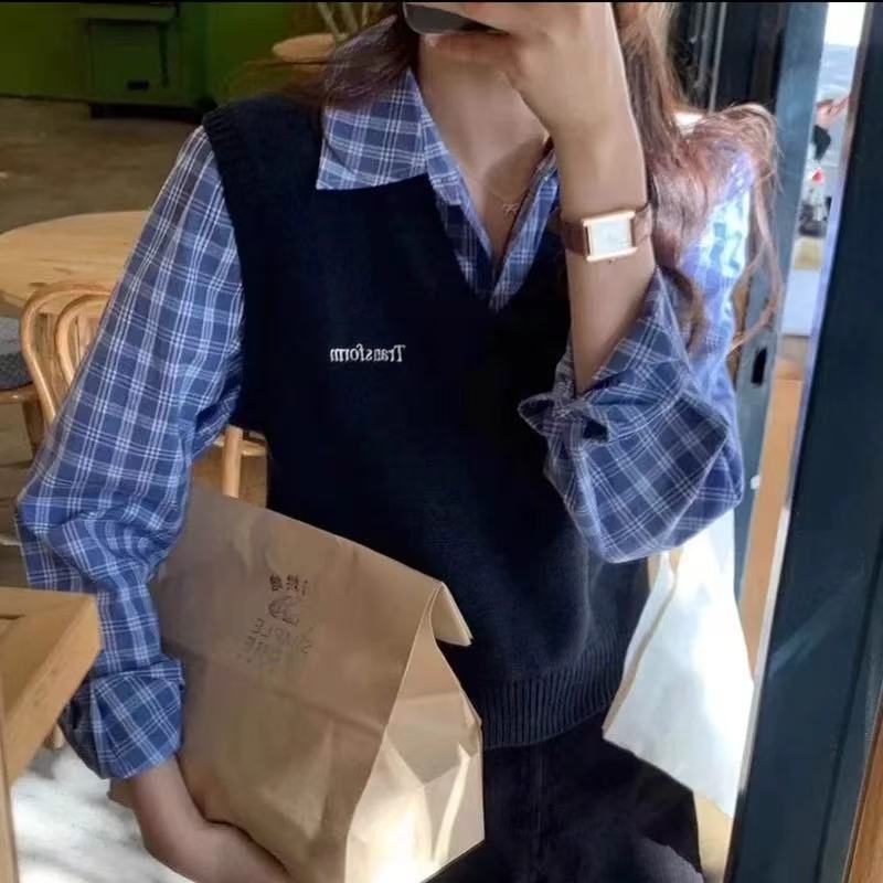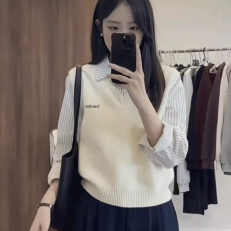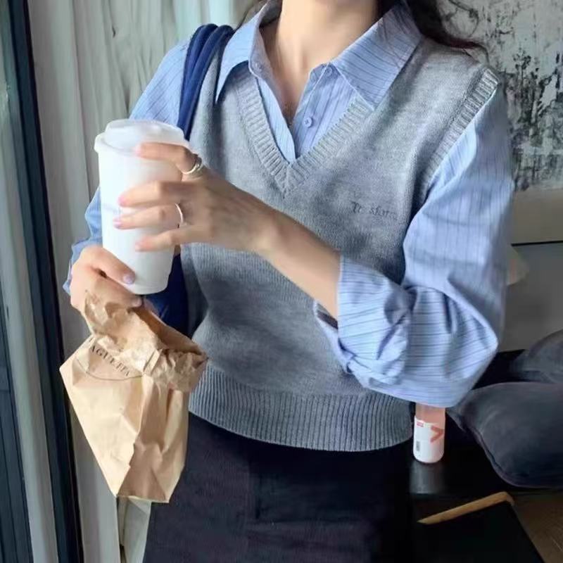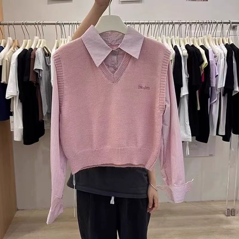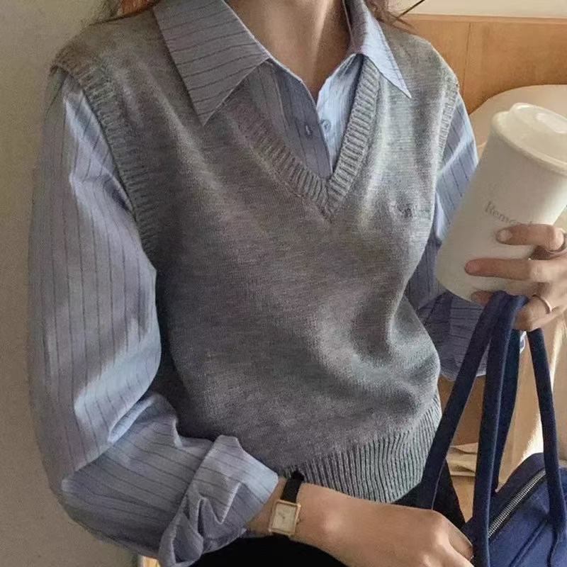 韩系学院风灰色毛衣减龄假两件拼接衬衫袖针织衫短款衬衫领上衣潮