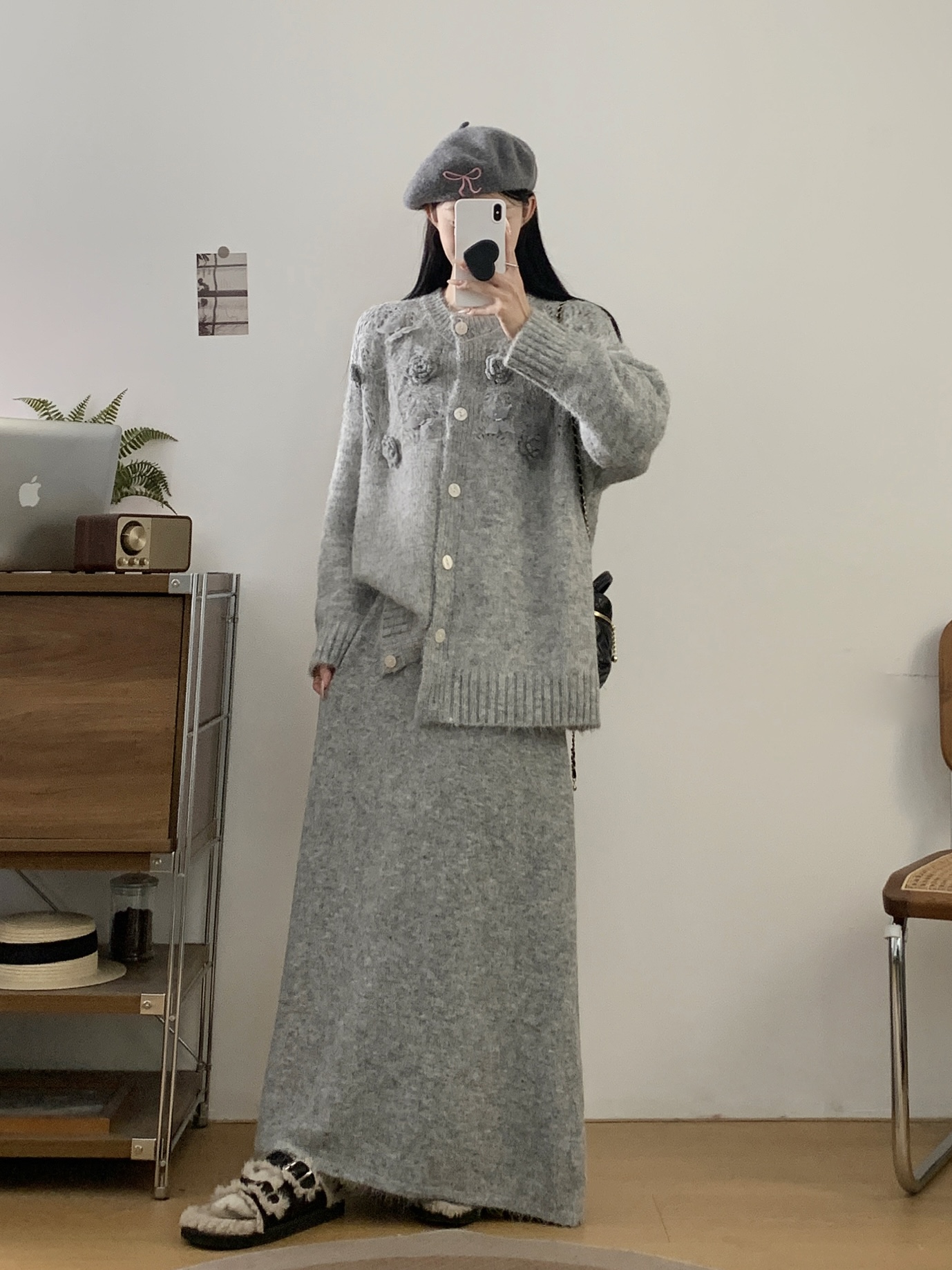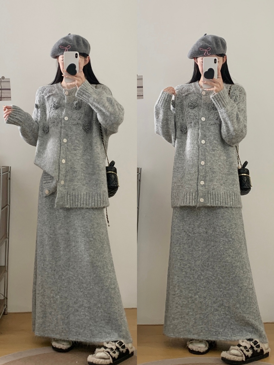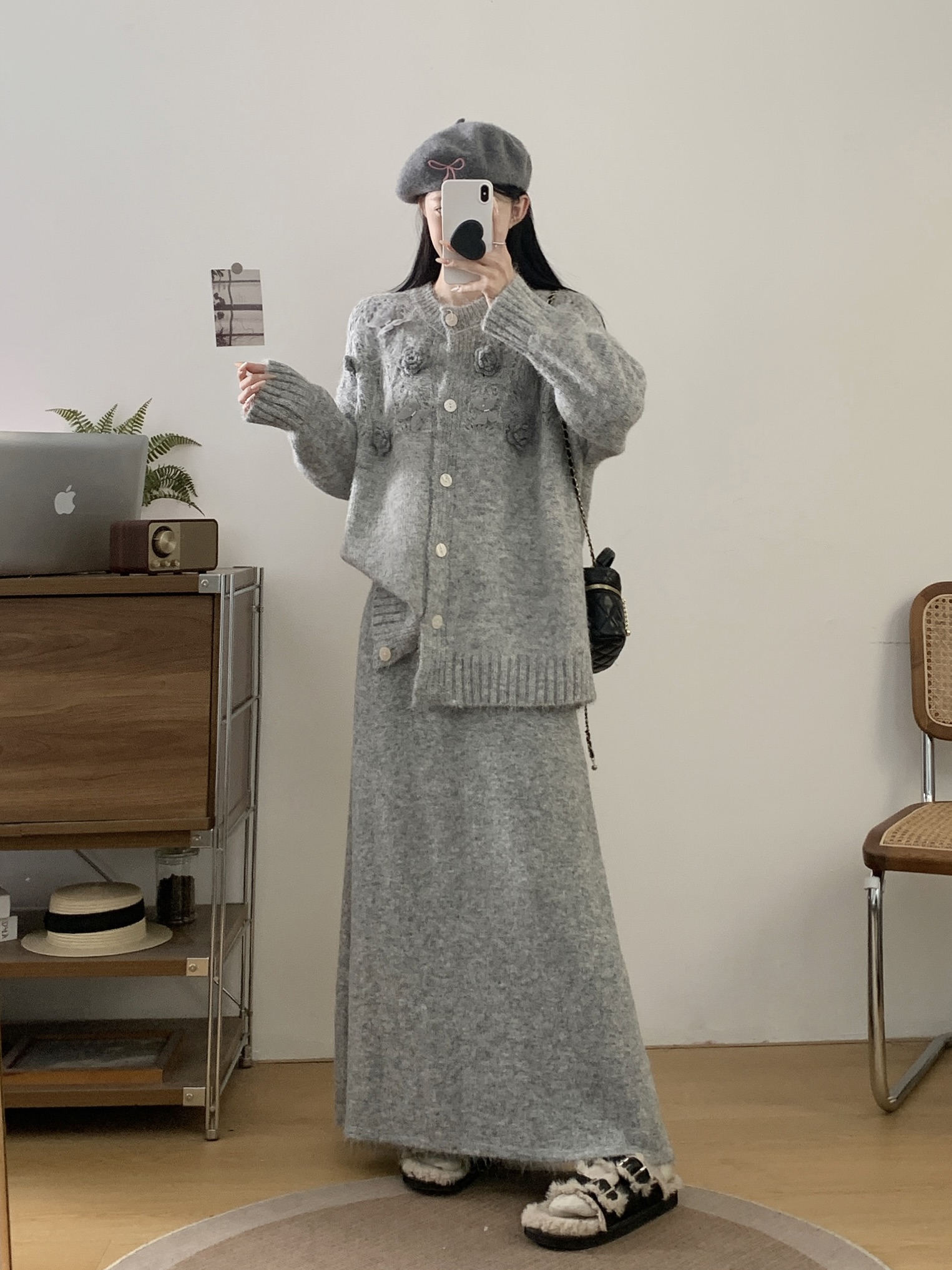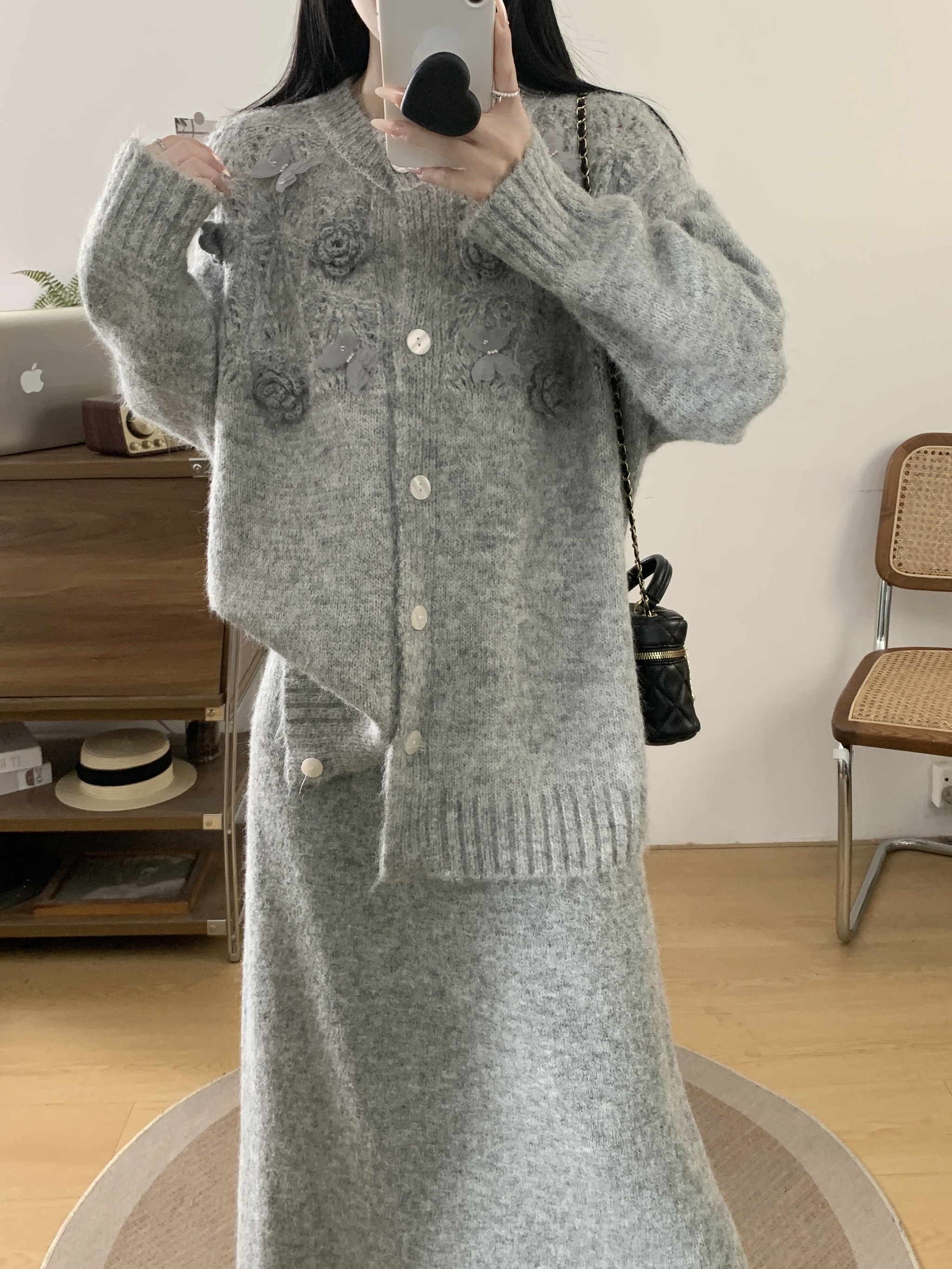 实拍大码秋冬法式温柔风立体花朵高级感针织开衫毛衣+半身裙套装