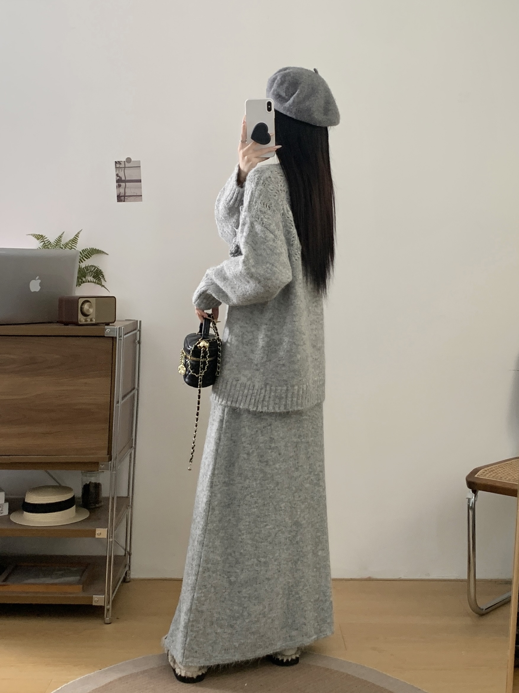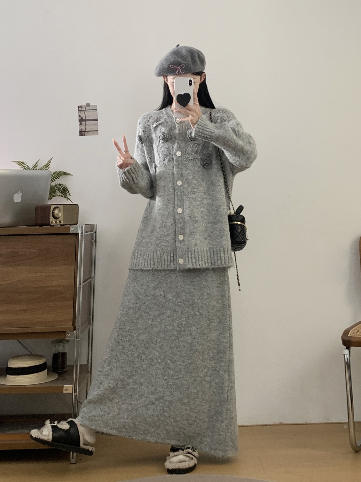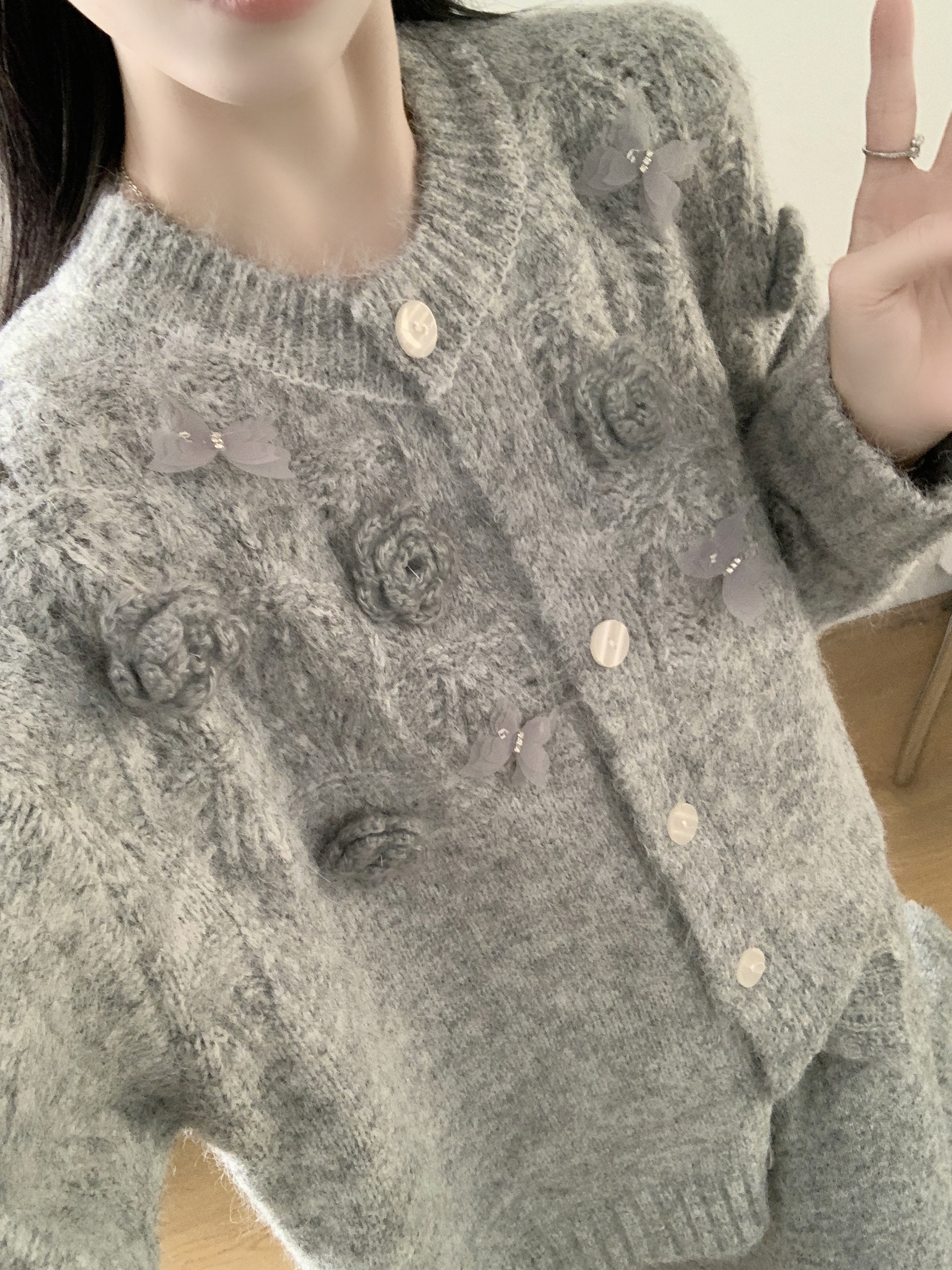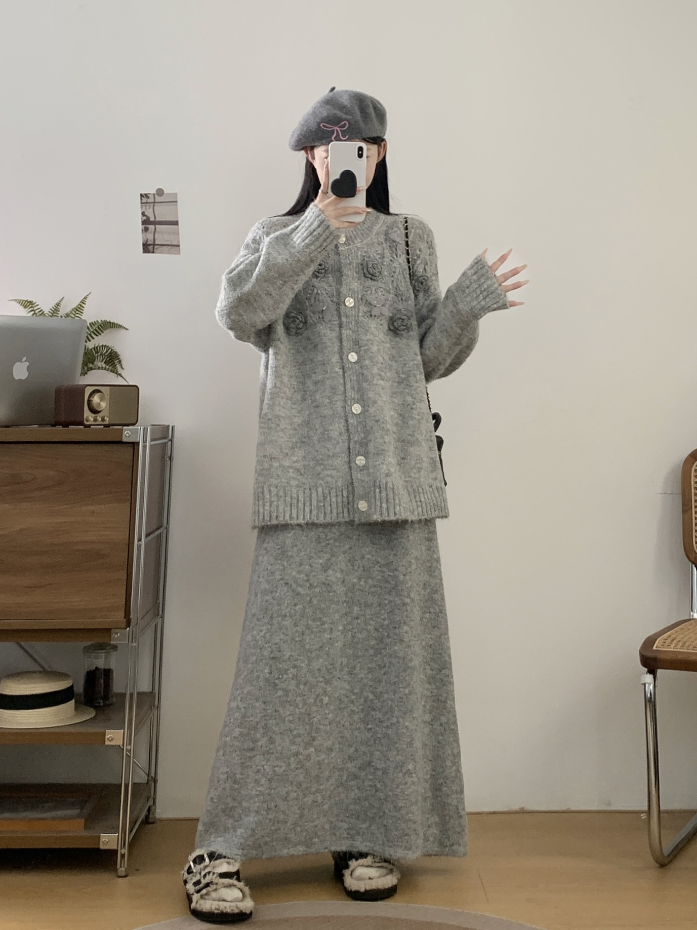 实拍大码秋冬法式温柔风立体花朵高级感针织开衫毛衣+半身裙套装