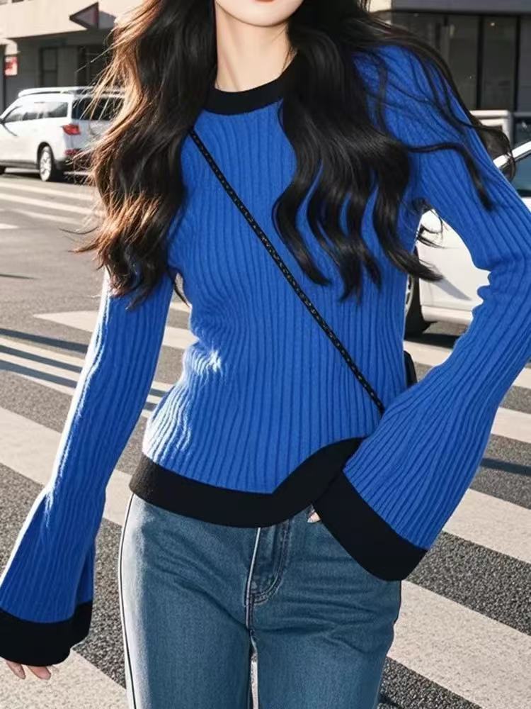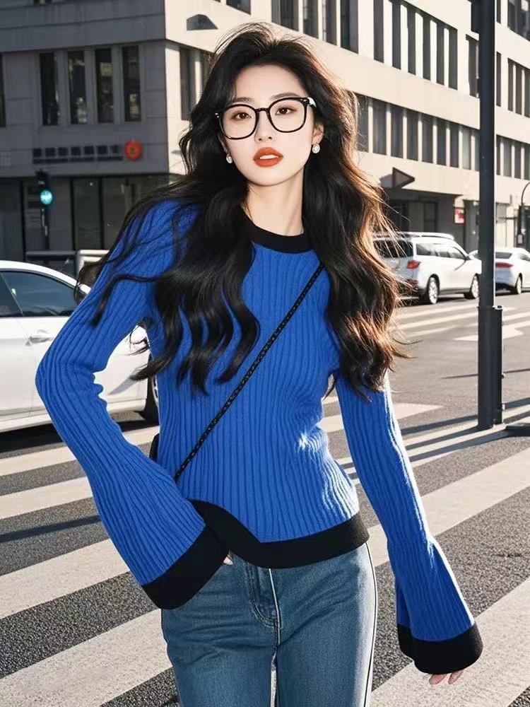 蓝色套头毛衣针织衫女秋冬高级感气质修身撞色内搭上衣