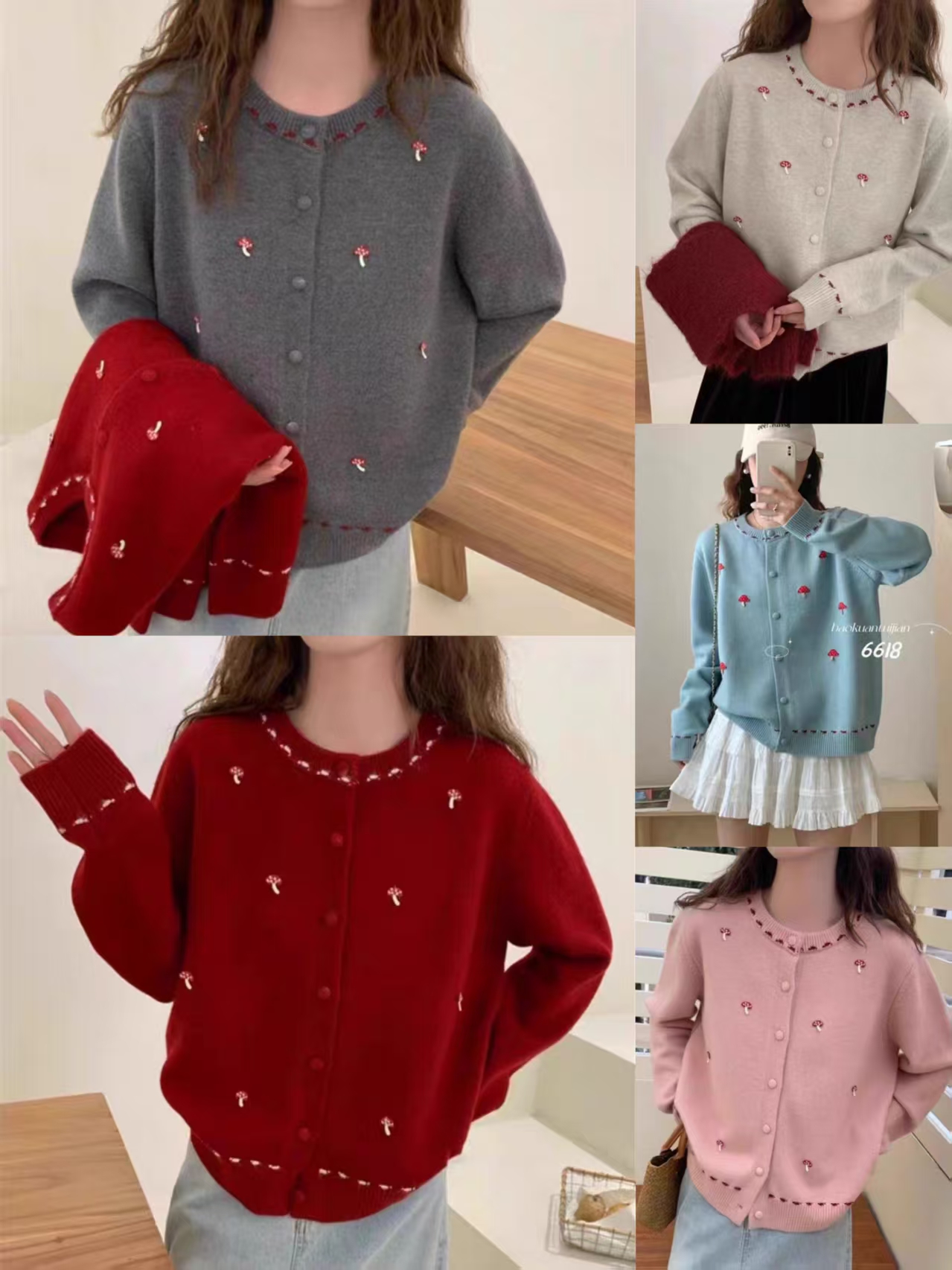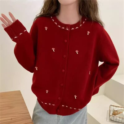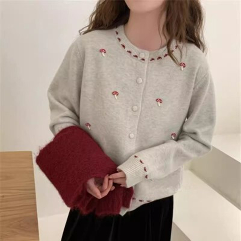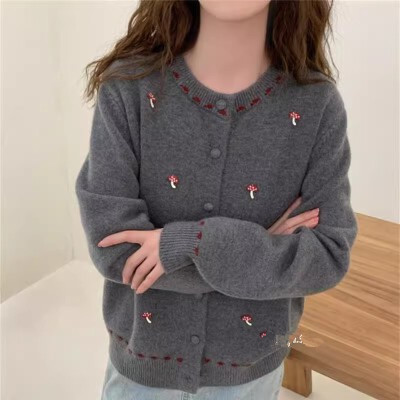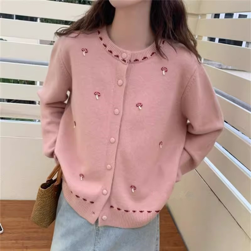 韩系温柔风甜美刺绣蘑菇圆领针织开衫女2025新款宽松显瘦毛衣外套