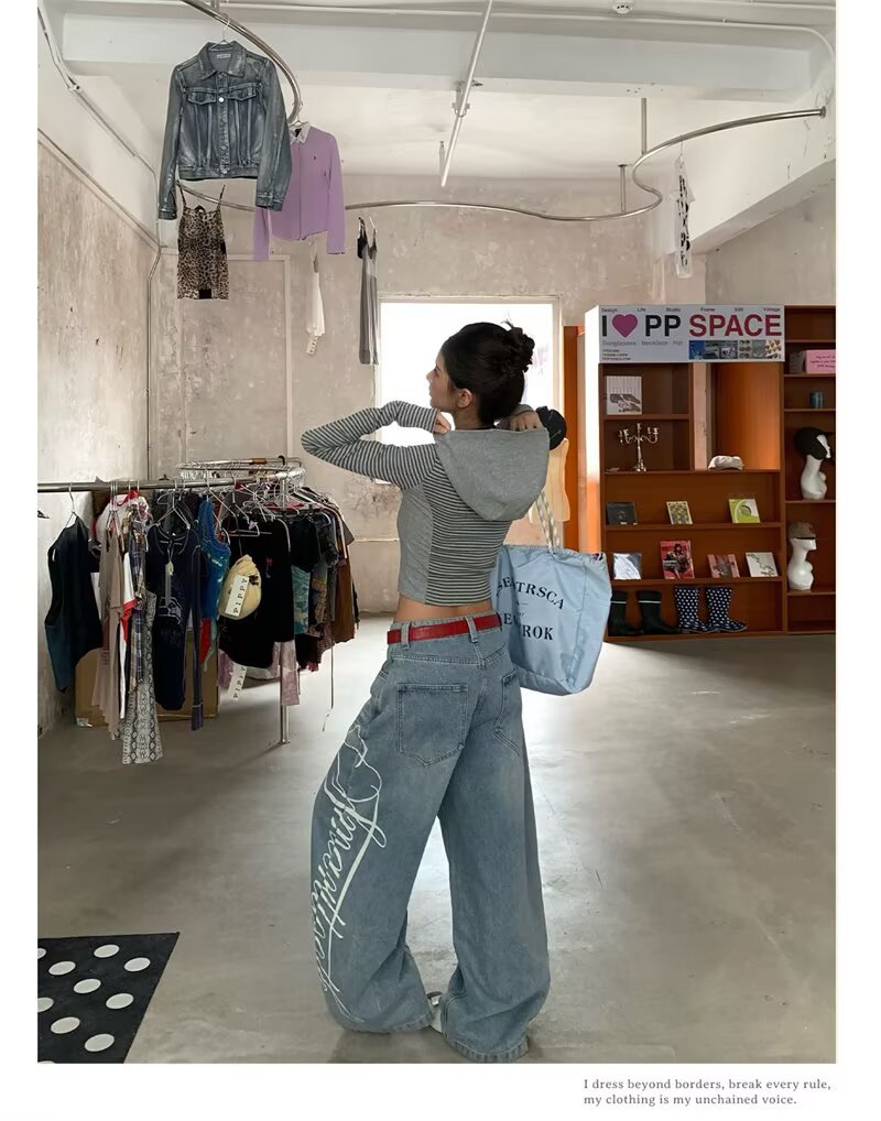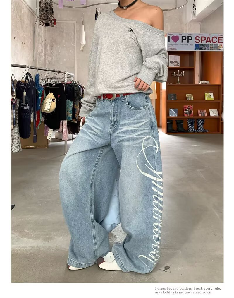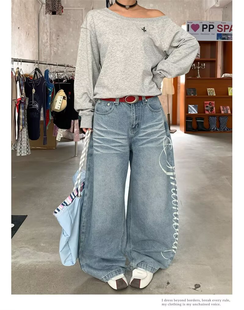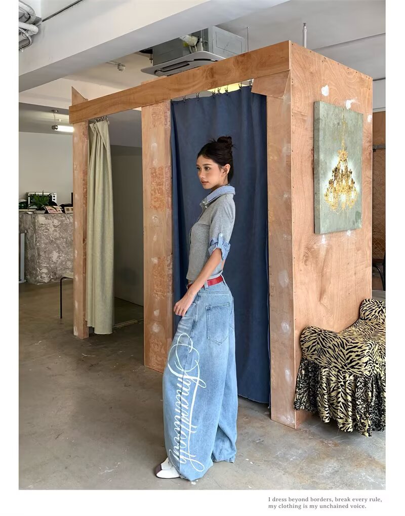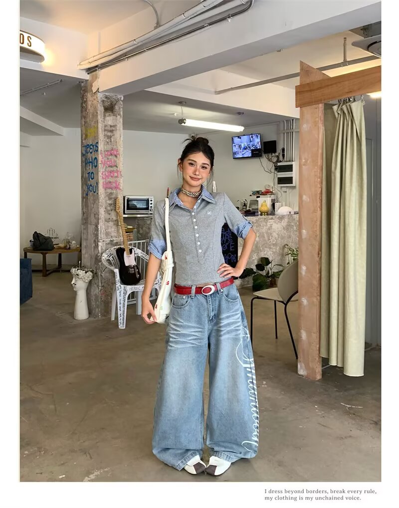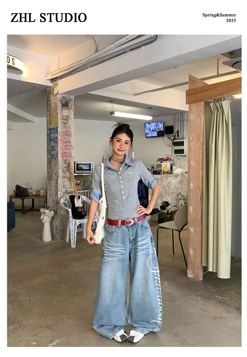蕾丝花边牛仔裤女夏季新款浅色阔腿直筒裤垂感拖地裤斜腰设计感潮