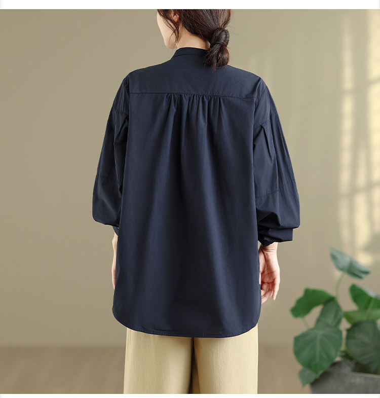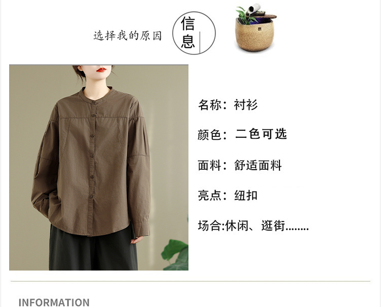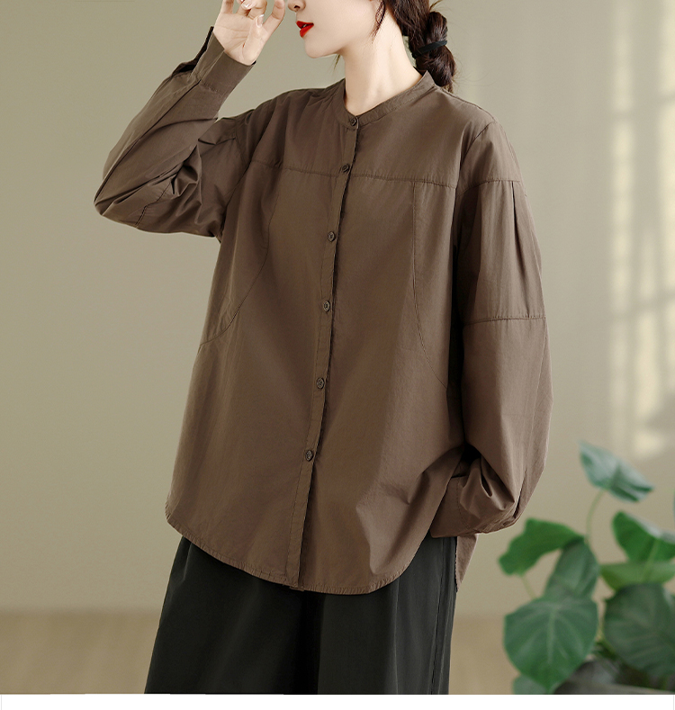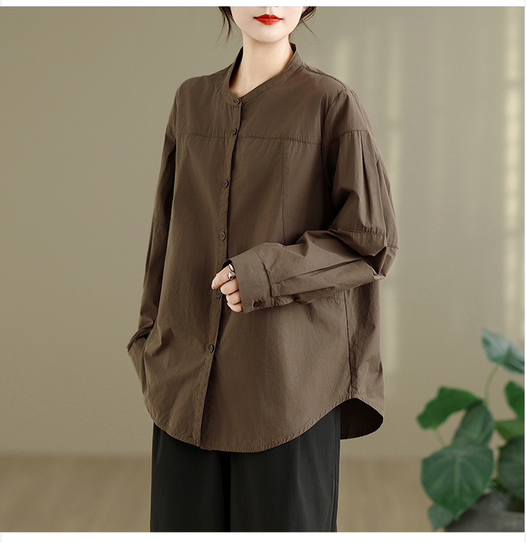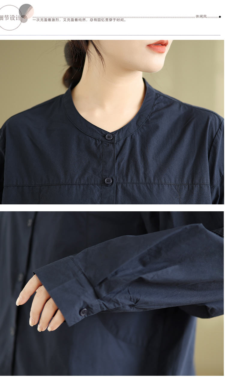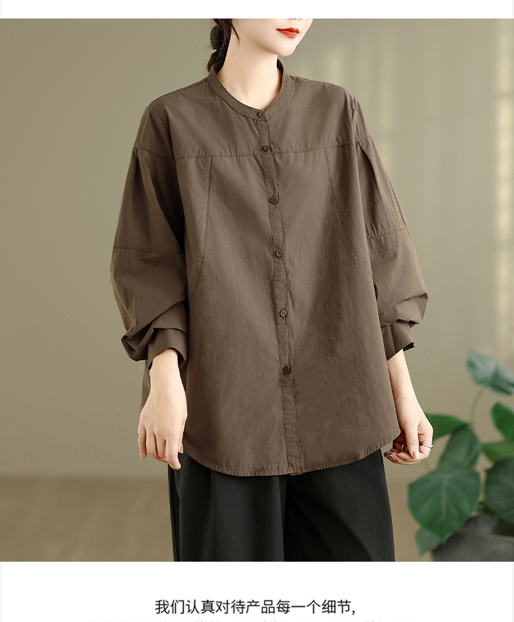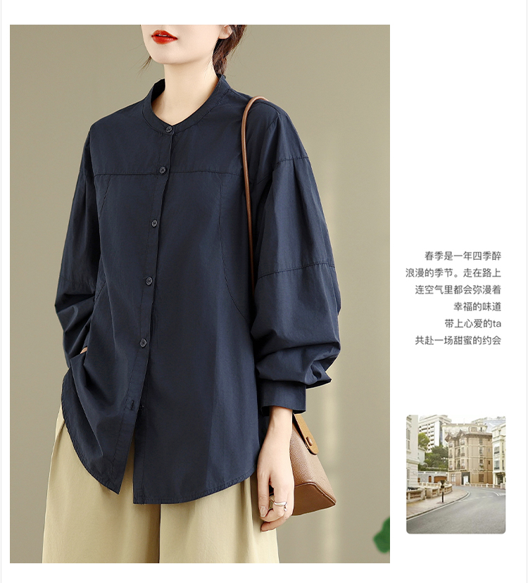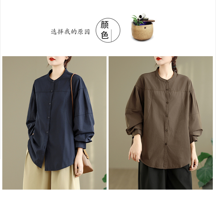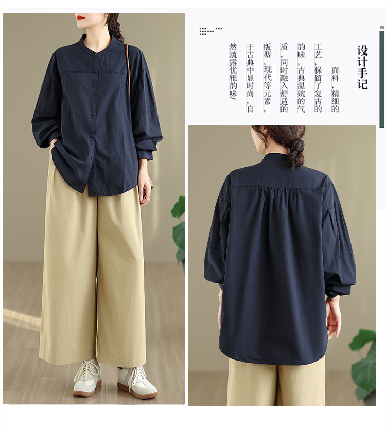 实拍春秋复古100%棉廓形衬衫女气质立领长袖衬衣单排扣纯色上衣