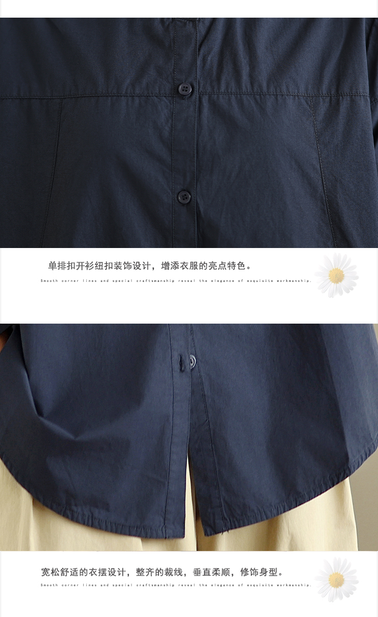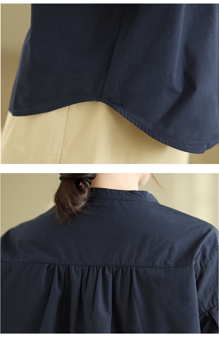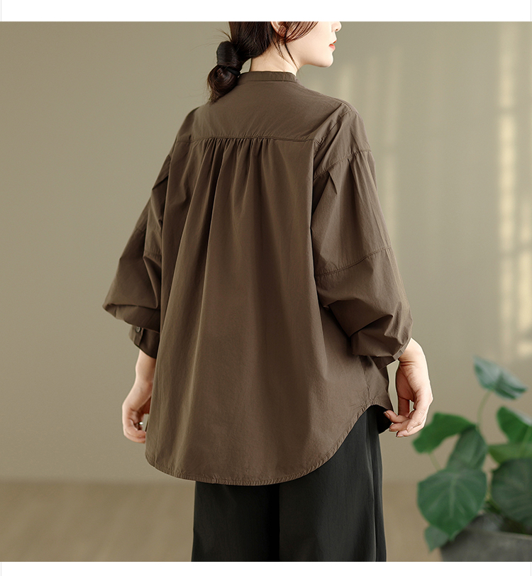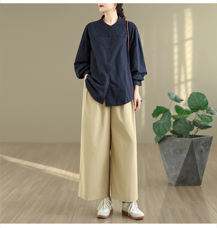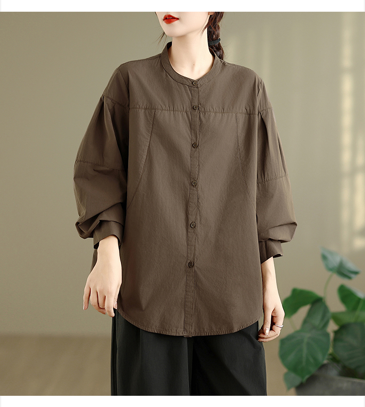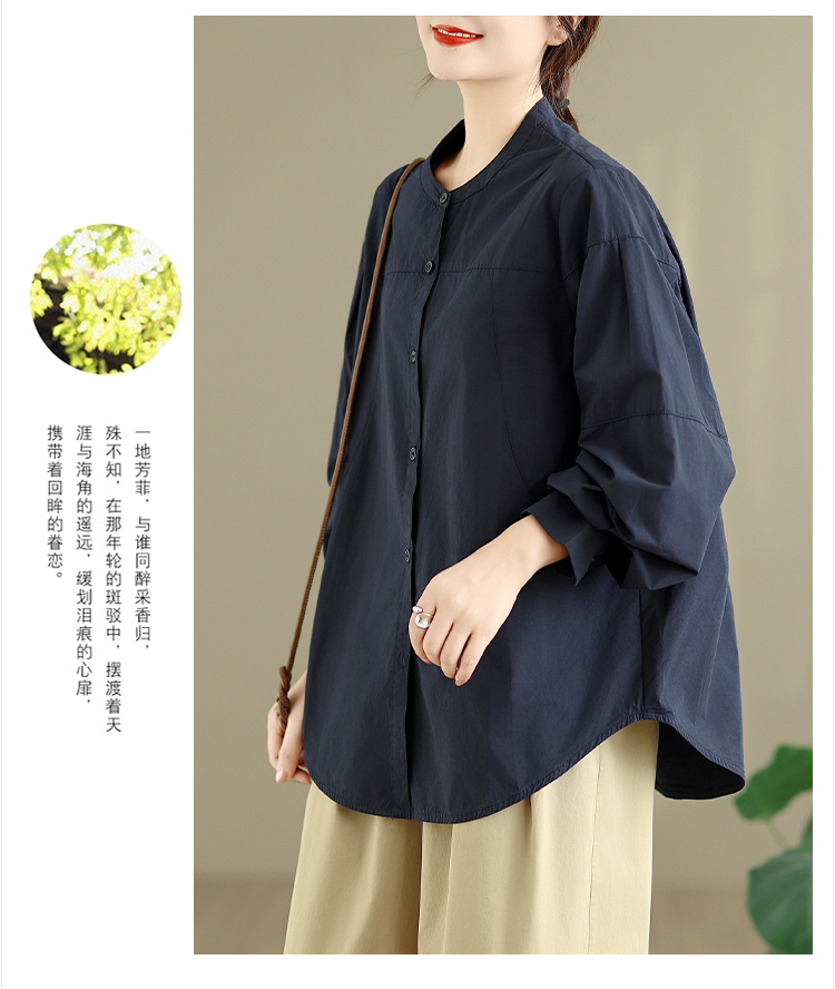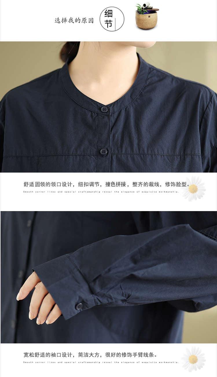 实拍春秋复古100%棉廓形衬衫女气质立领长袖衬衣单排扣纯色上衣