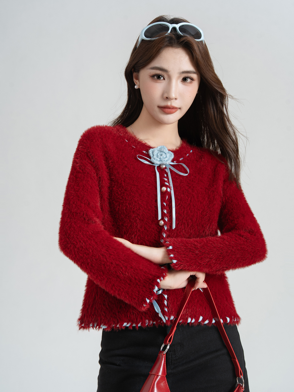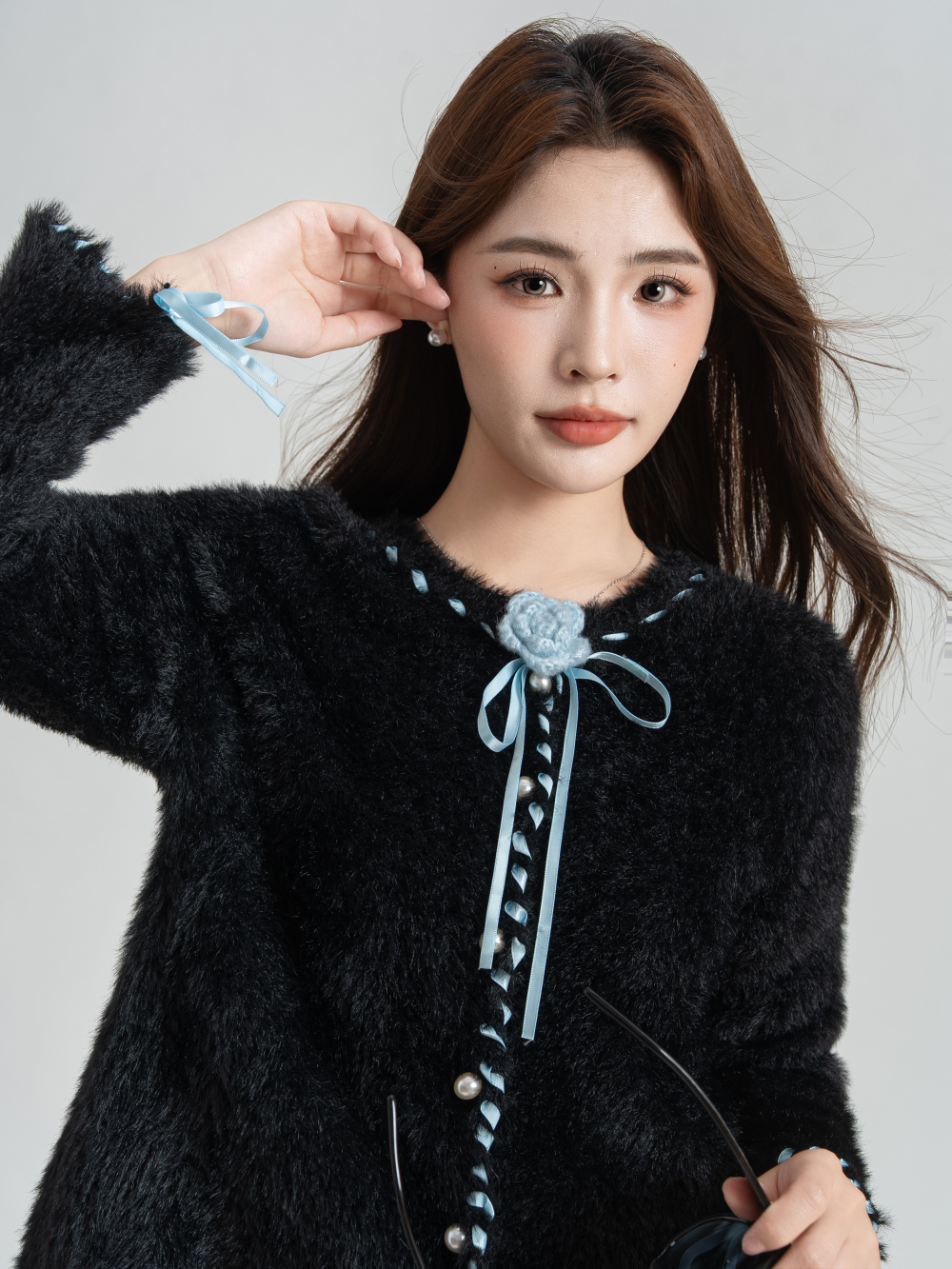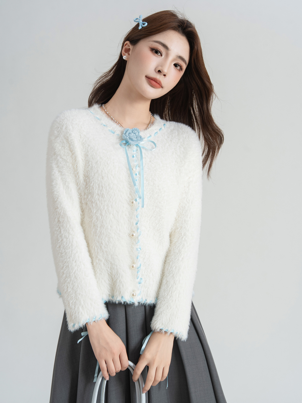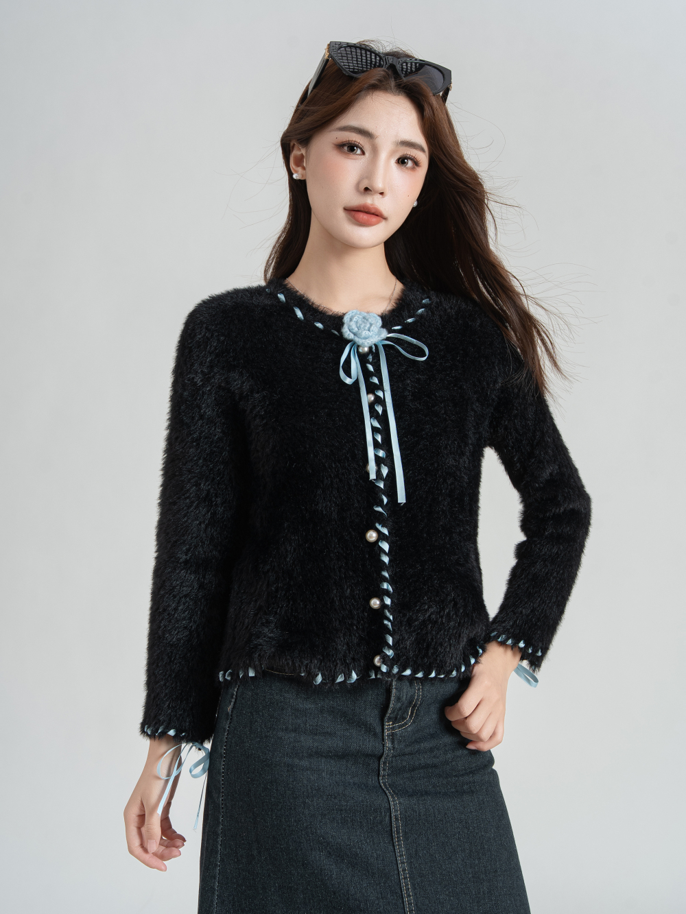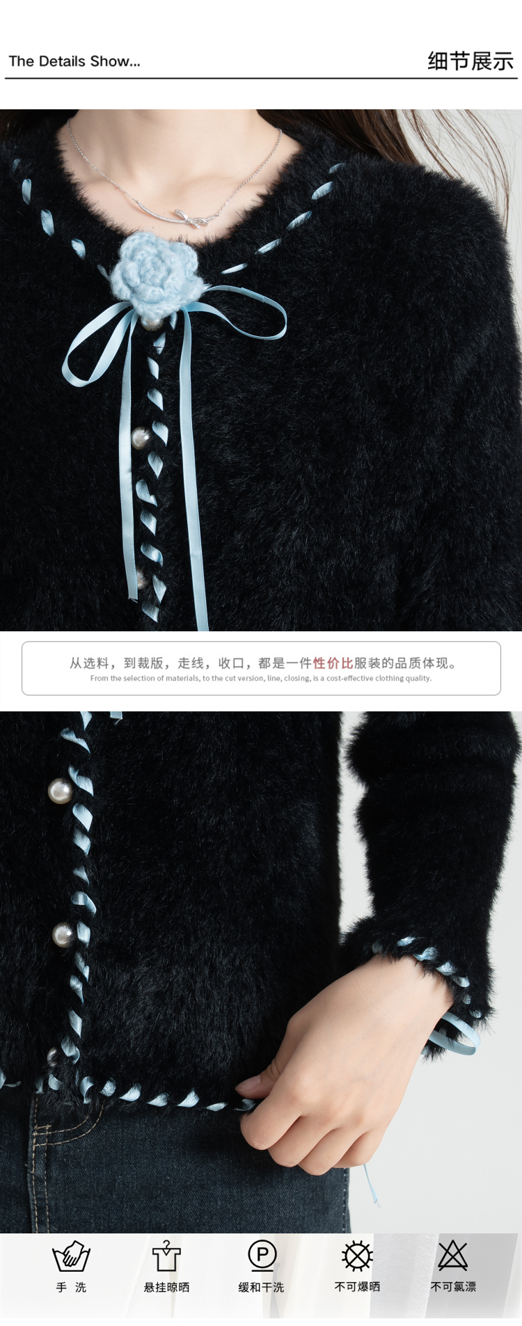 实拍 珍珠扣仿水貂绒针织开衫女甜美软糯风立体花朵小香风毛衣