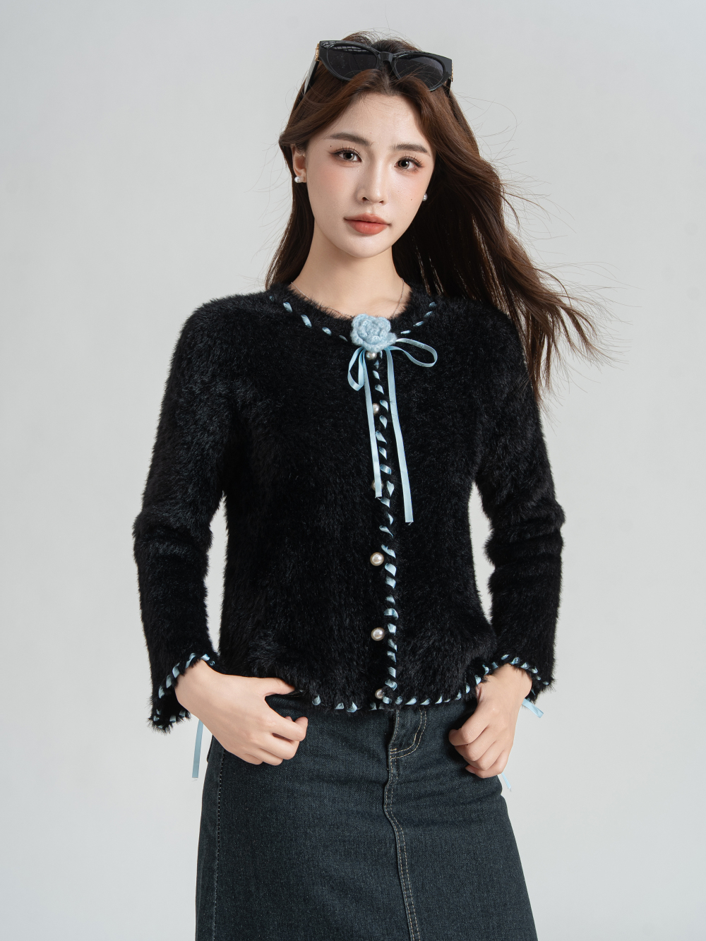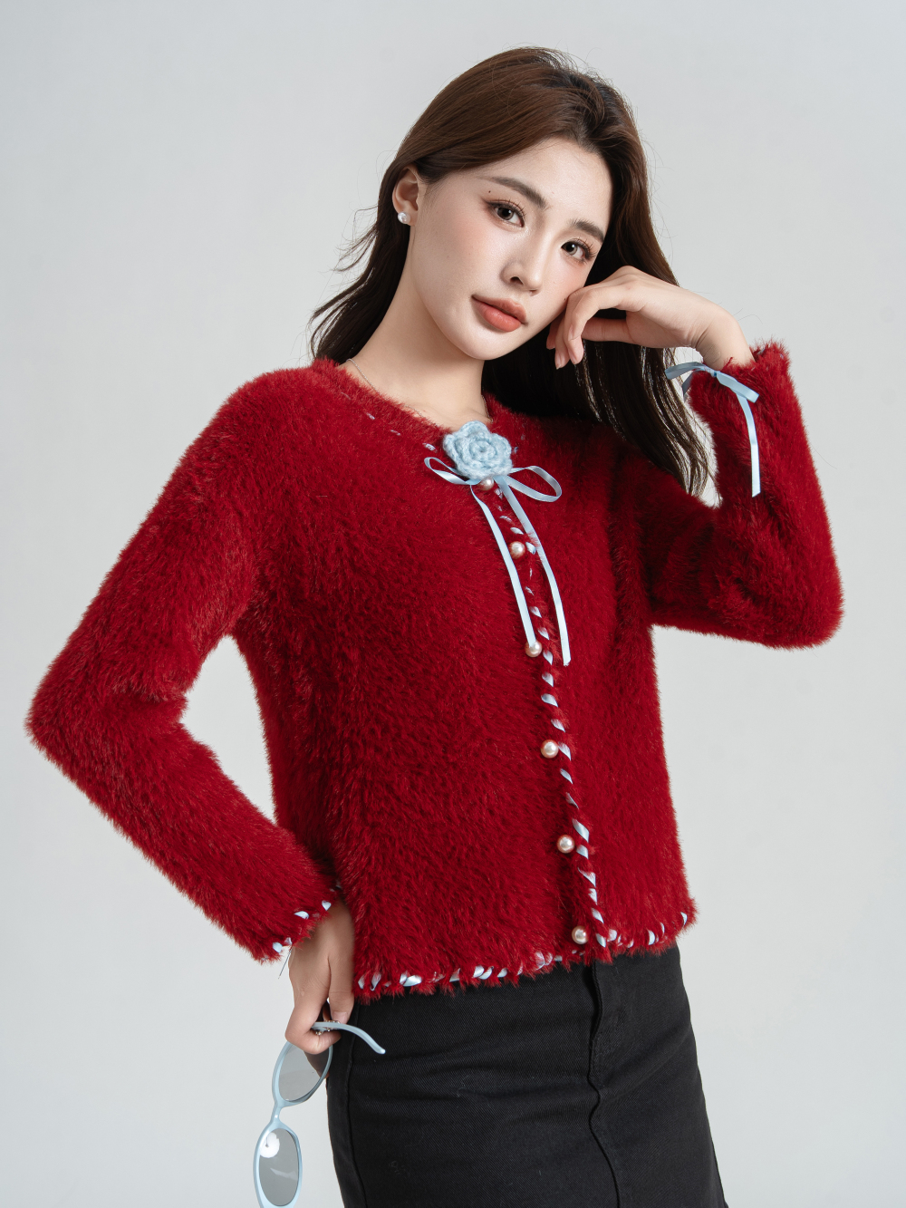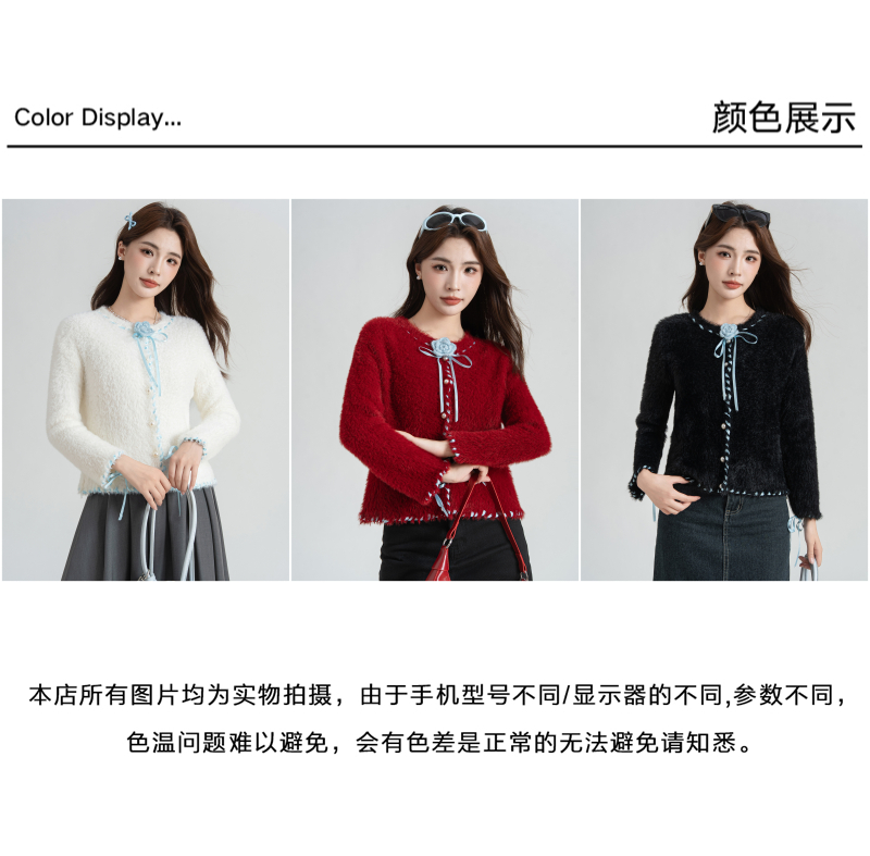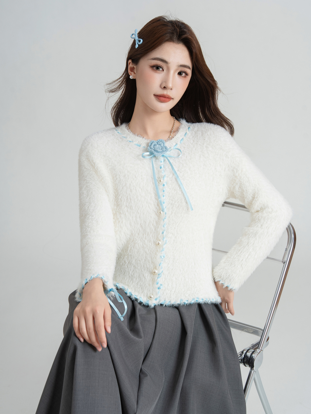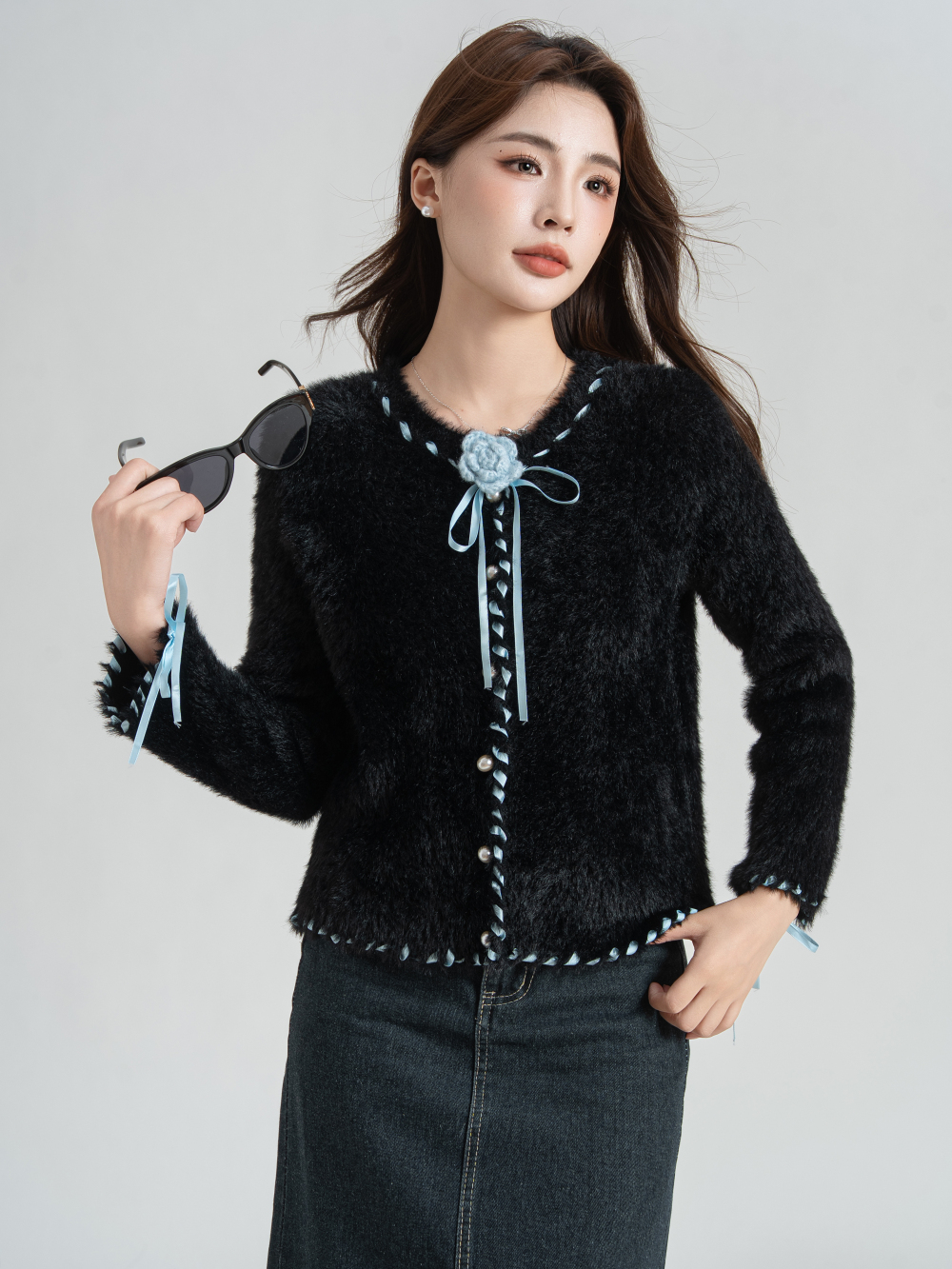 实拍 珍珠扣仿水貂绒针织开衫女甜美软糯风立体花朵小香风毛衣