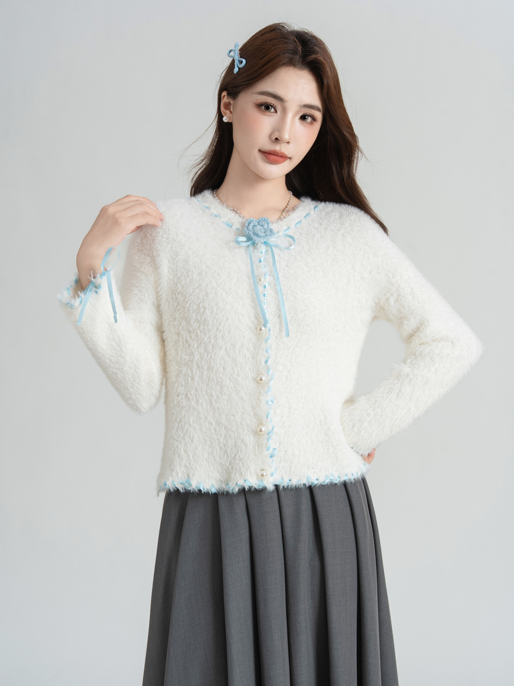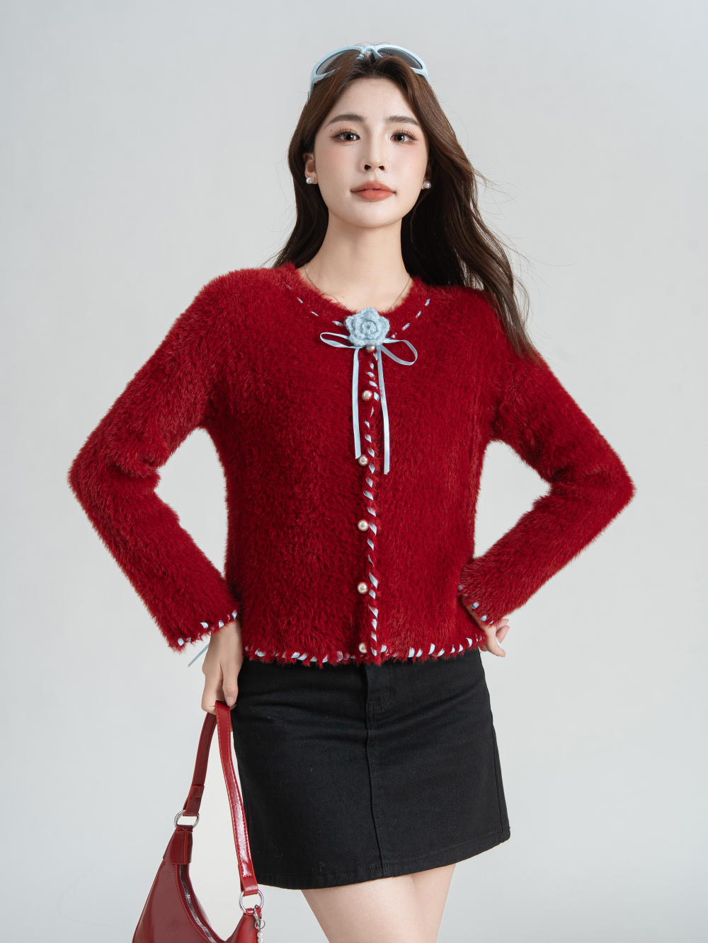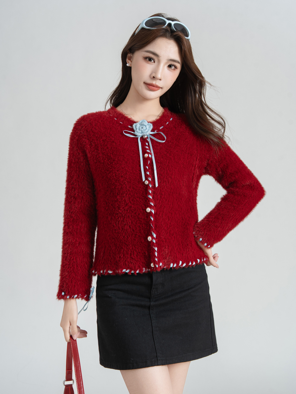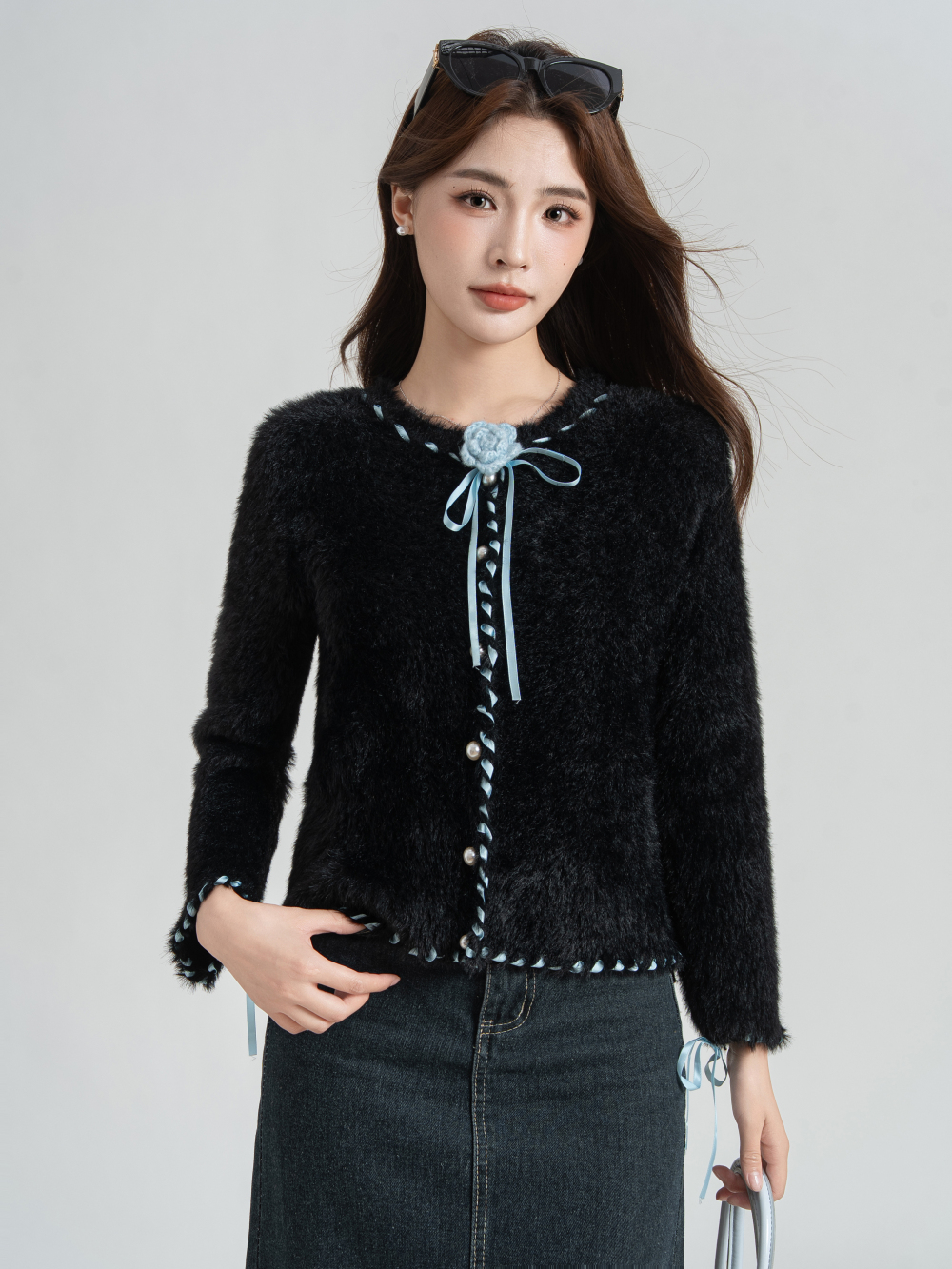 实拍 珍珠扣仿水貂绒针织开衫女甜美软糯风立体花朵小香风毛衣