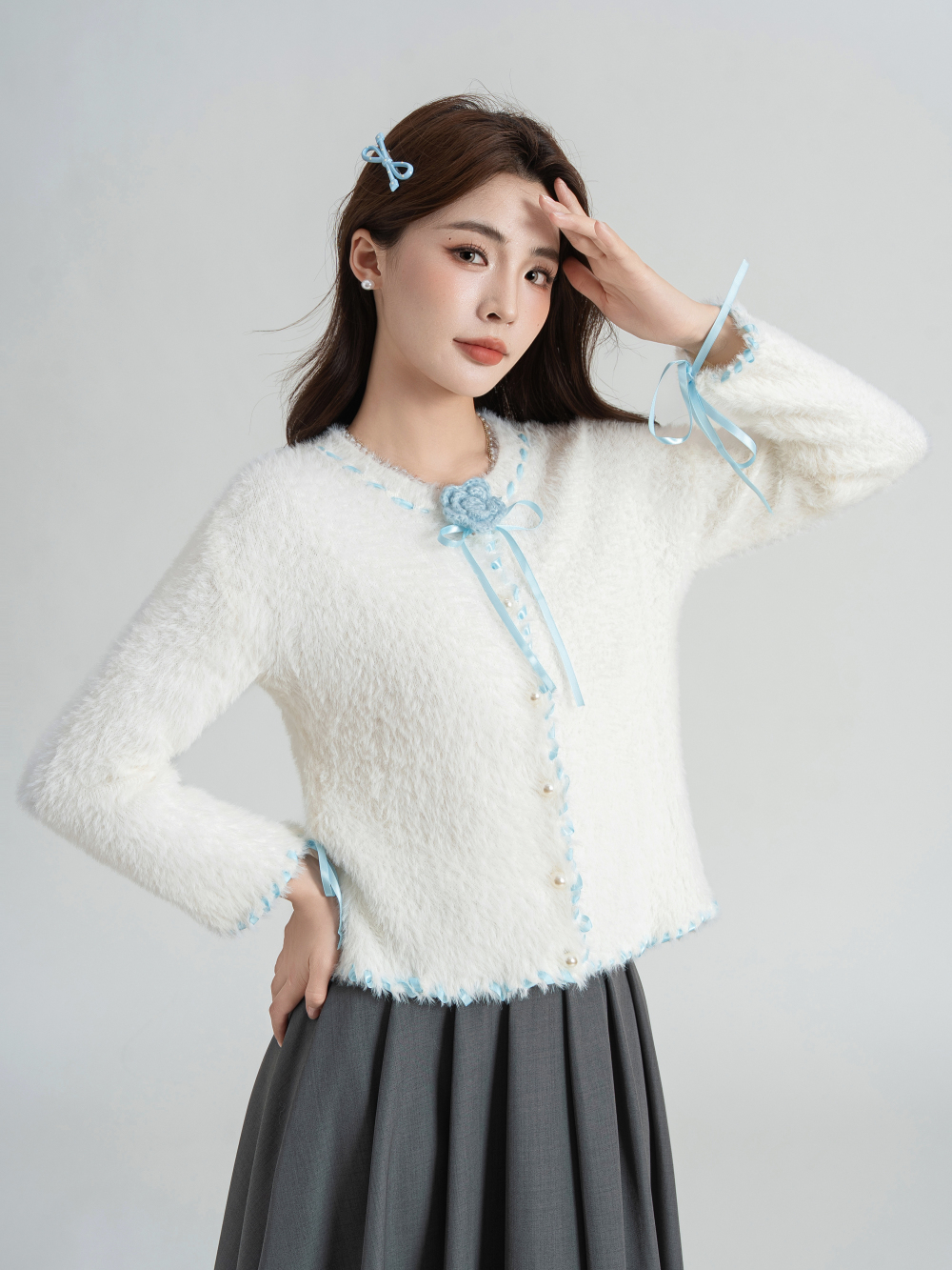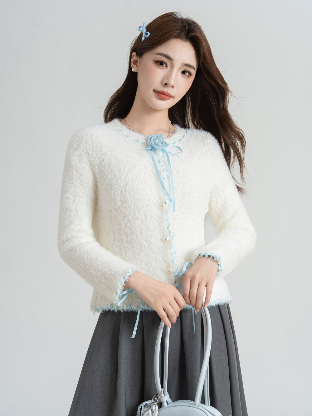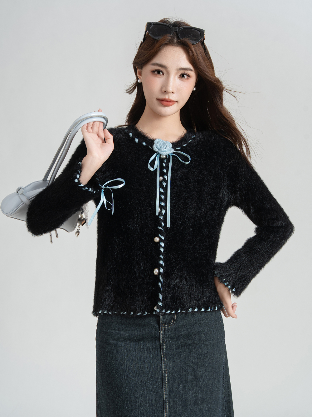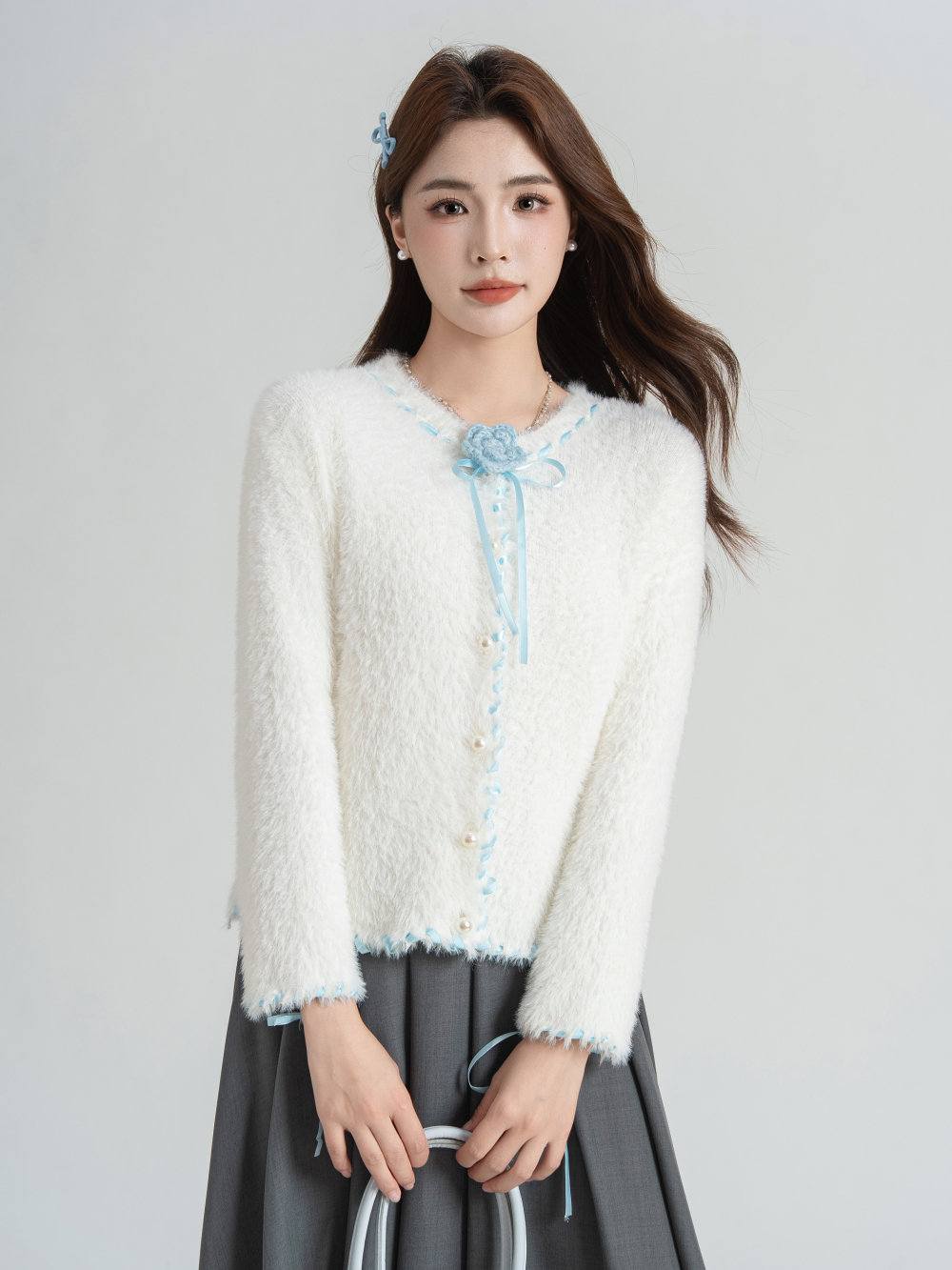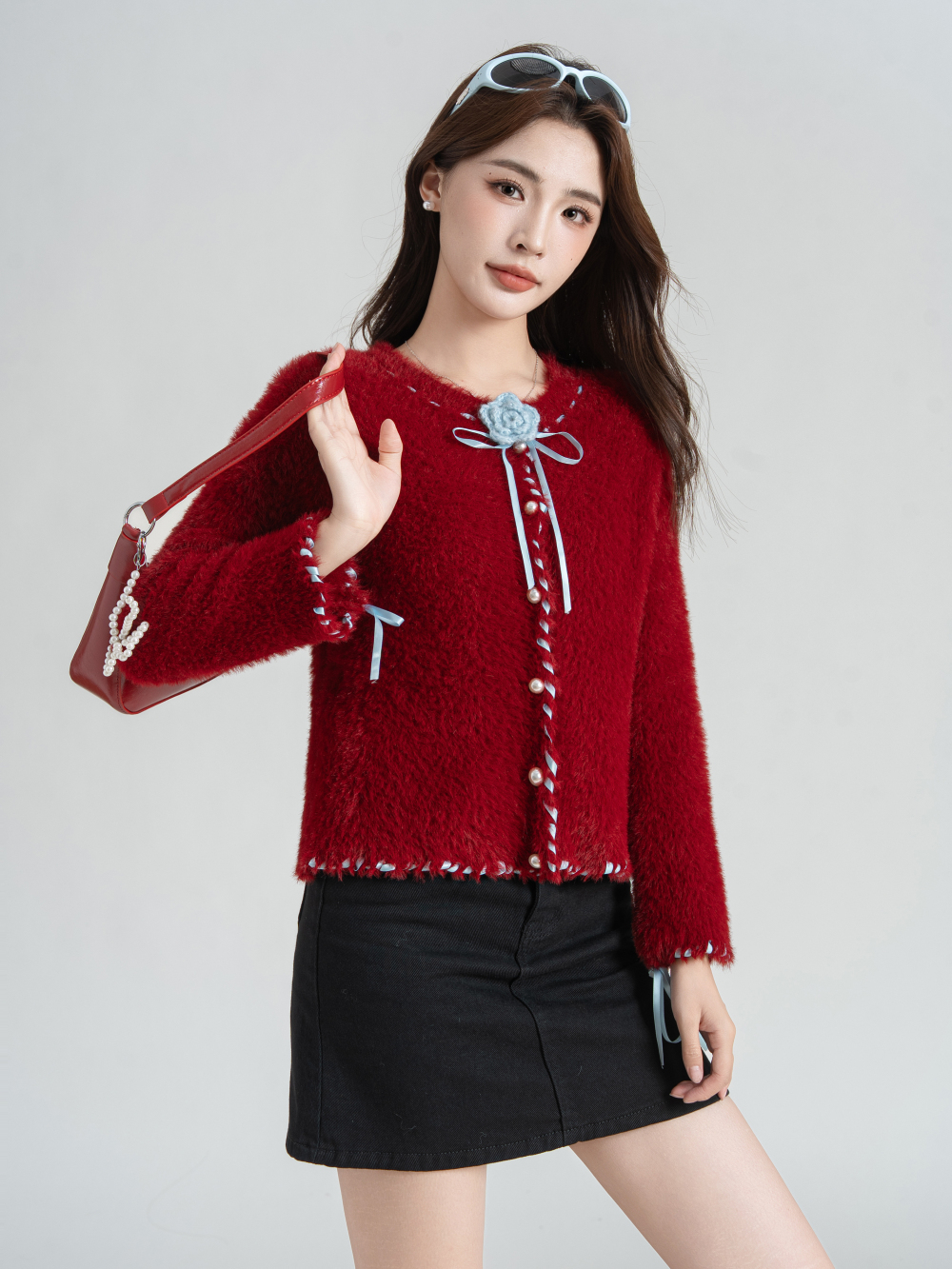 实拍 珍珠扣仿水貂绒针织开衫女甜美软糯风立体花朵小香风毛衣